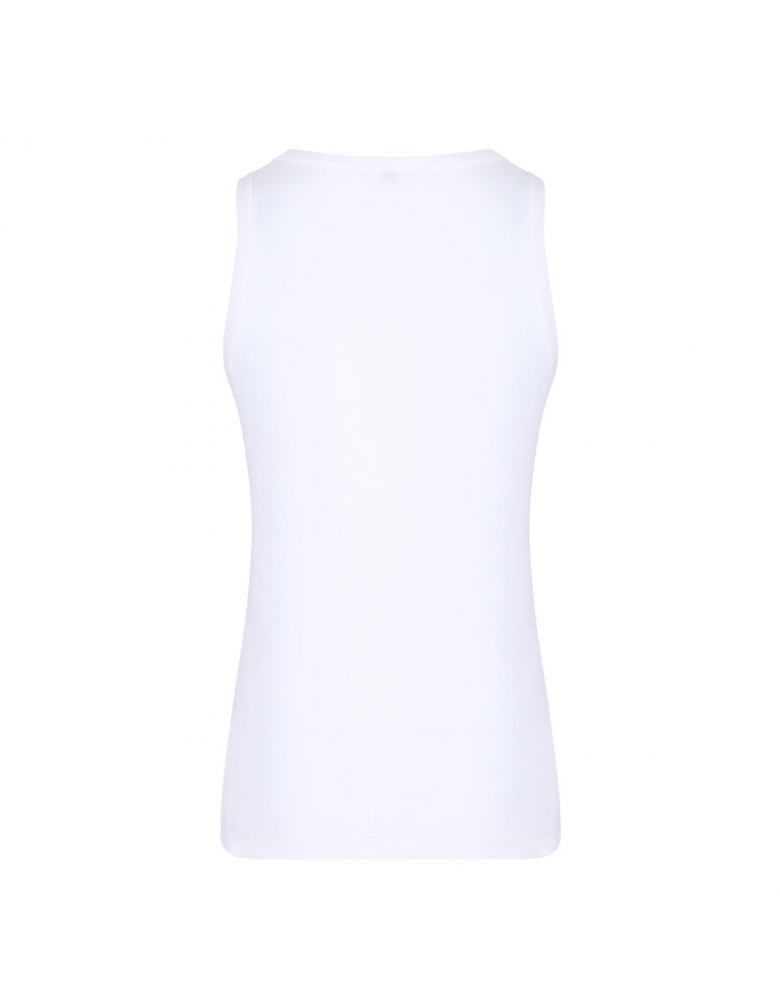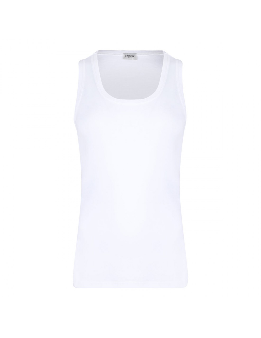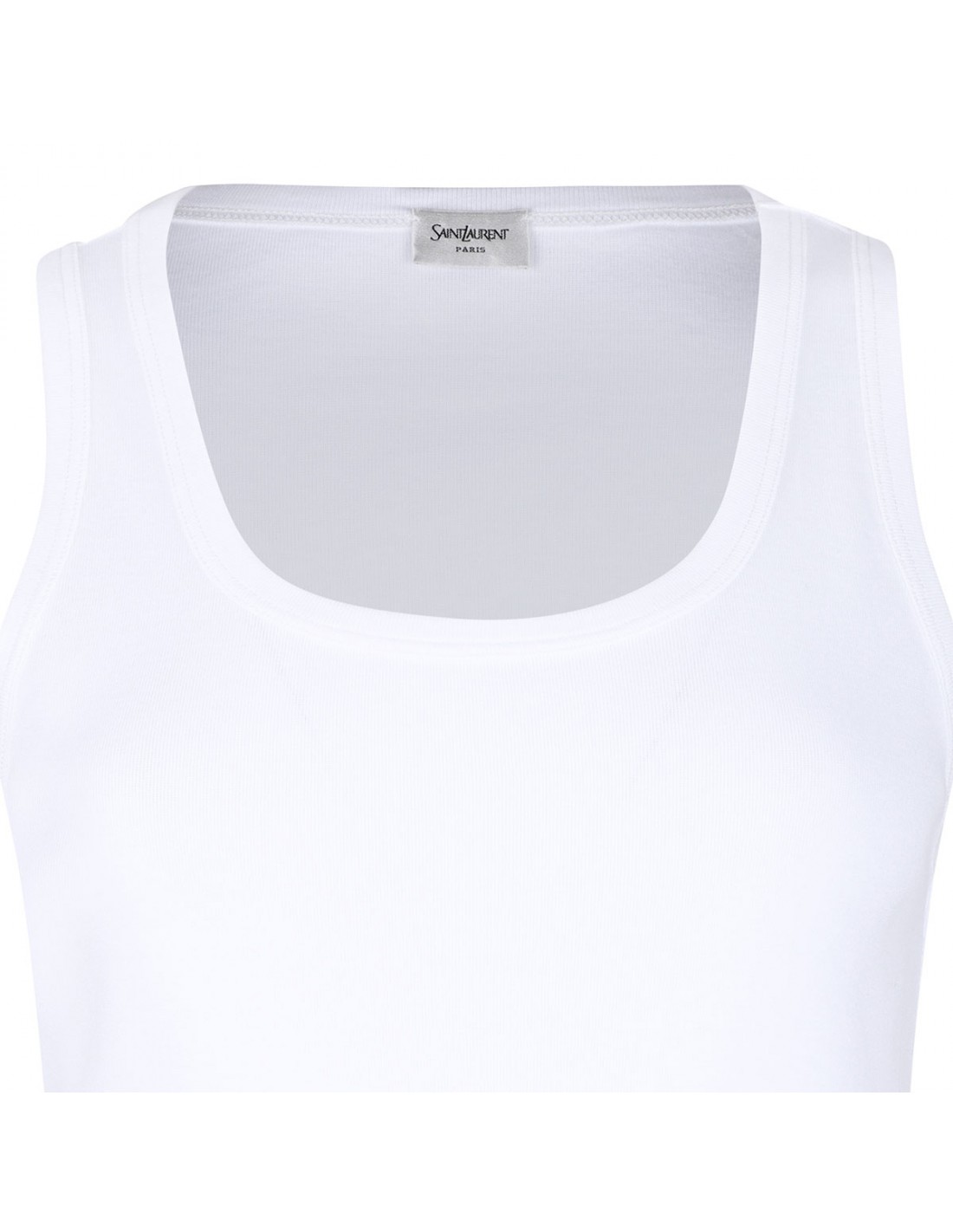 White semi-sheer certified cotton tank top from Saint Laurent featuring round scoop neck, Cassandre embroidery on hem, sleeveless style.