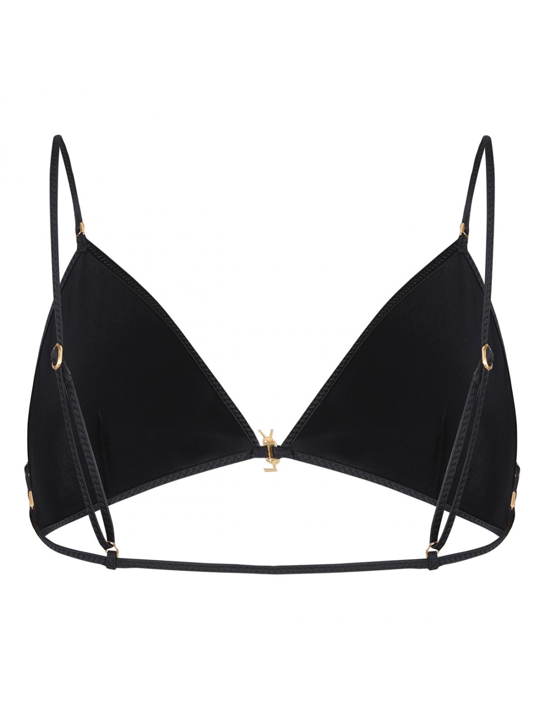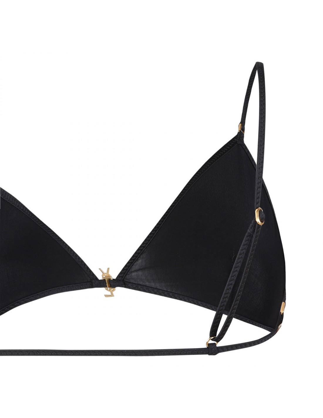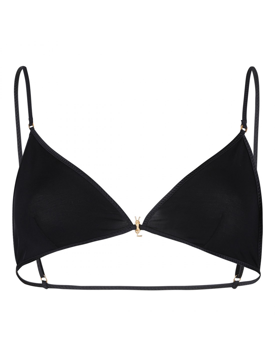 Black stretch viscose bra from Saint Laurent featuring antiqued gold-tone Cassandre decoration, triangle cups, adjustable shoulder straps with cinch fastening, antiqued gold-tone hardware.