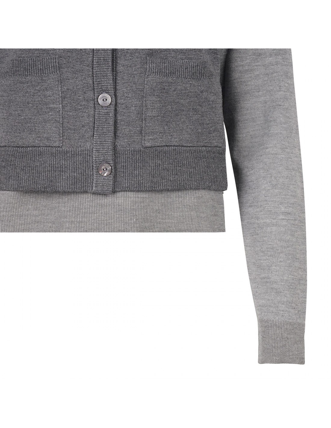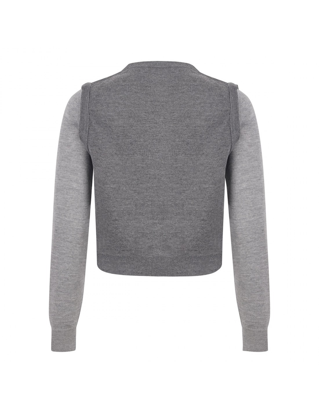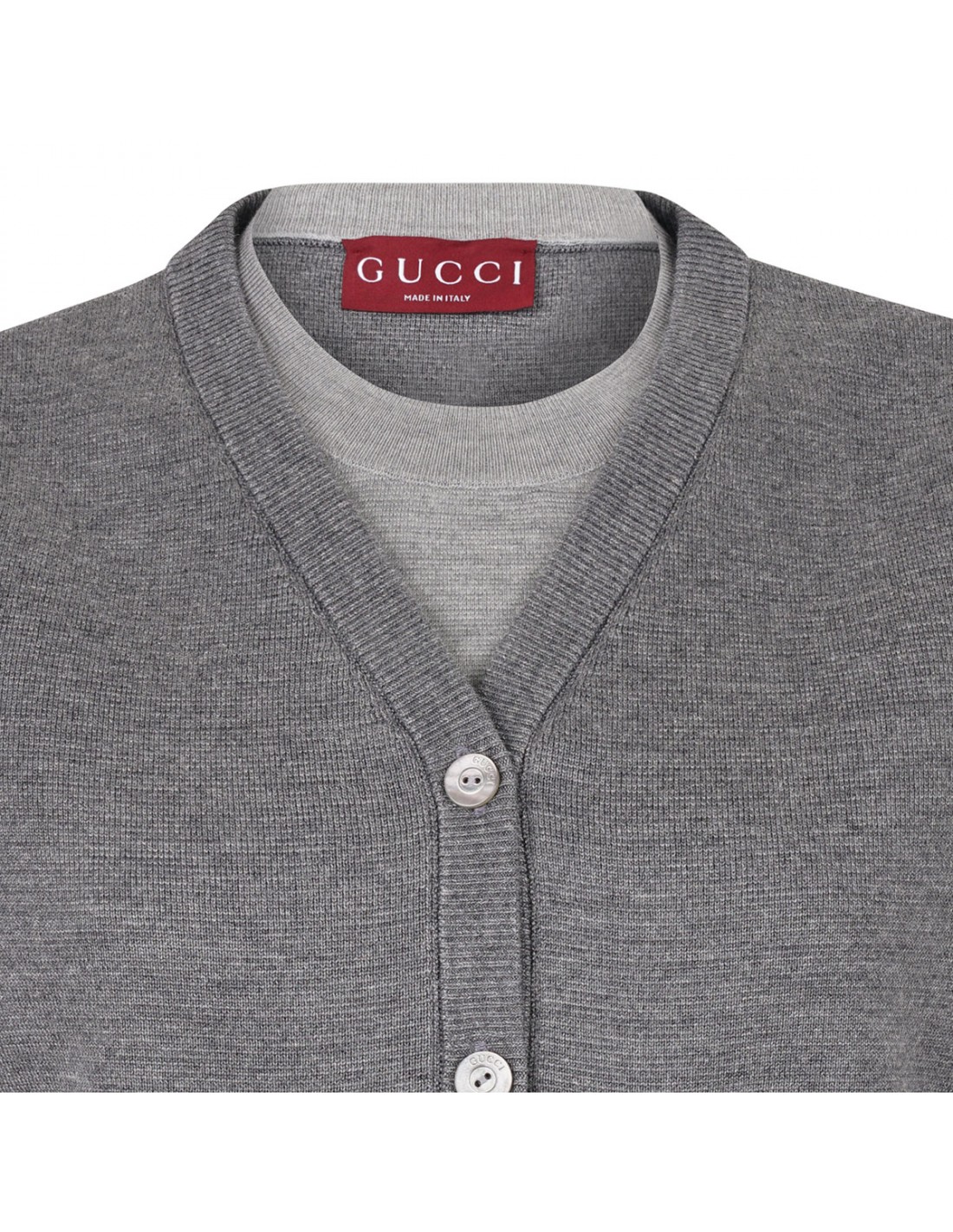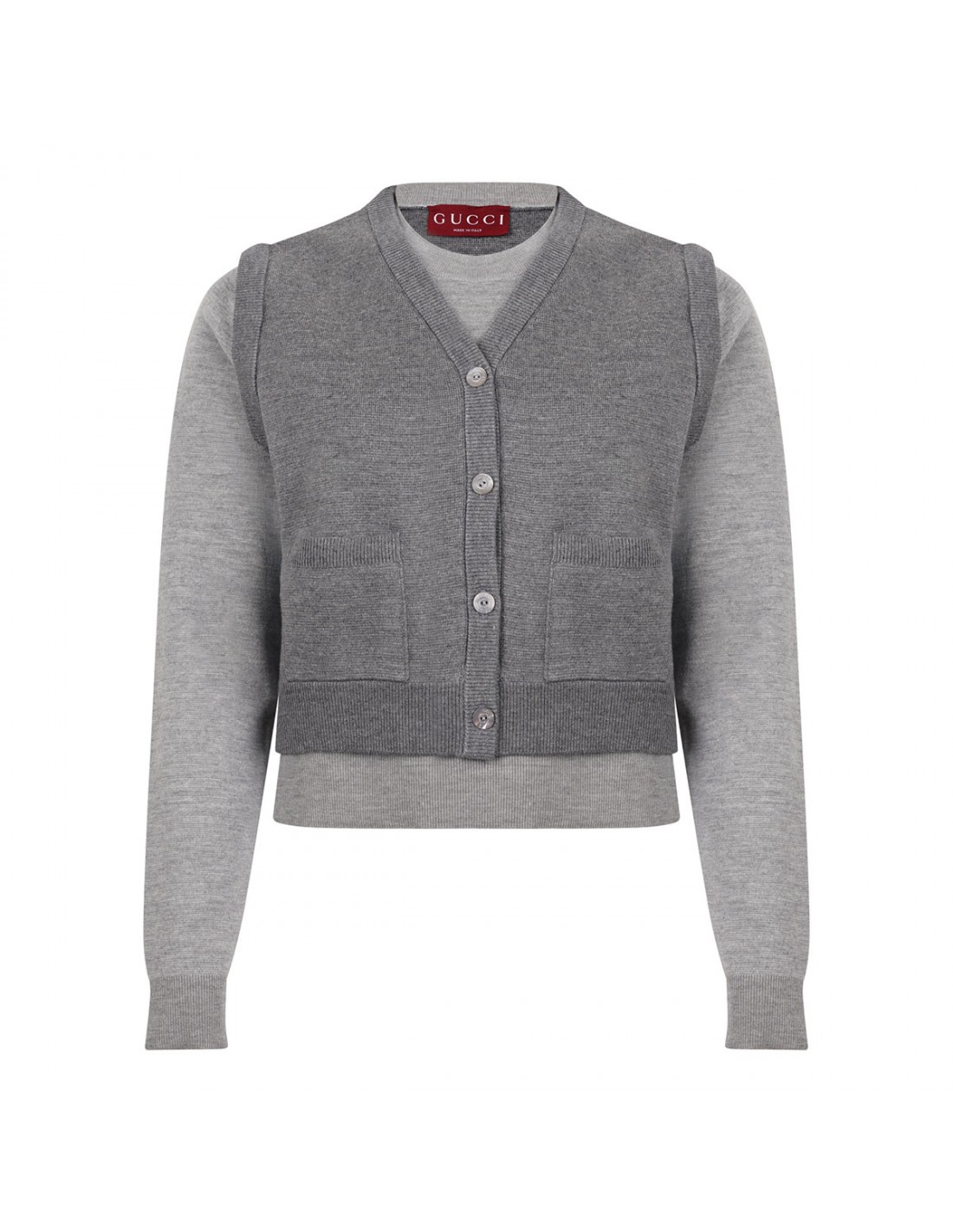 Light gray and gray wool silk top from Gucci featuring V-neck vest overlay, crewneck, two front pockets, button closure, rib trim, GG Rosso Ancora red lining on vest.
