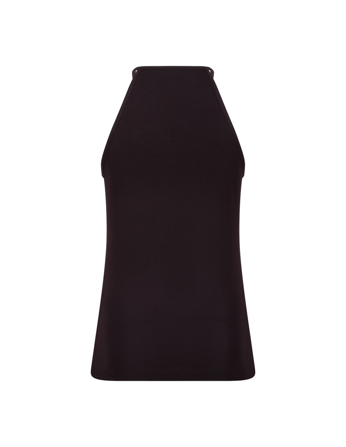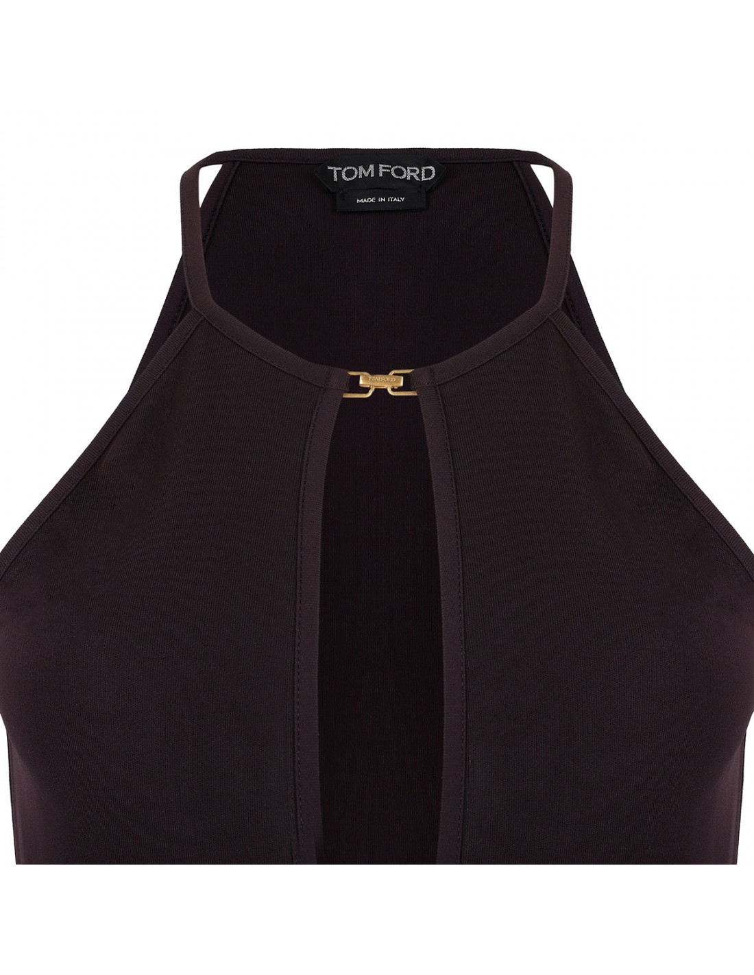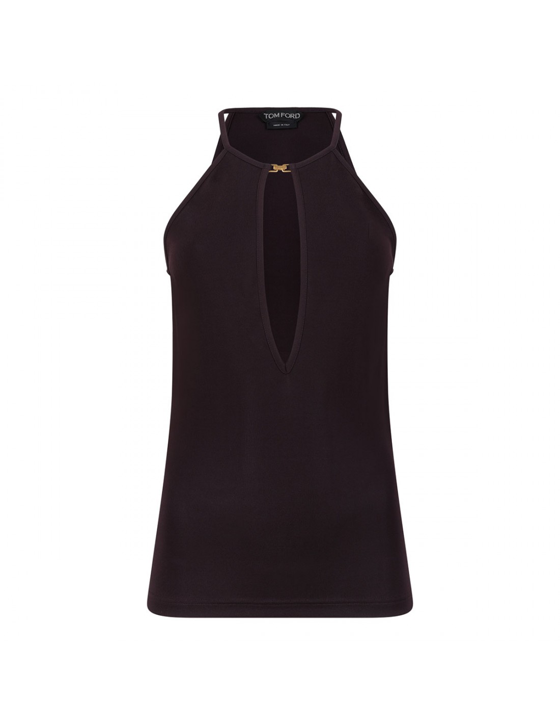 Plum-hue viscose top from Tom Ford featuring front cut-out with jewel detail, halterneck style, sleeveless silhouette.