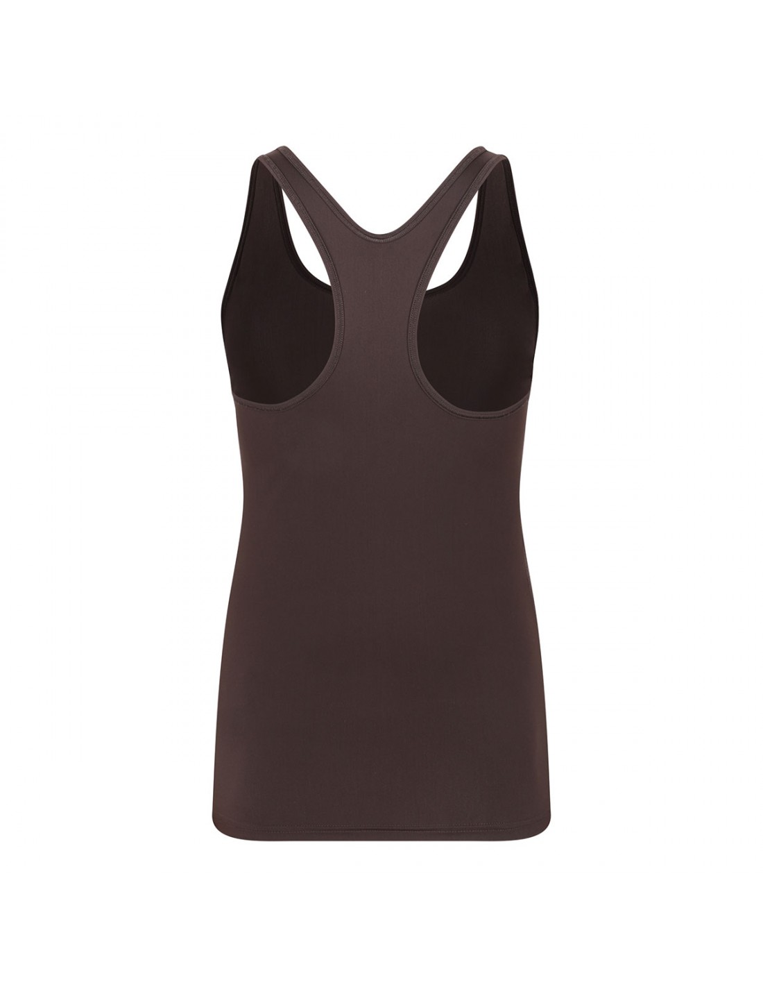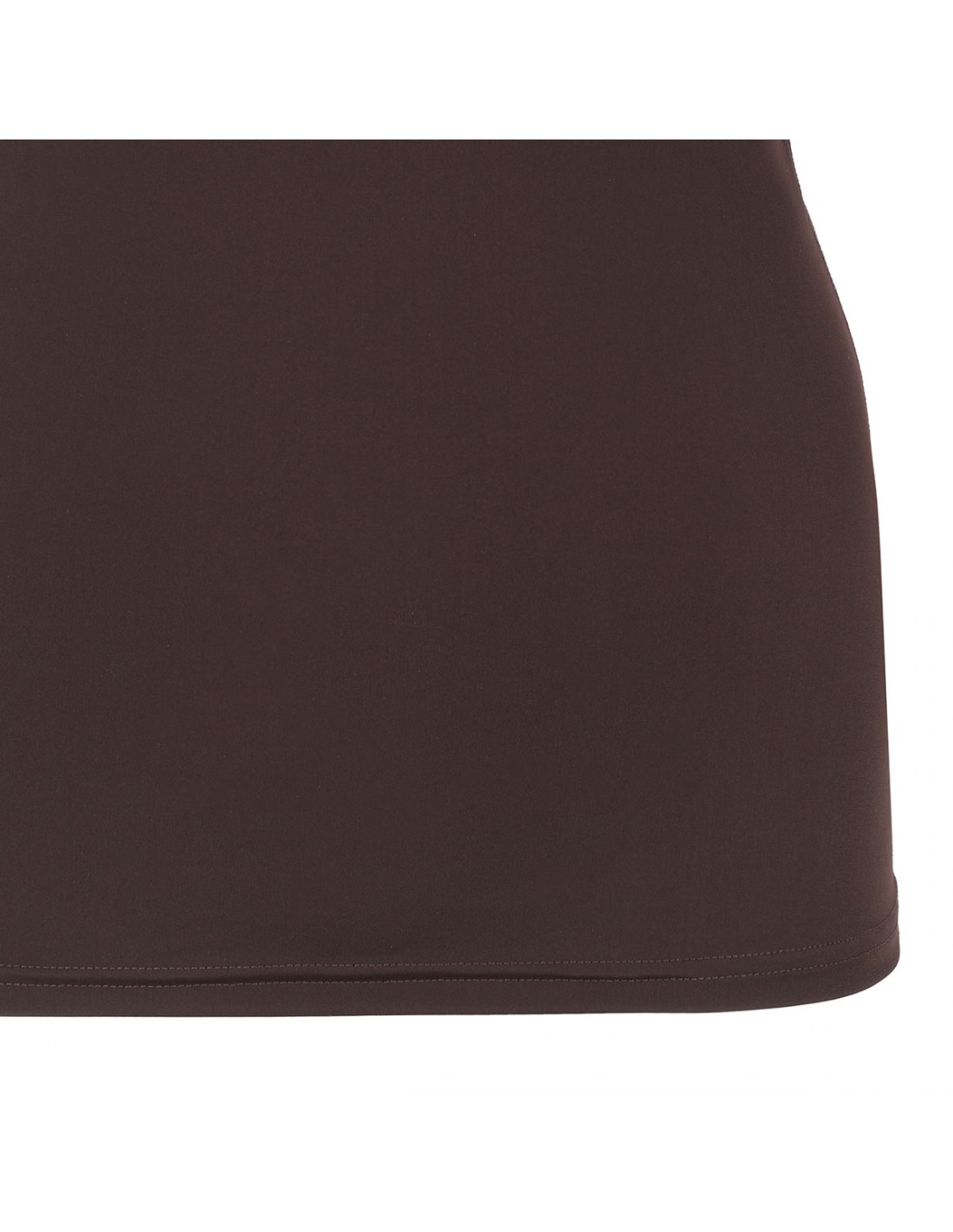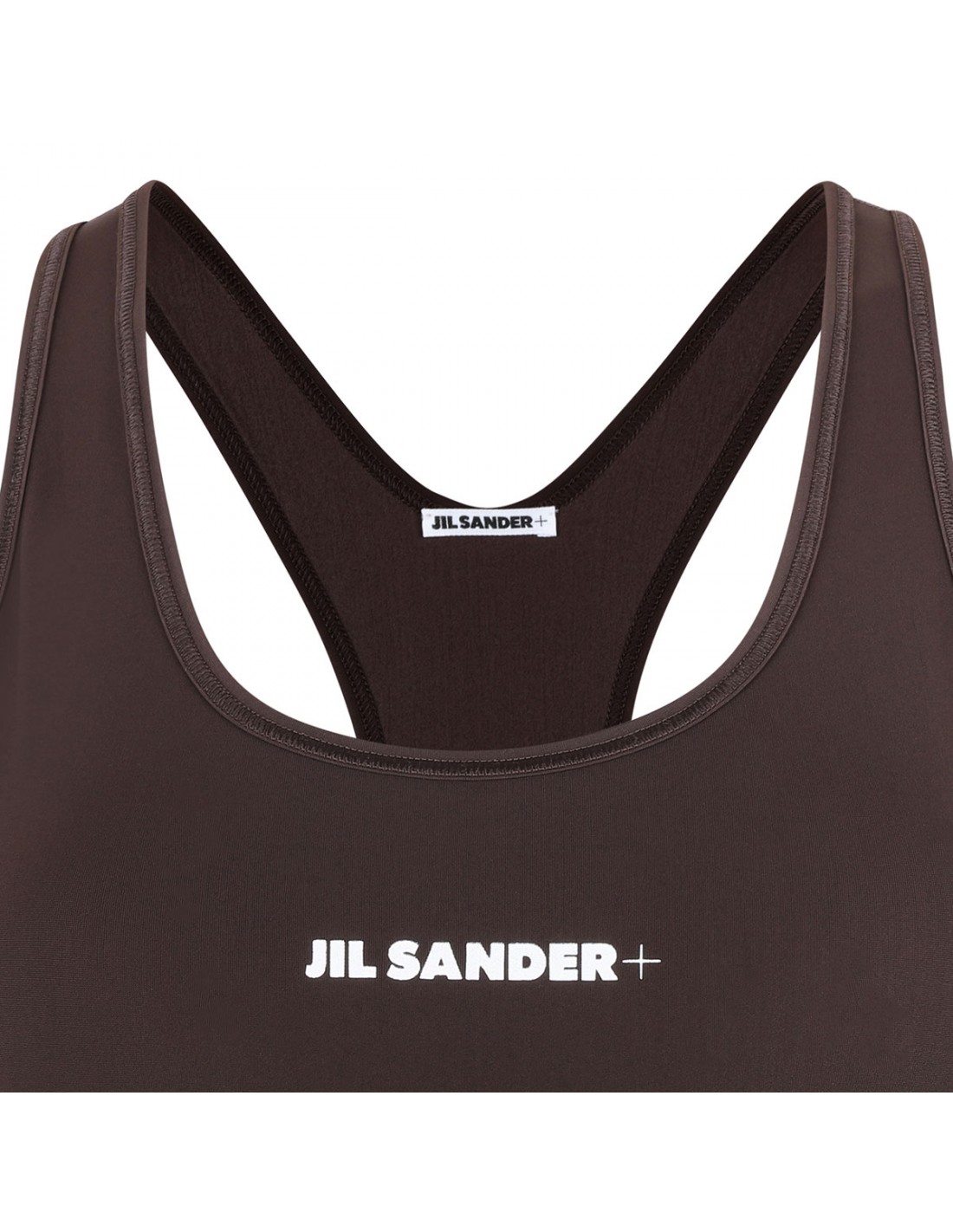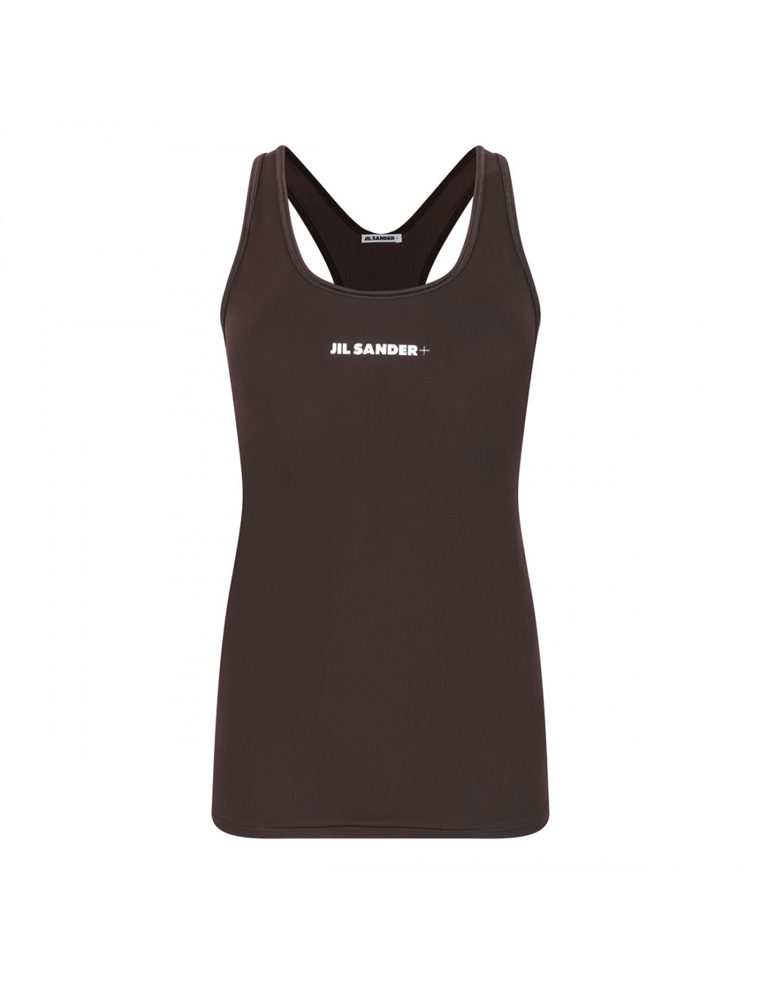 Chocolate hue stretch tank top from Jil Sander featuring white logo print on chest, racerback style, scoop neck, sleeveless design, fitted silhouette.