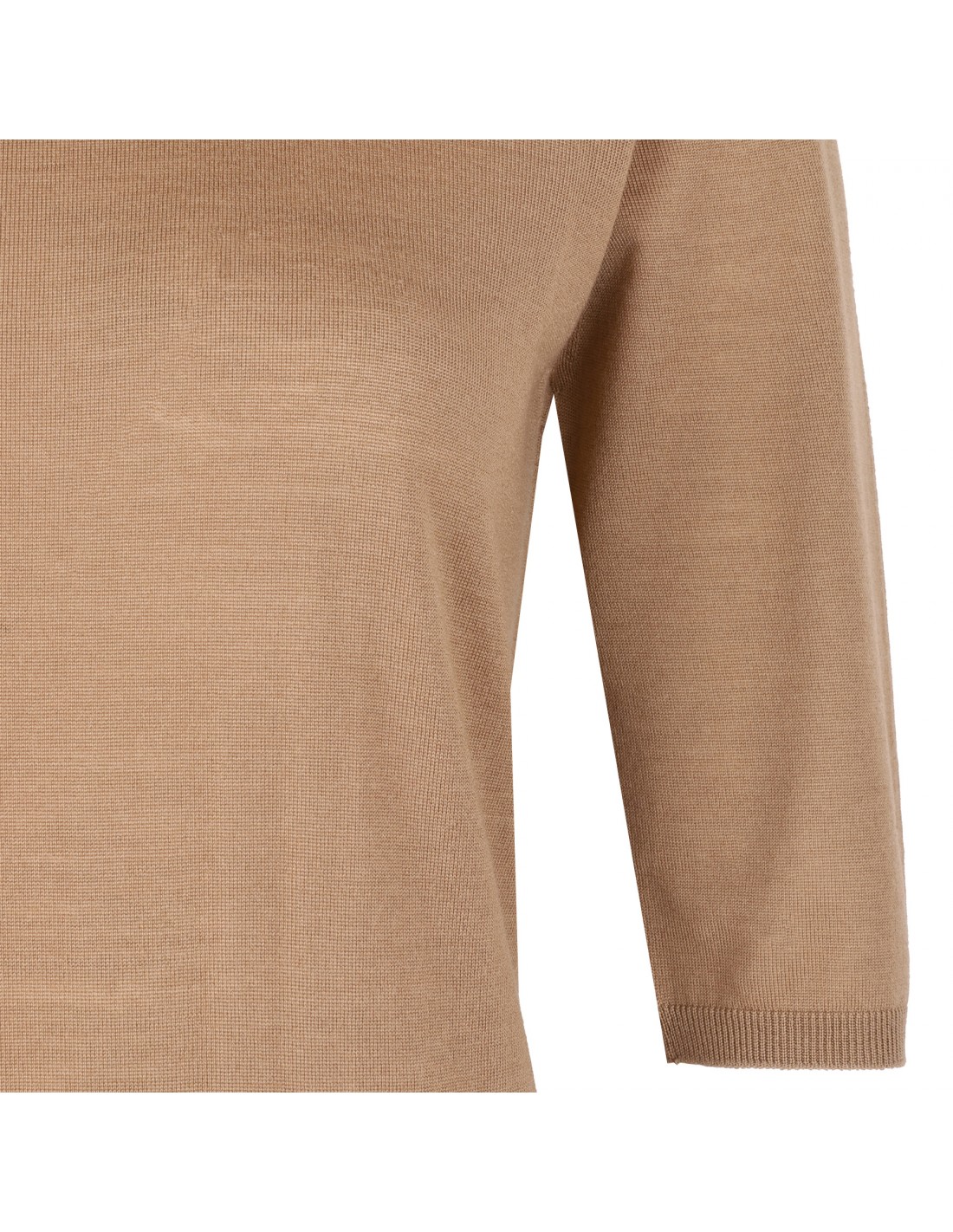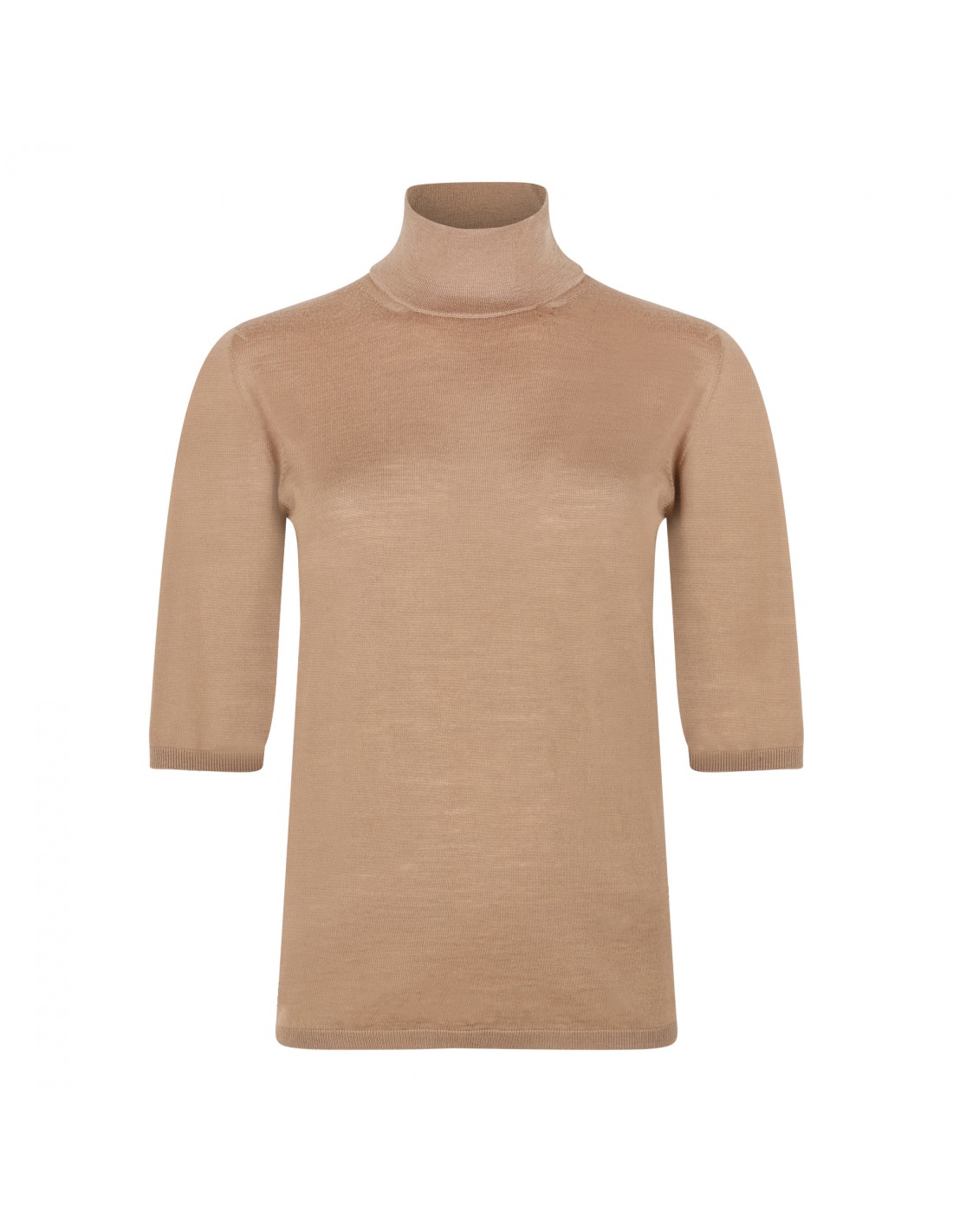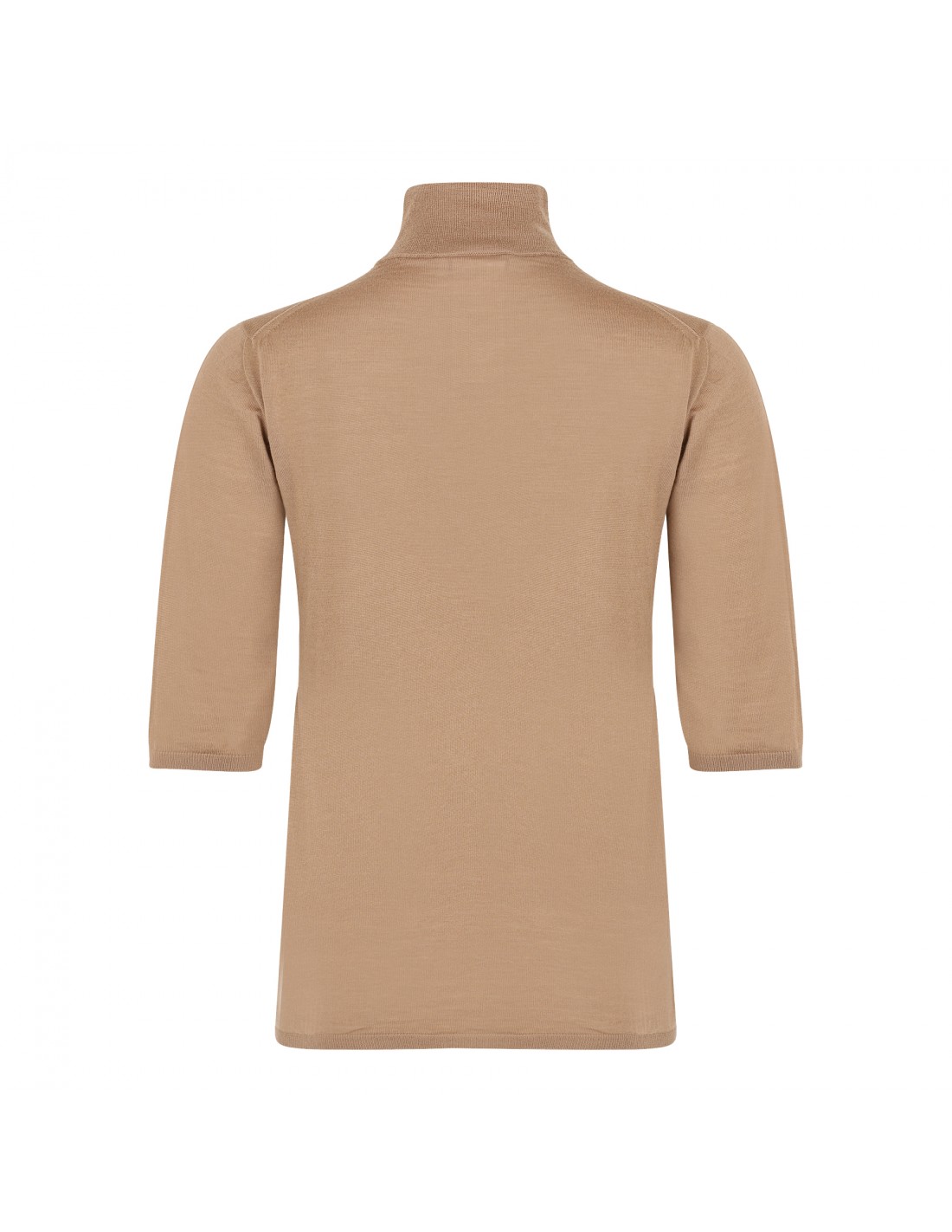 Camel hue pure wool Cecina top from Max Mara featuring turtleneck, elbow-length set-in sleeves.