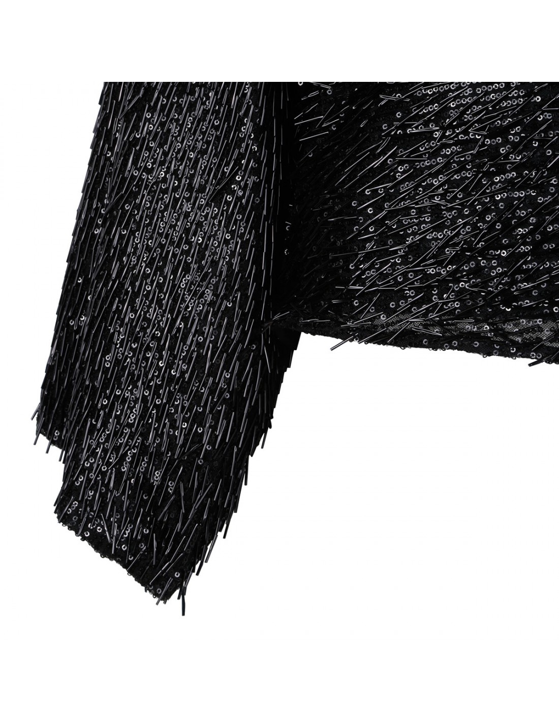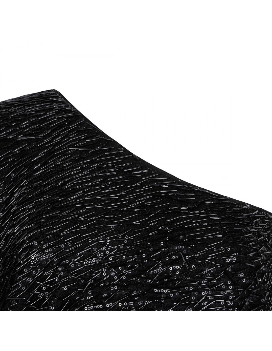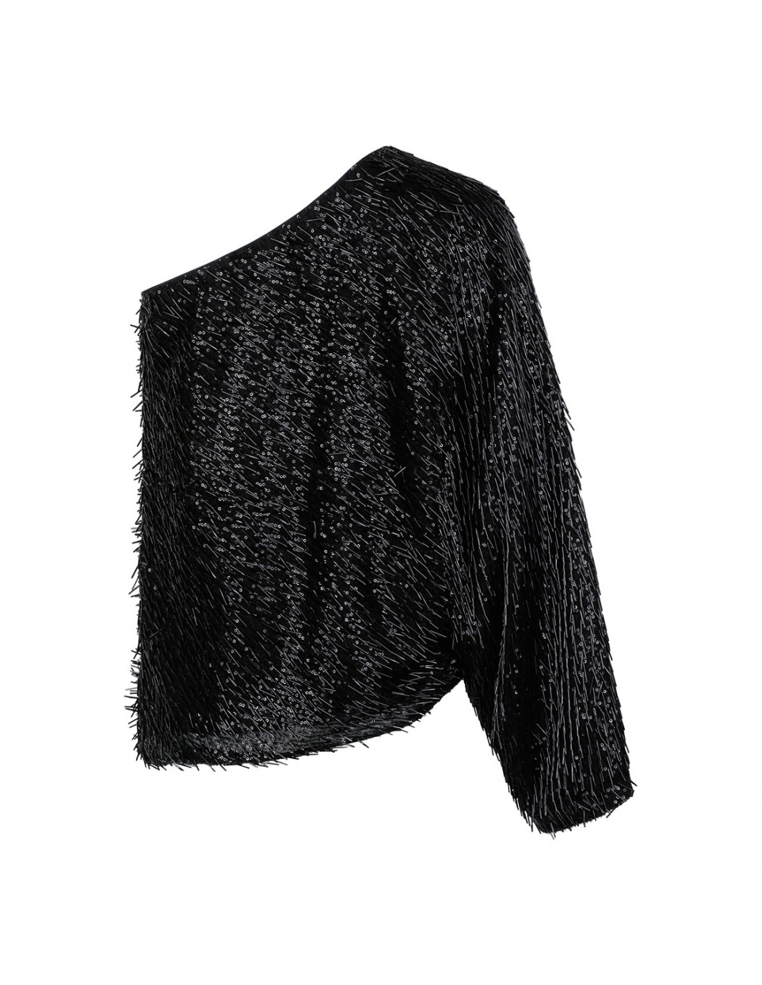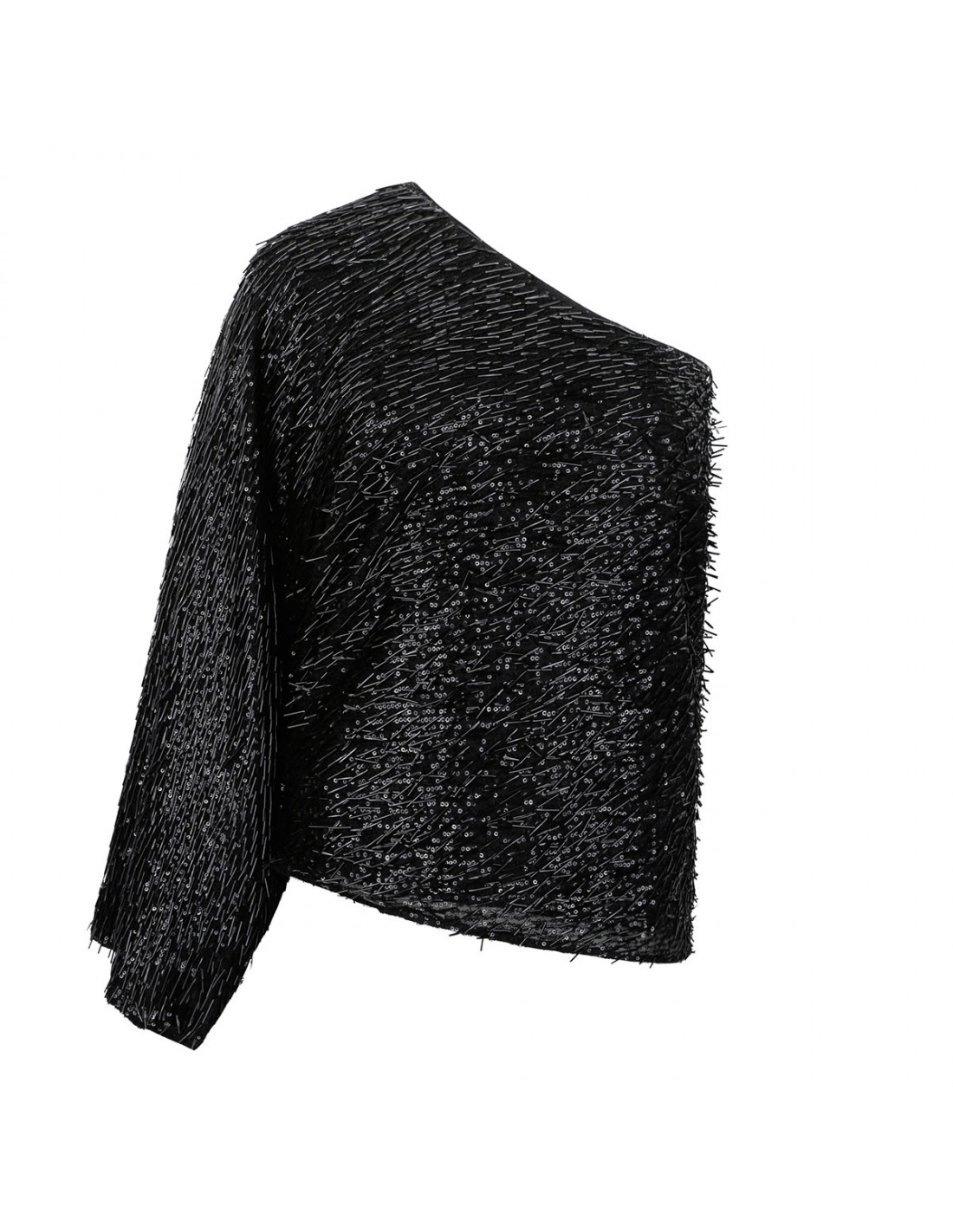 Black one-shoulder top from Federica Tosi featuring sequin appliqué, one long sleeves, relaxed silhouette.