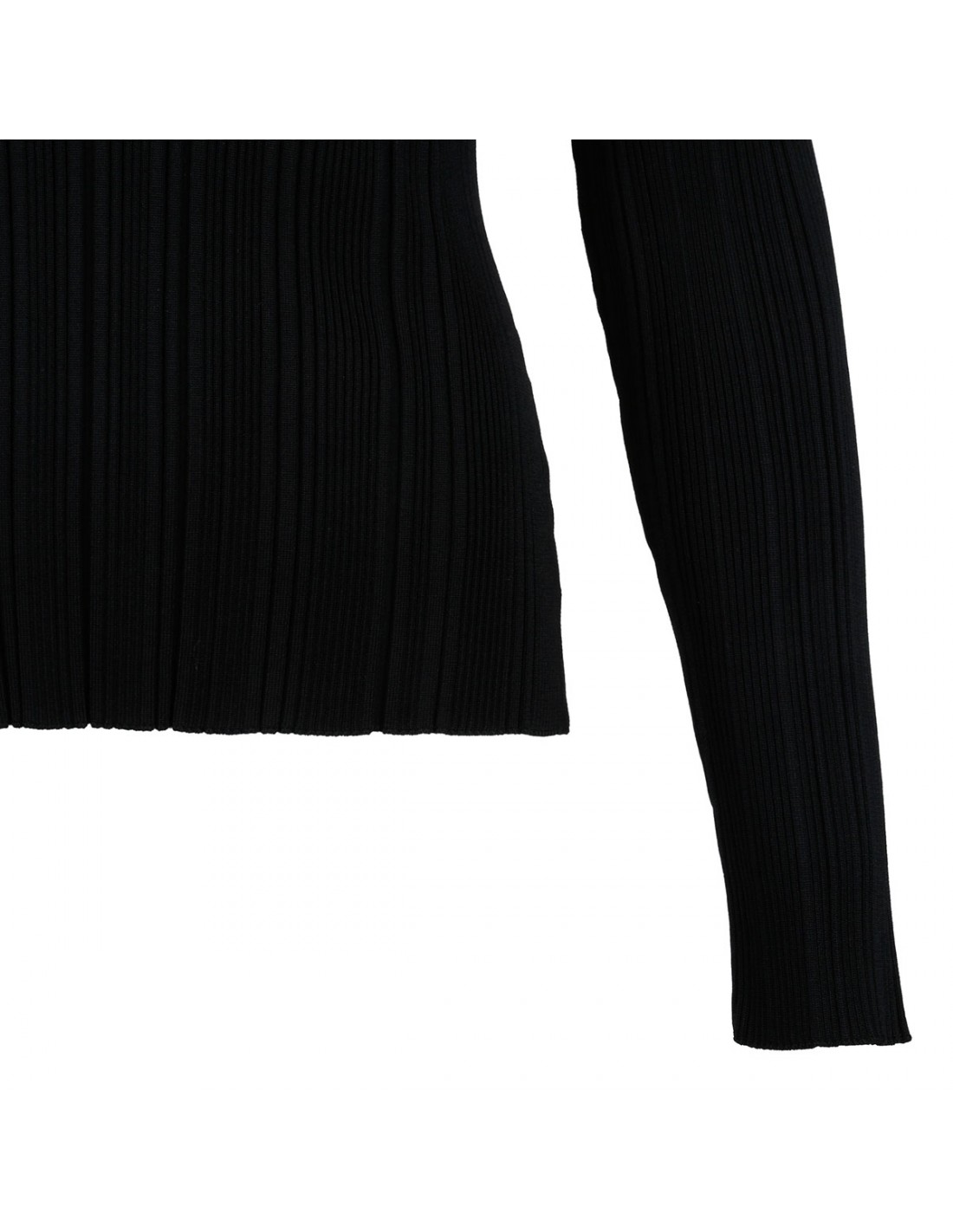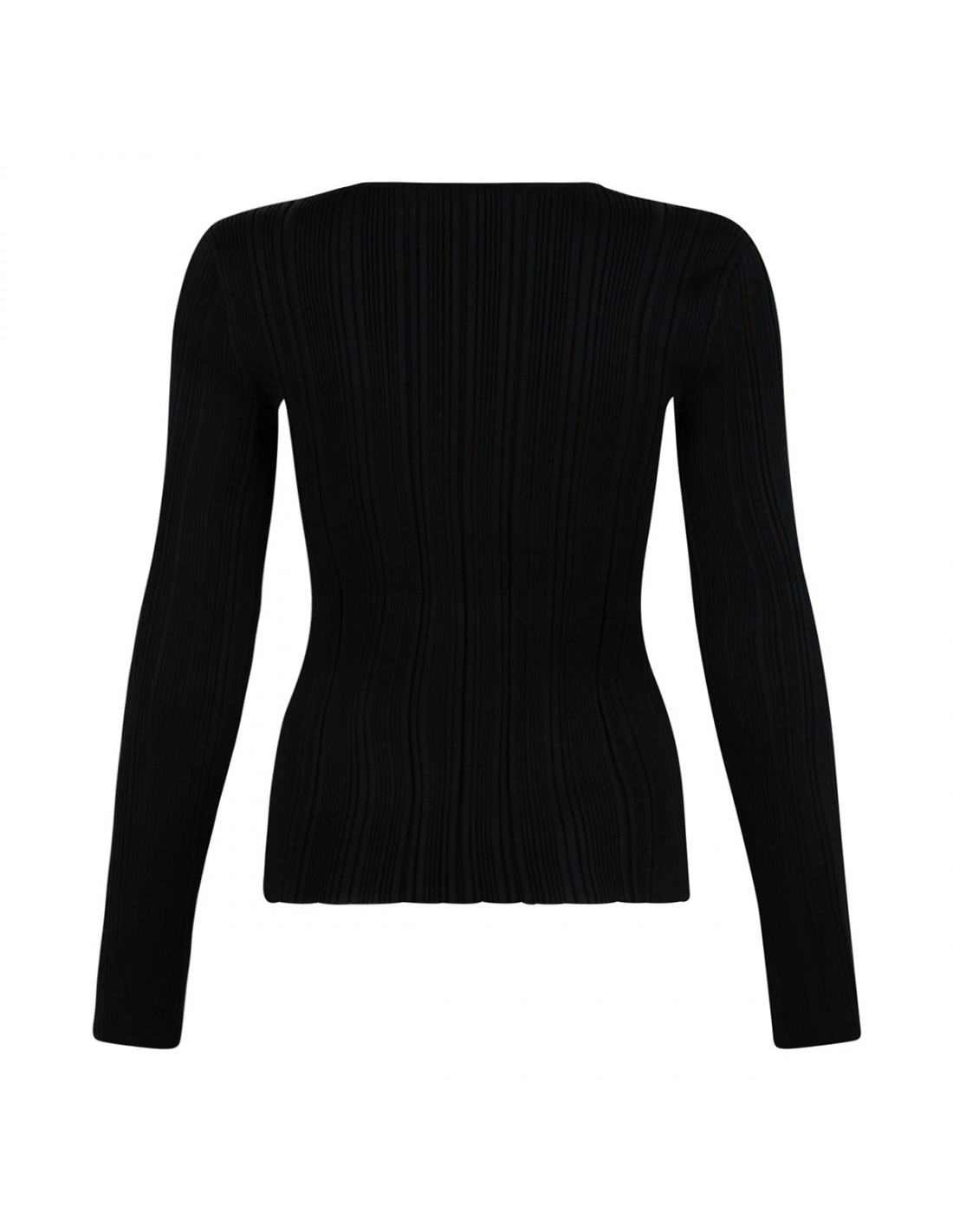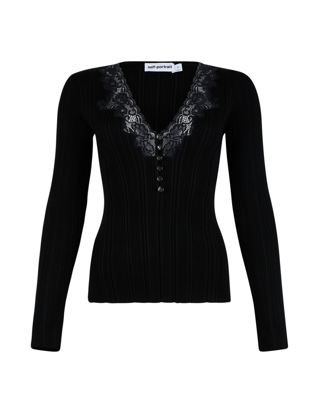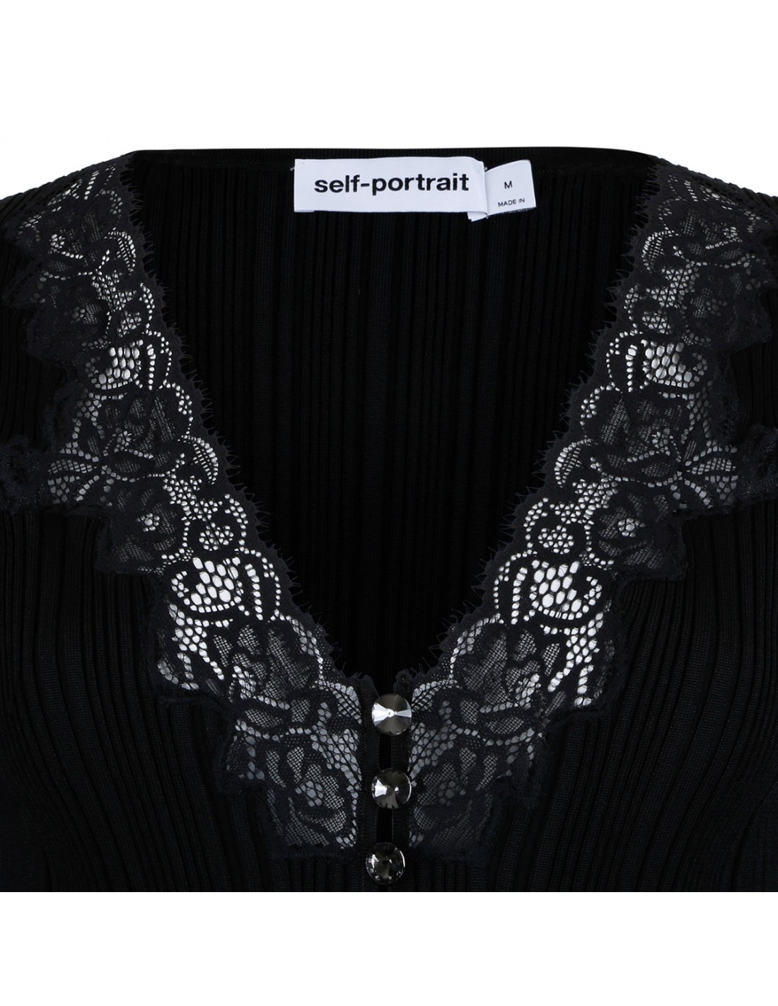 Black ribbed knit top from Self-Portrait featuring lace trim, diamanté button closure on front, plunging V-neck, long sleeves.
