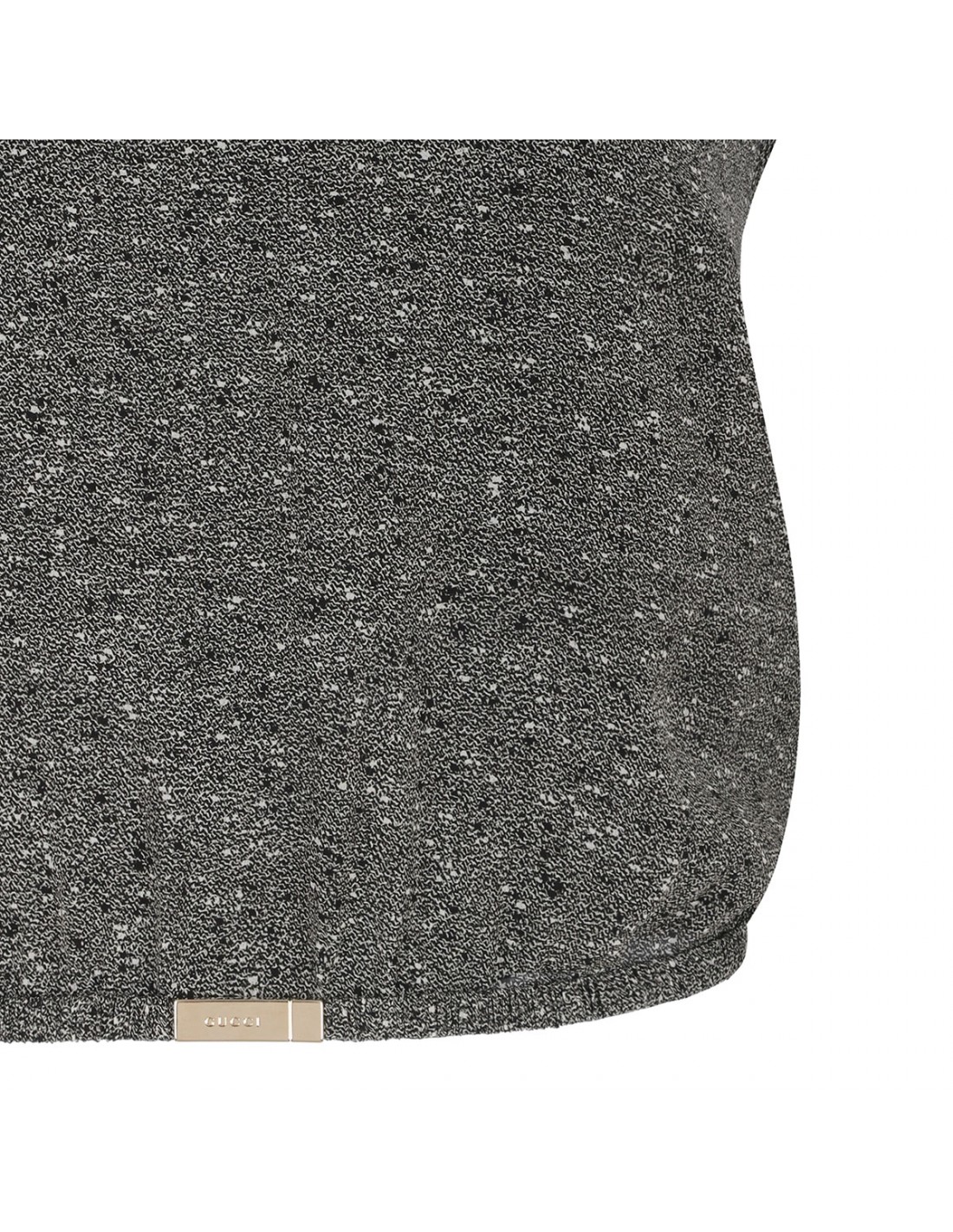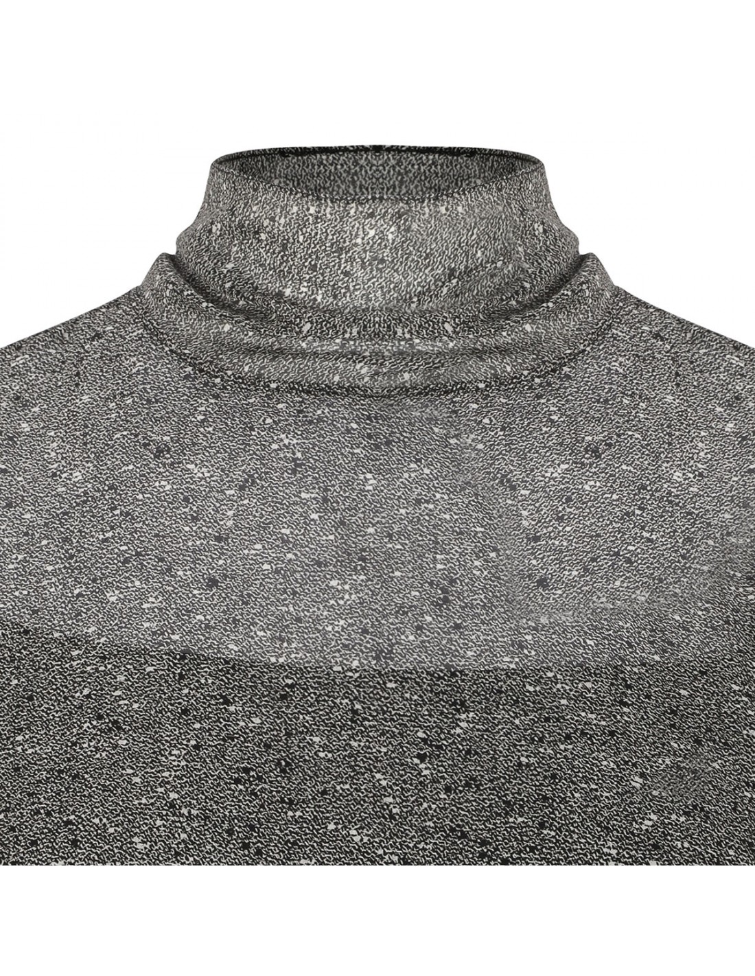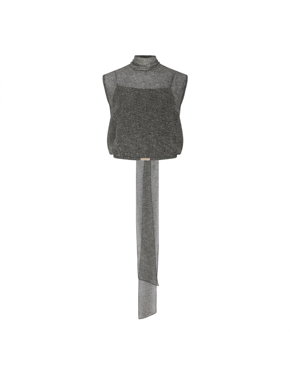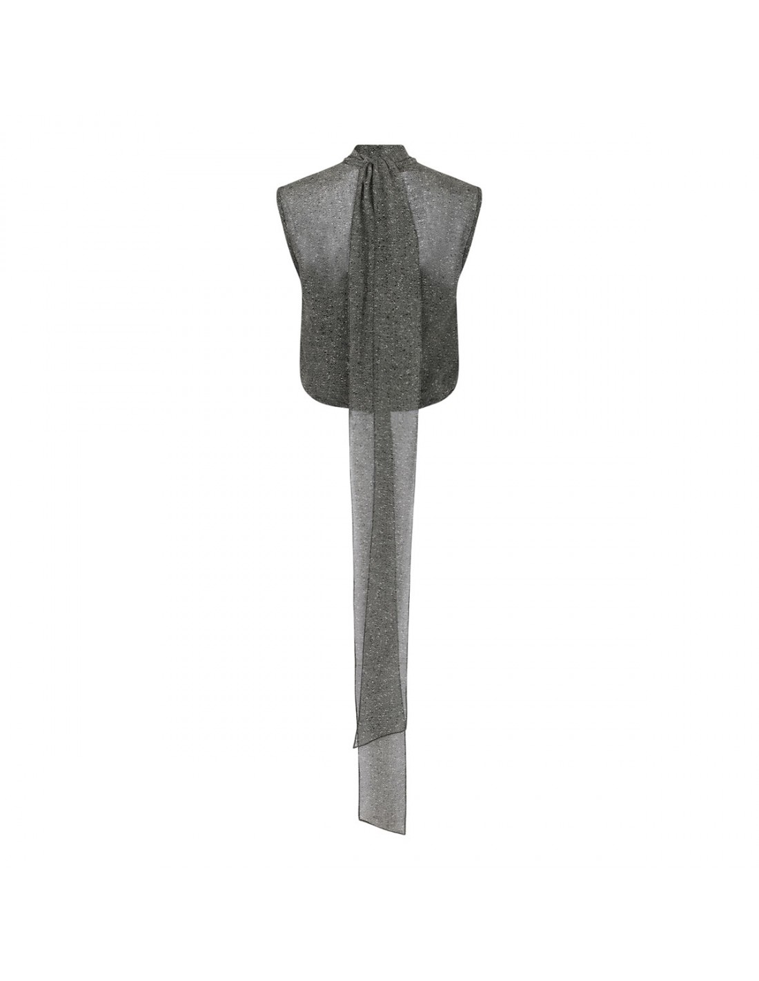 Black and white sheer silk georgette top from Gucci featuring boutonné motif printed allover, floor length self-tie neck bow, ruched elastic waist with metal logo buckle, sleeveless style, detachable lining.