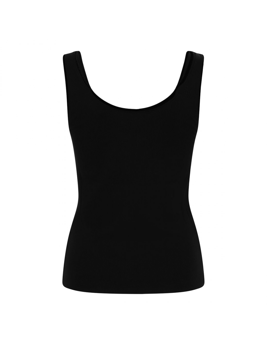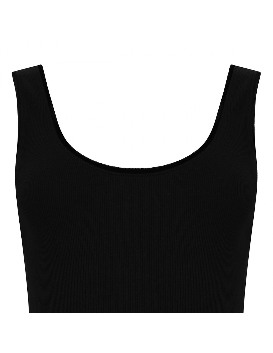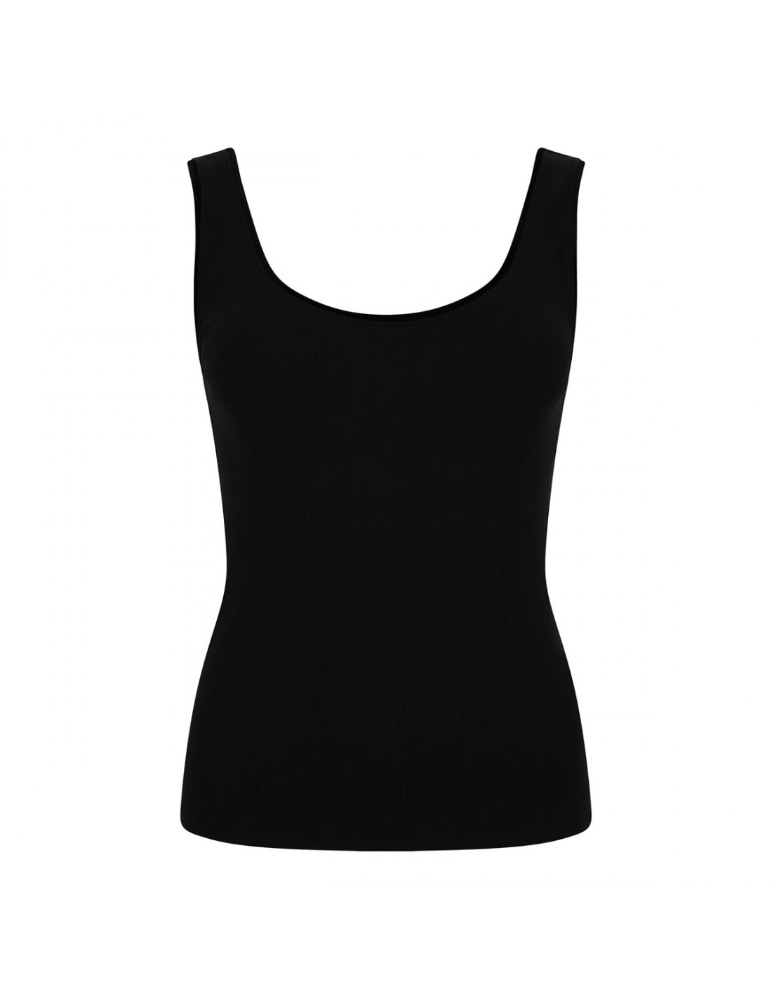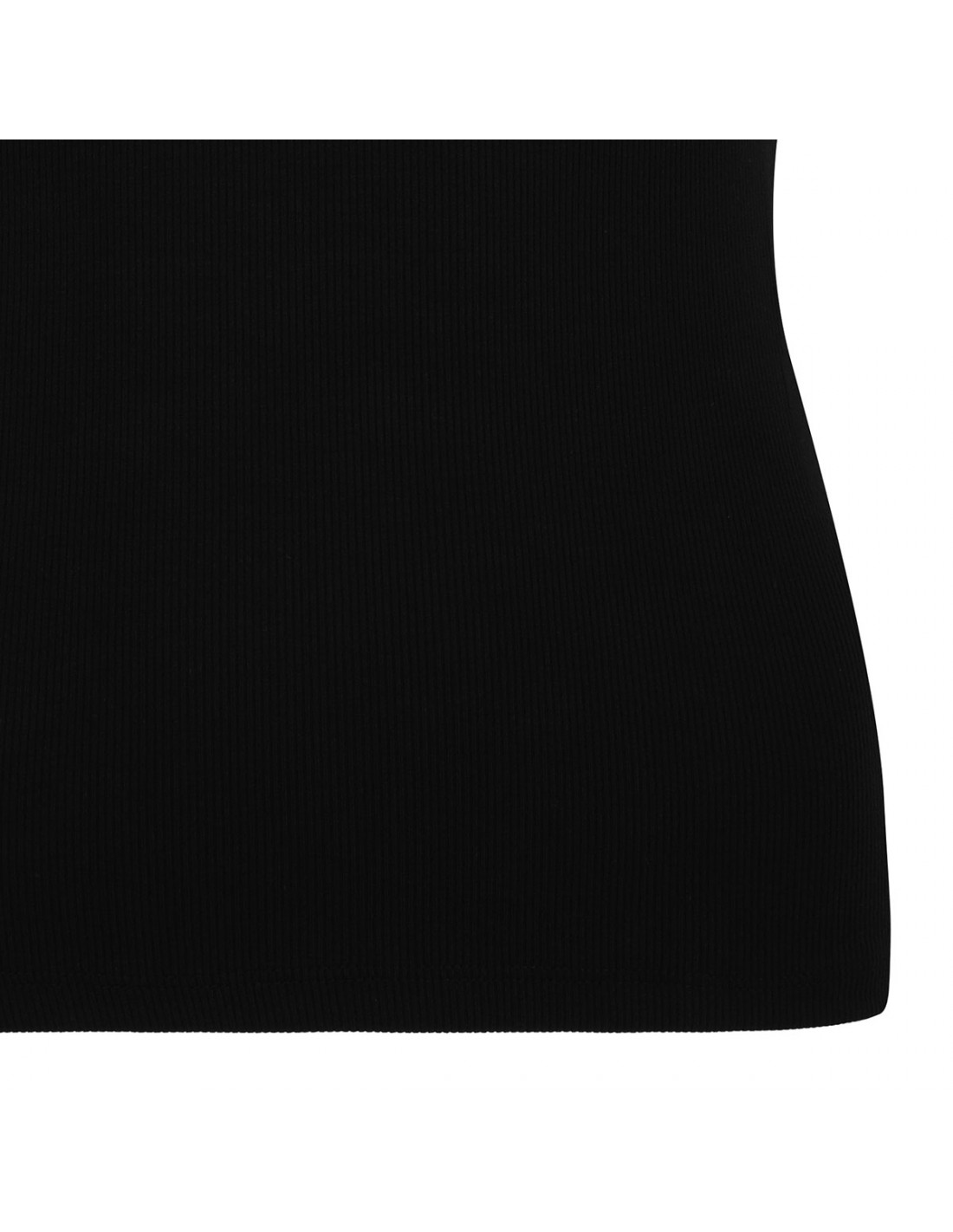Black ribbed knit stretch modal tank top from Frame featuring scoop neck, sleeveless silhouette, white shoulder straps, fitted silhouette.