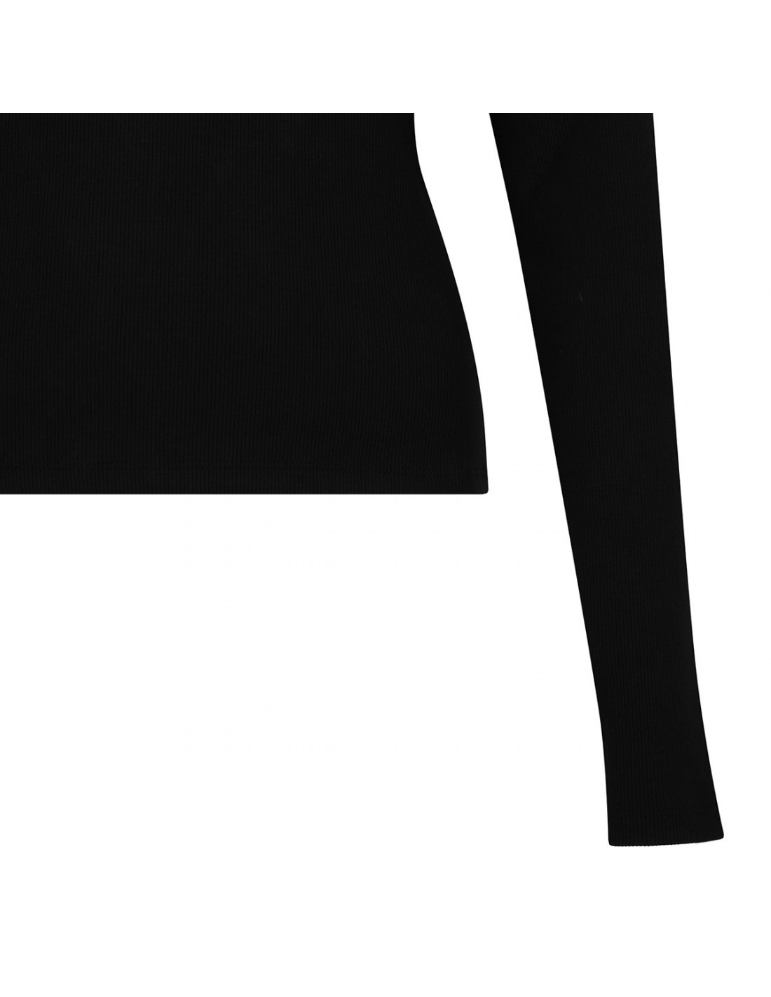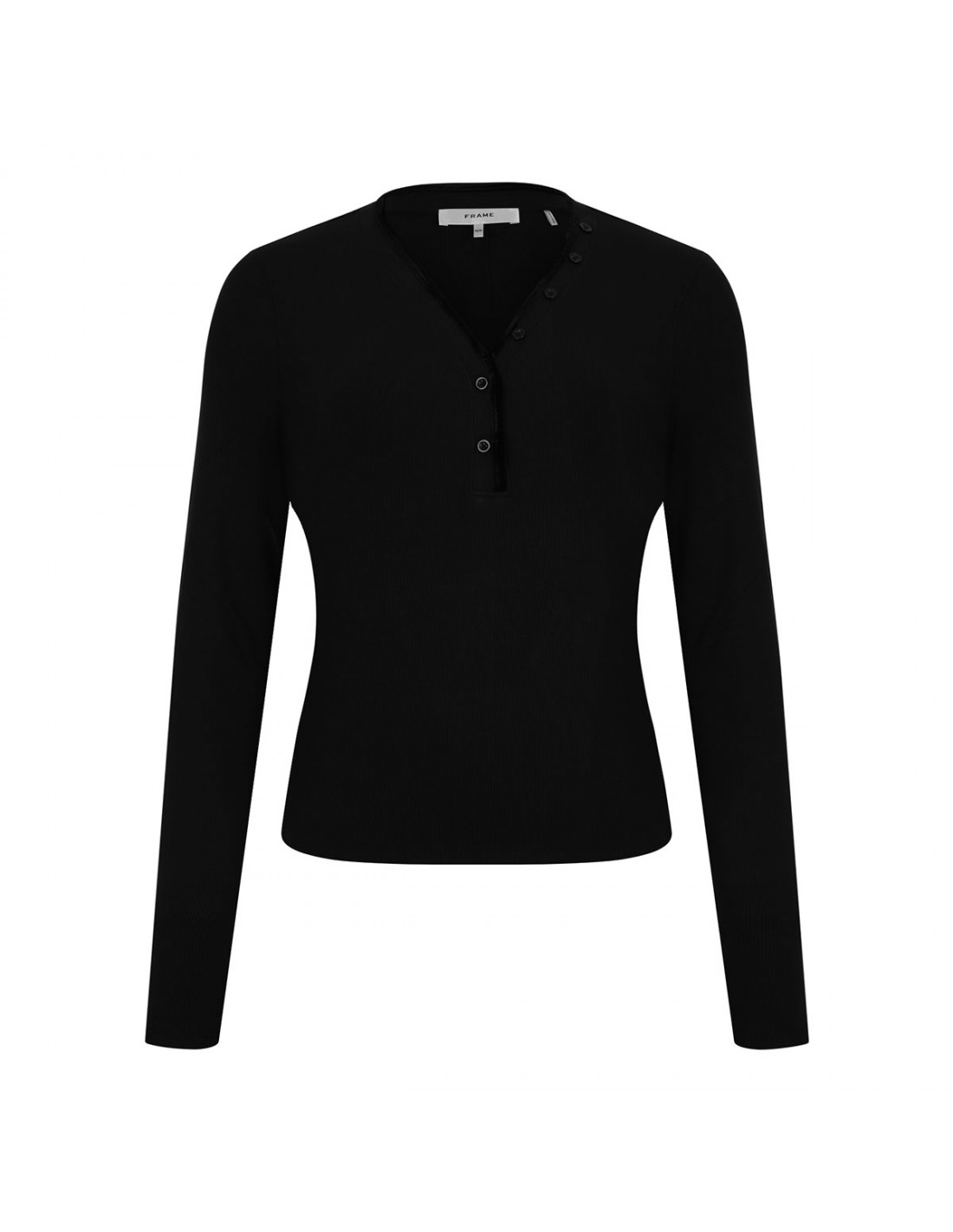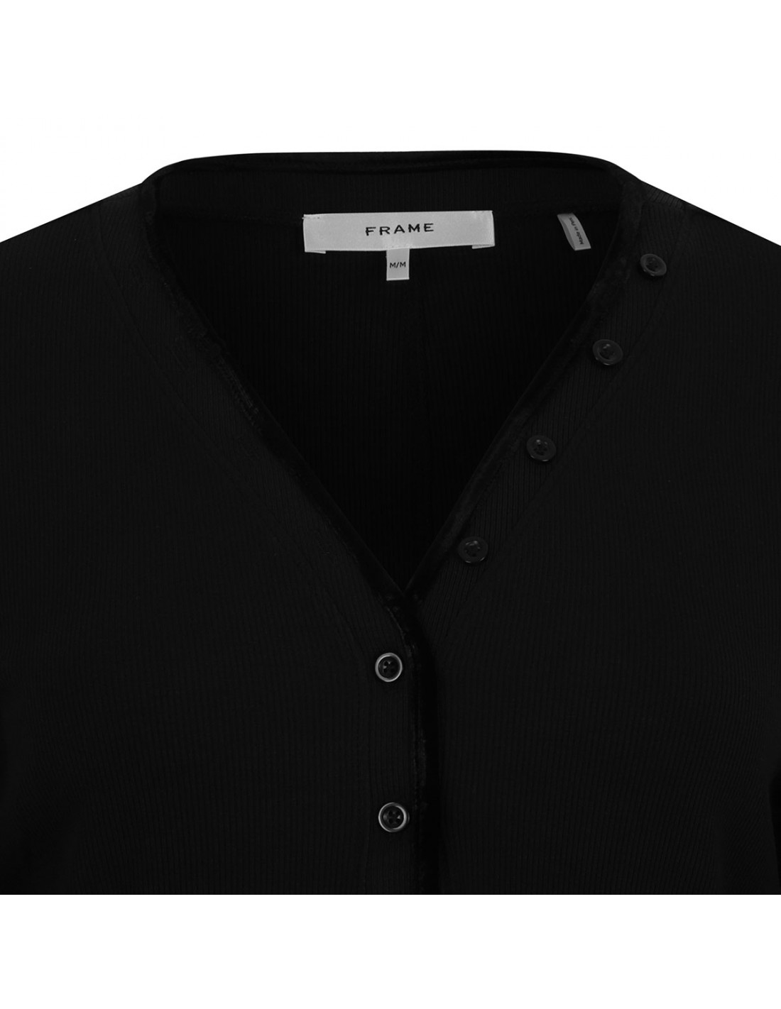 Black stretch ribbed modal The velvet trim henley top from Frame featuring long sleeves, deep V-neckline with button details, velvet trim, subtle center-back stitch, body-hugging fit.