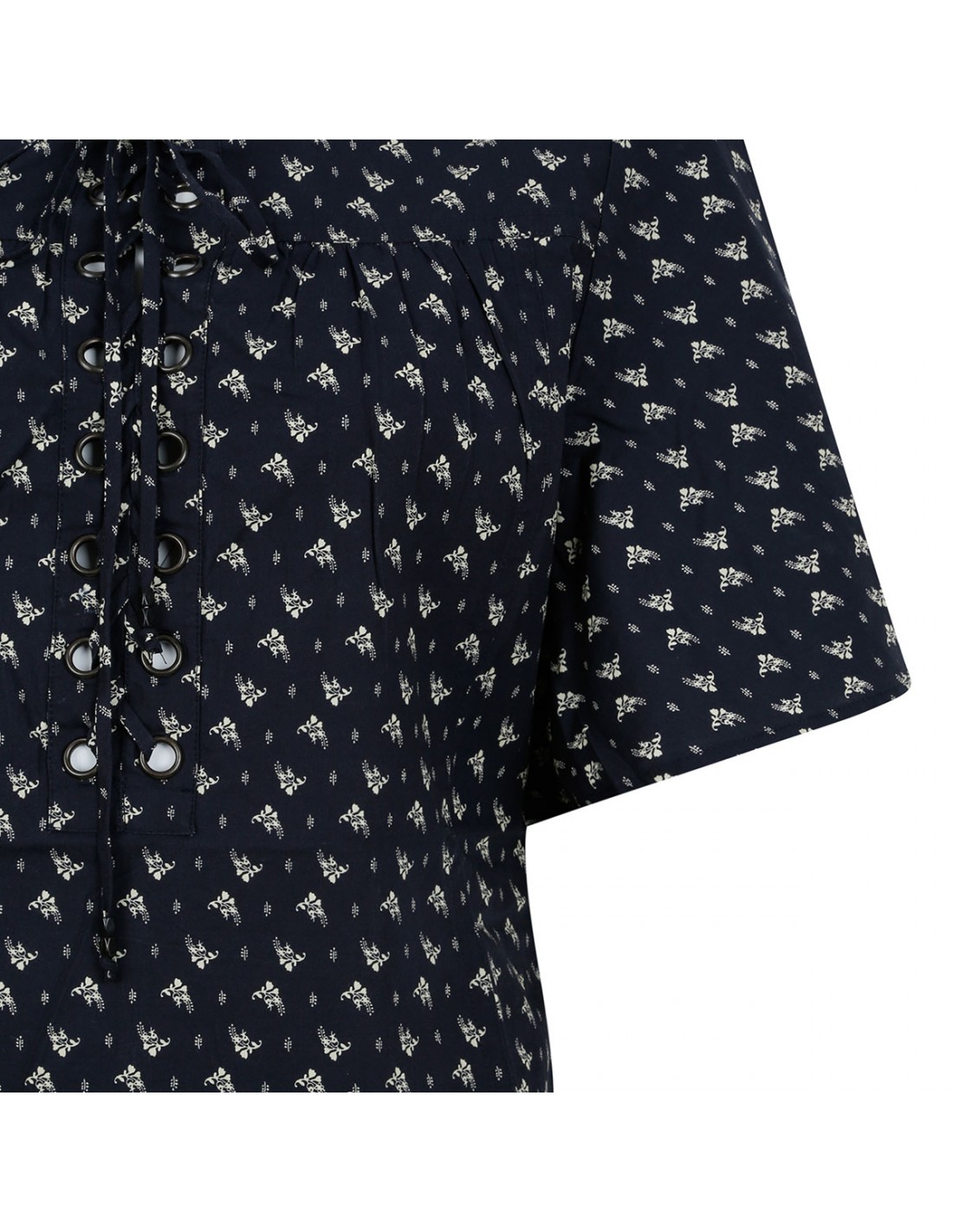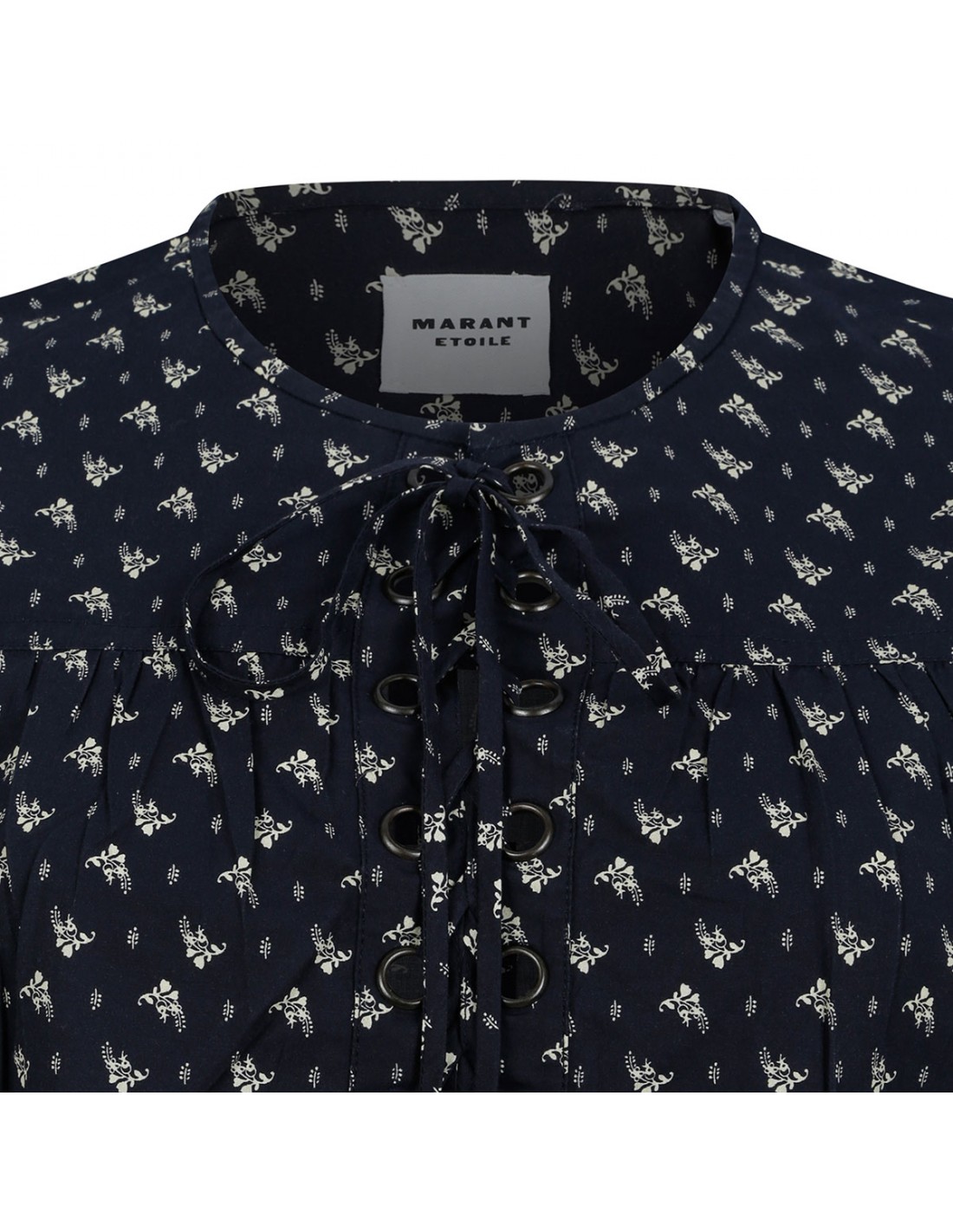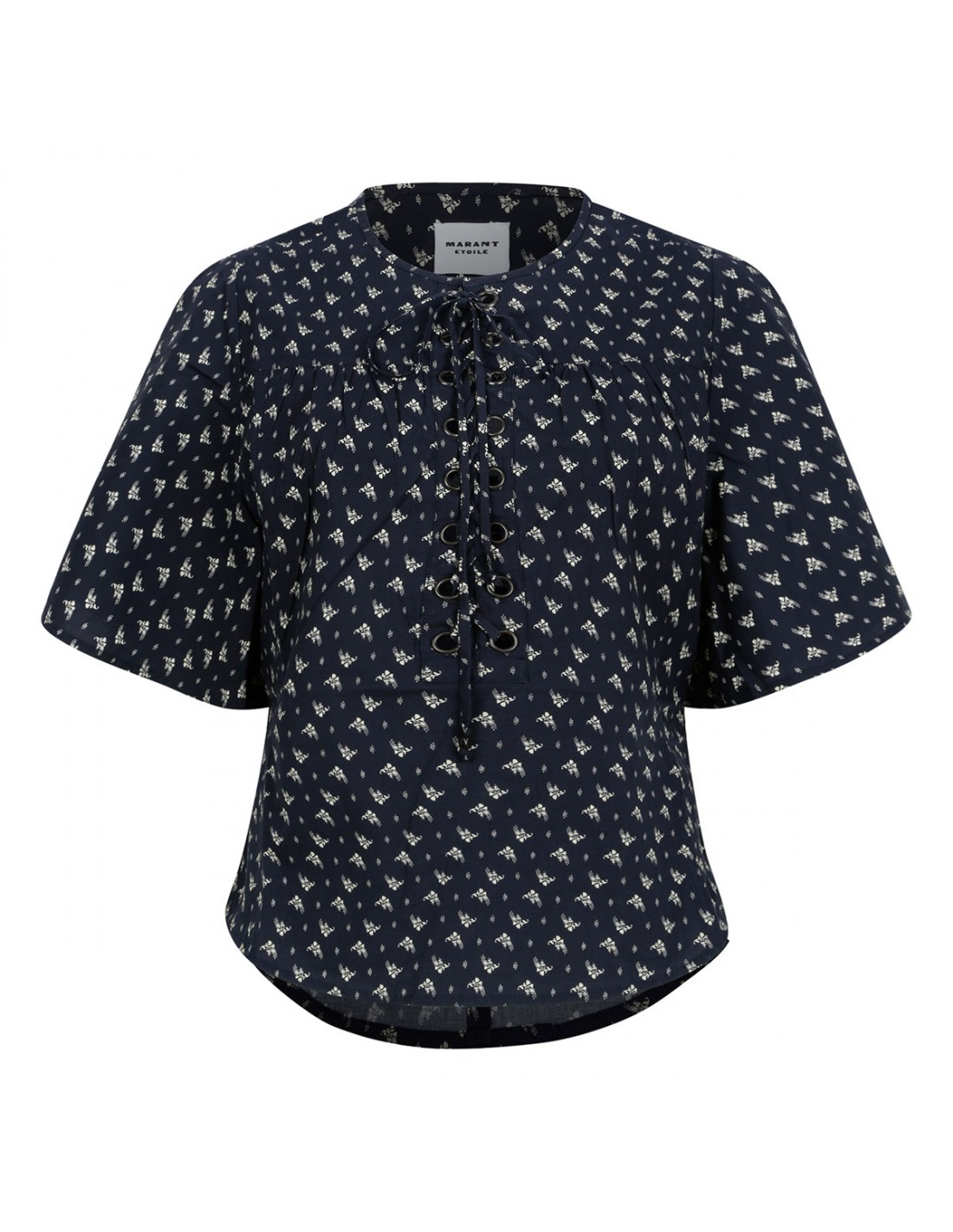 Black cotton Dianga top from Isabel Marant Etoile featuring contrasting floral print, rounded neckline with a corset-style tie adorned with metal eyelet, wide flowing short sleeves.