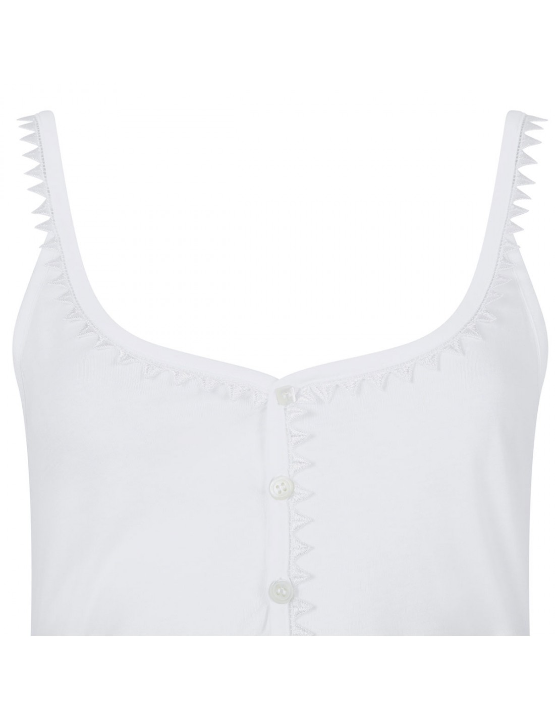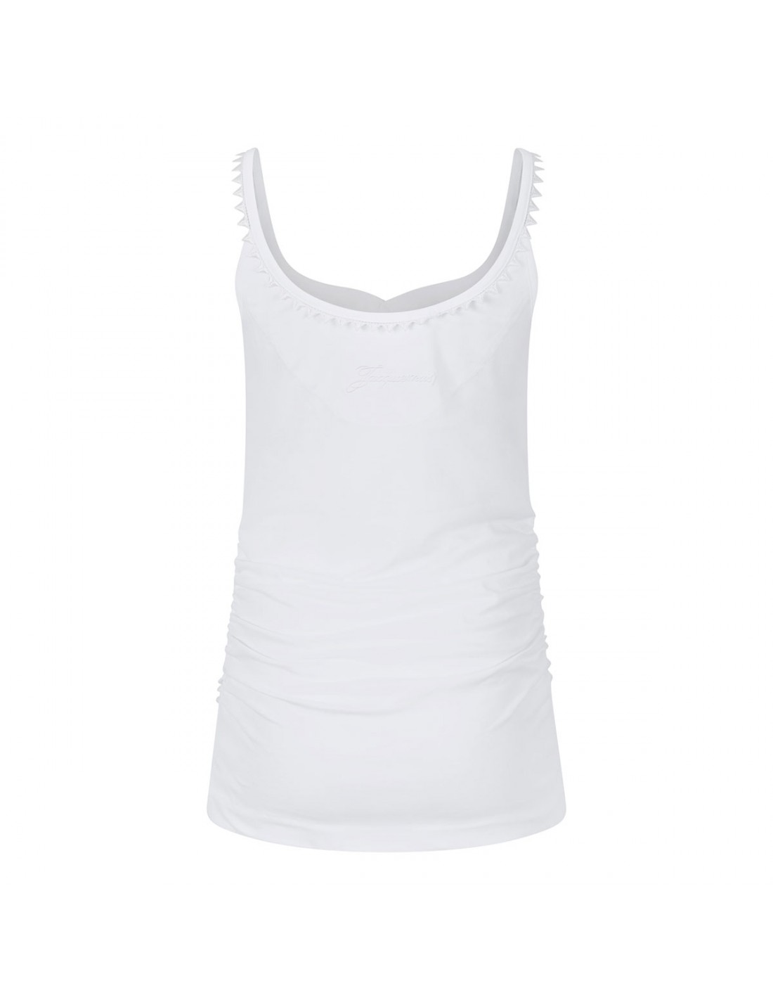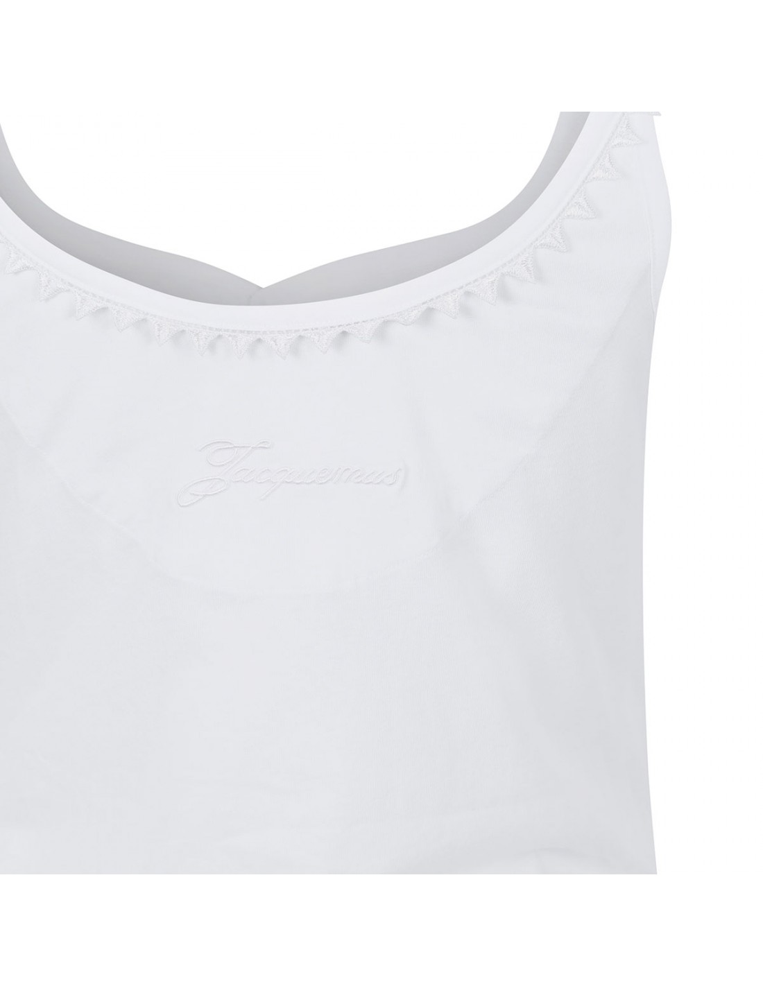 White cotton The Clavela tank top from Jacquemus featuring woven triangle straps and trims, scoop neck, button closure on front, embroidered logo on back, draped bottom.