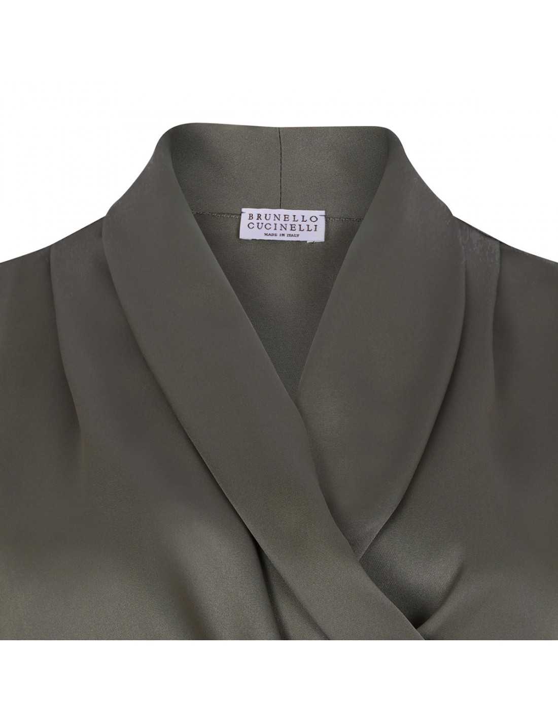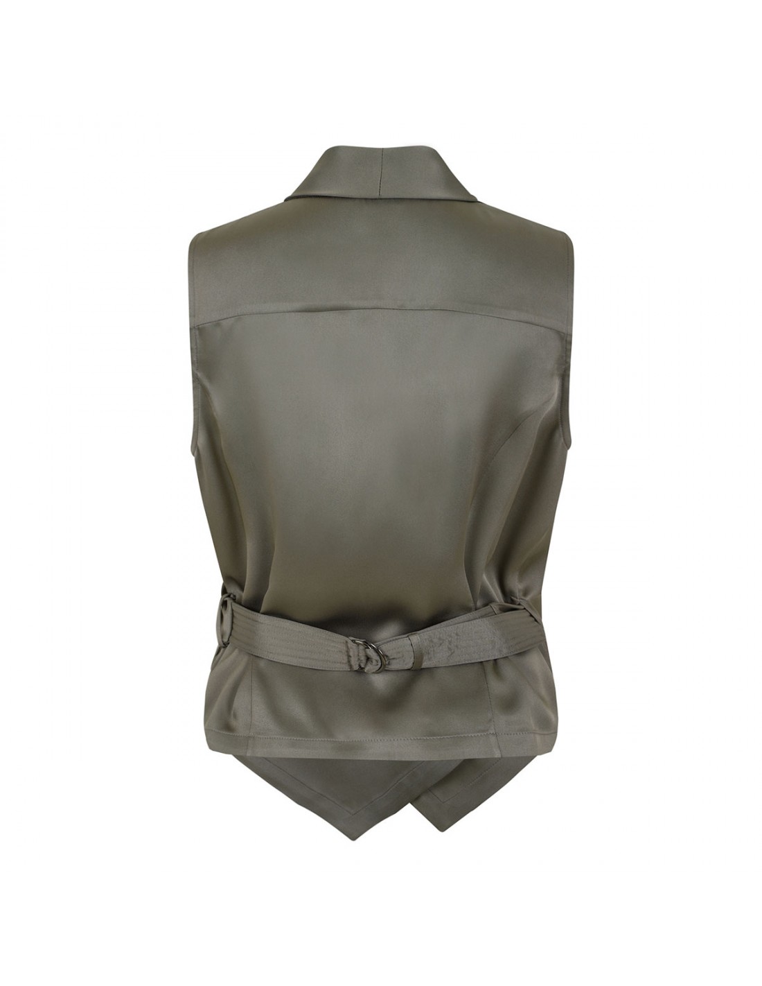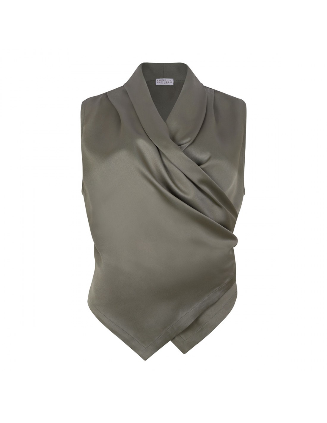 Rosemary hue silk satin wrap vest from Brunello Cucinelli featuring draping-front, sleeveless silhouette, V-neck, asymmetric front, back adjustable belt with D-ring closure.