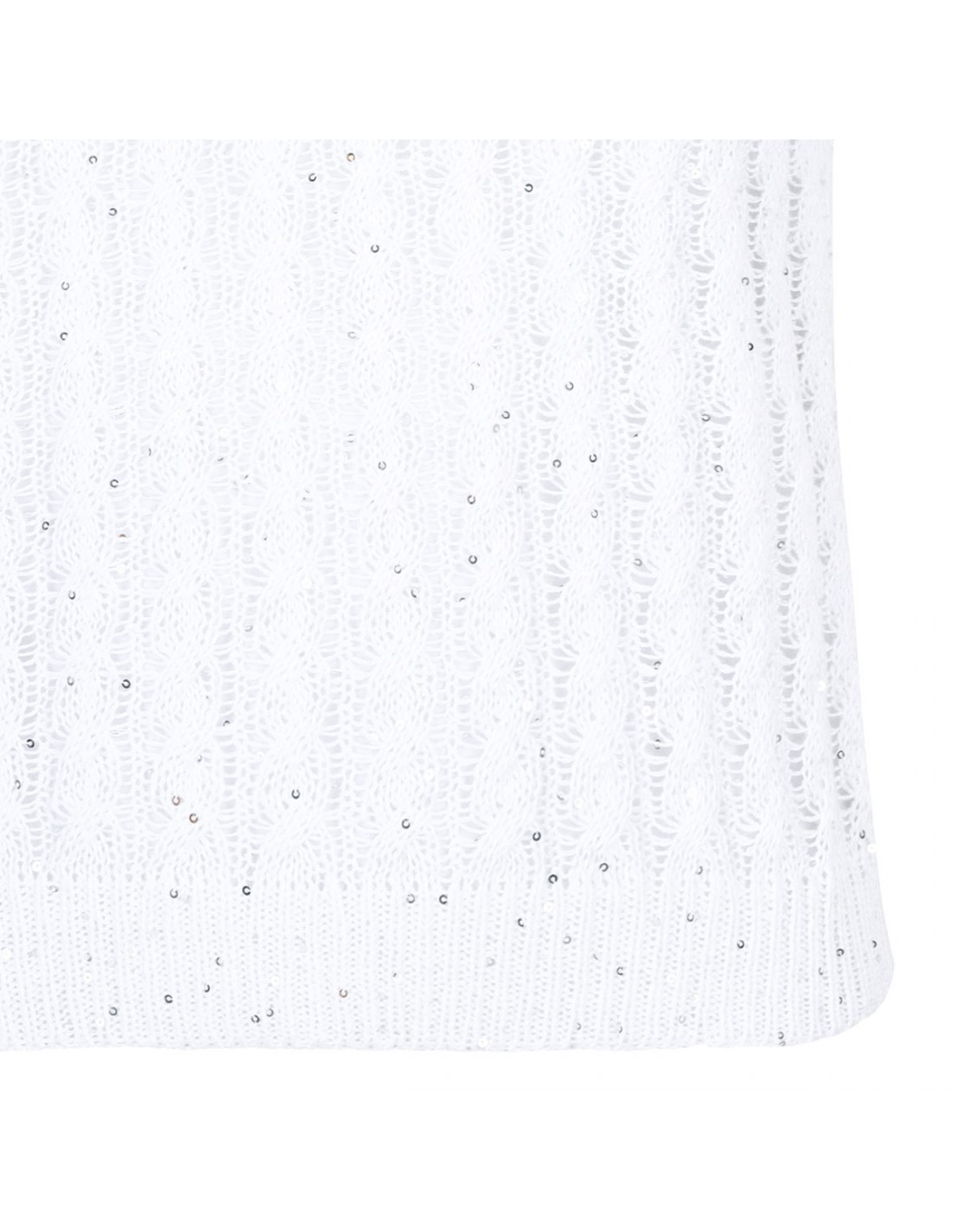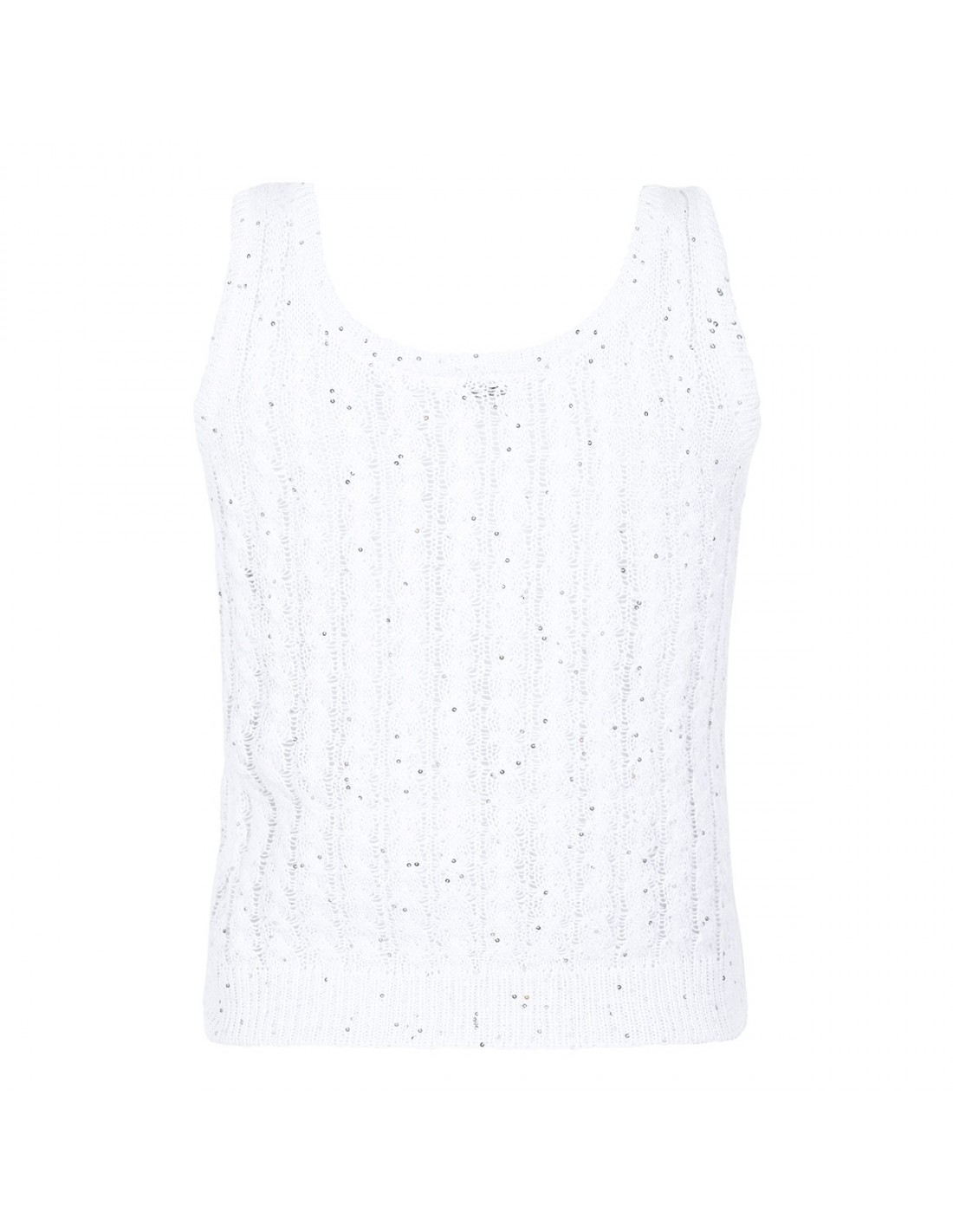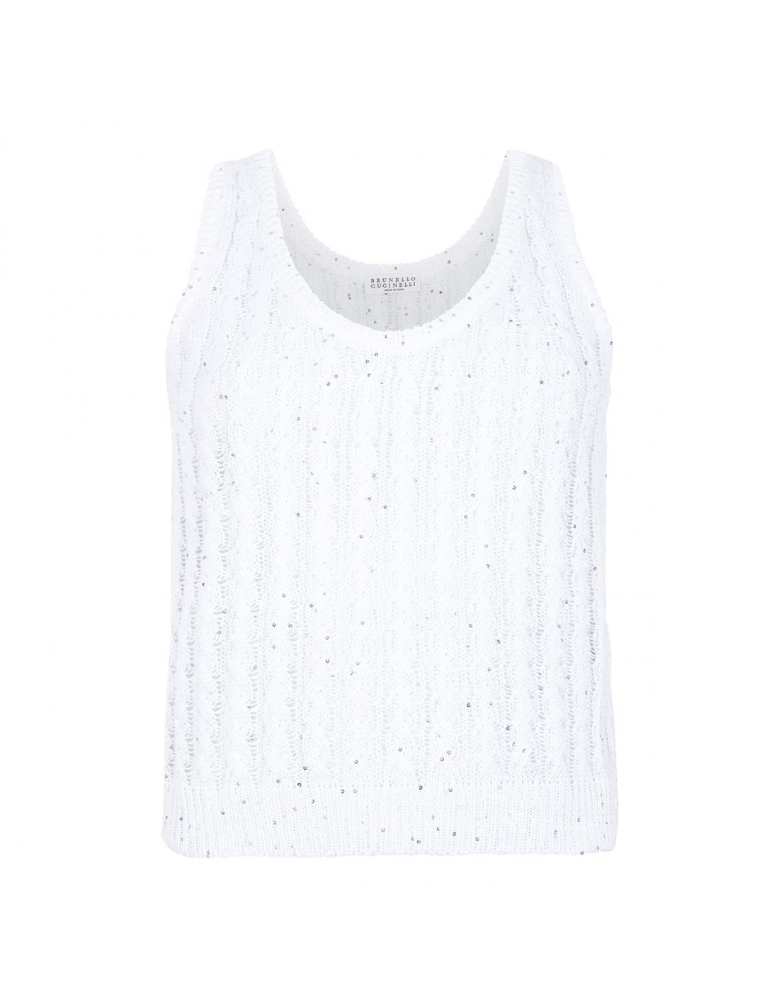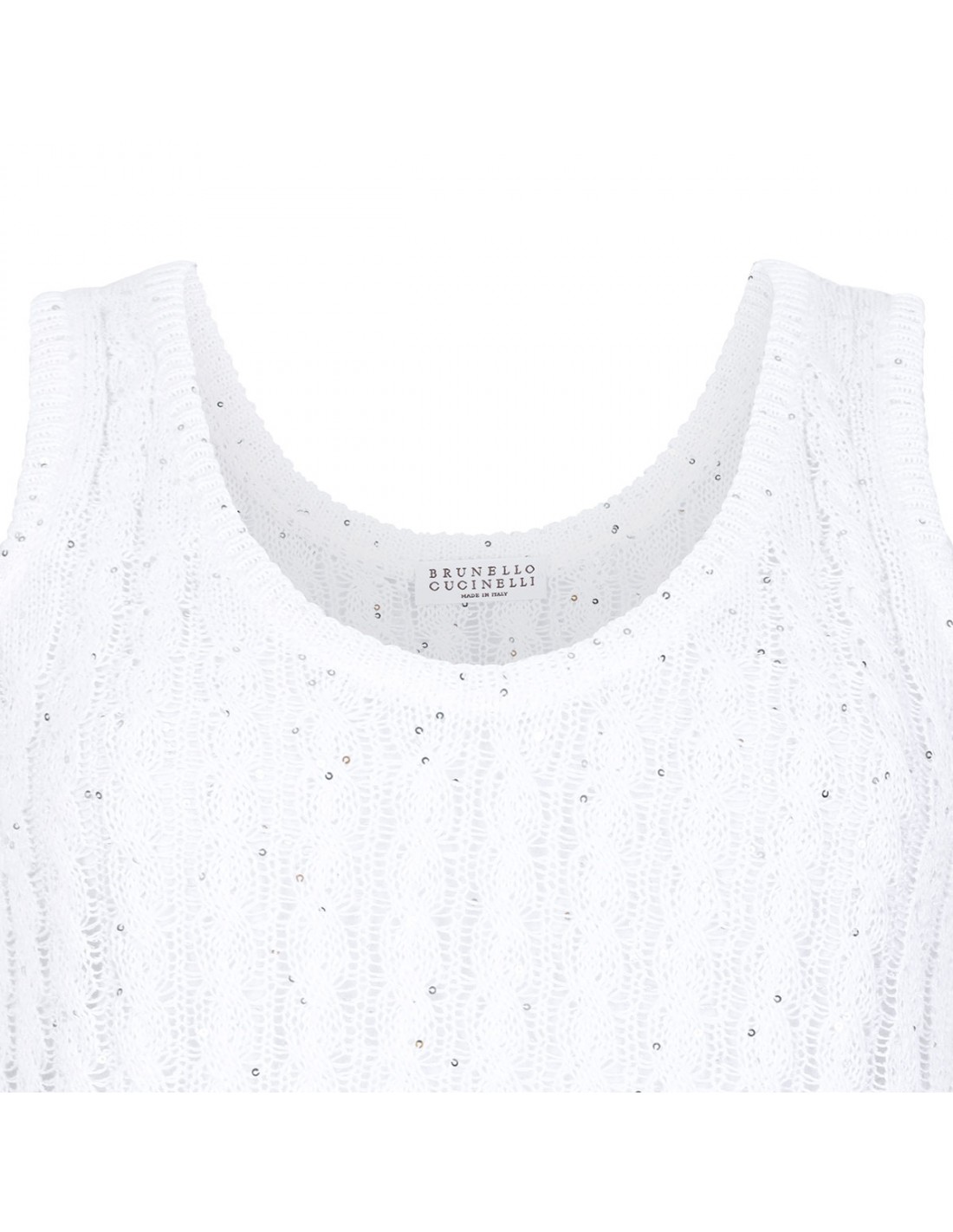 White linen top from Brunello Cucinelli featuring cable and openwork knit, sequins, wide neckline, sleeveless style, rib knit hem.
