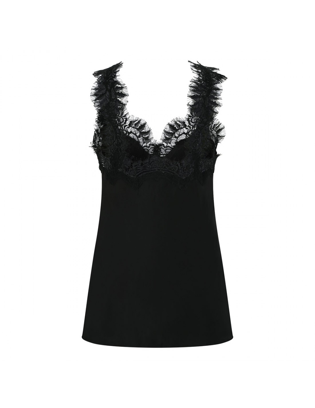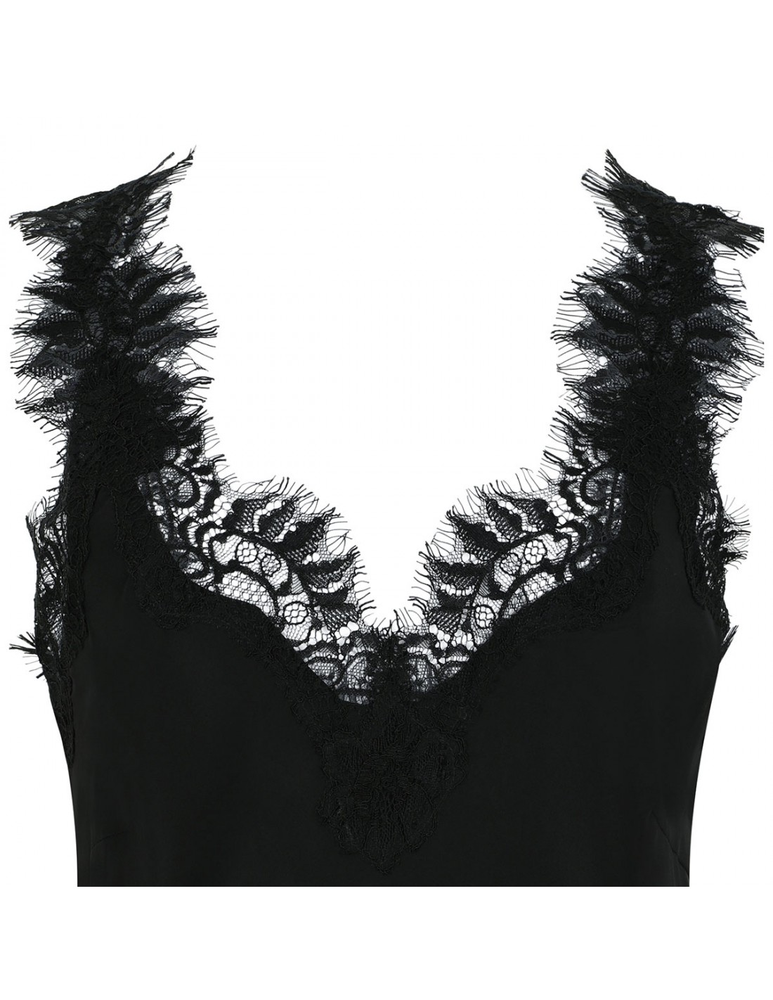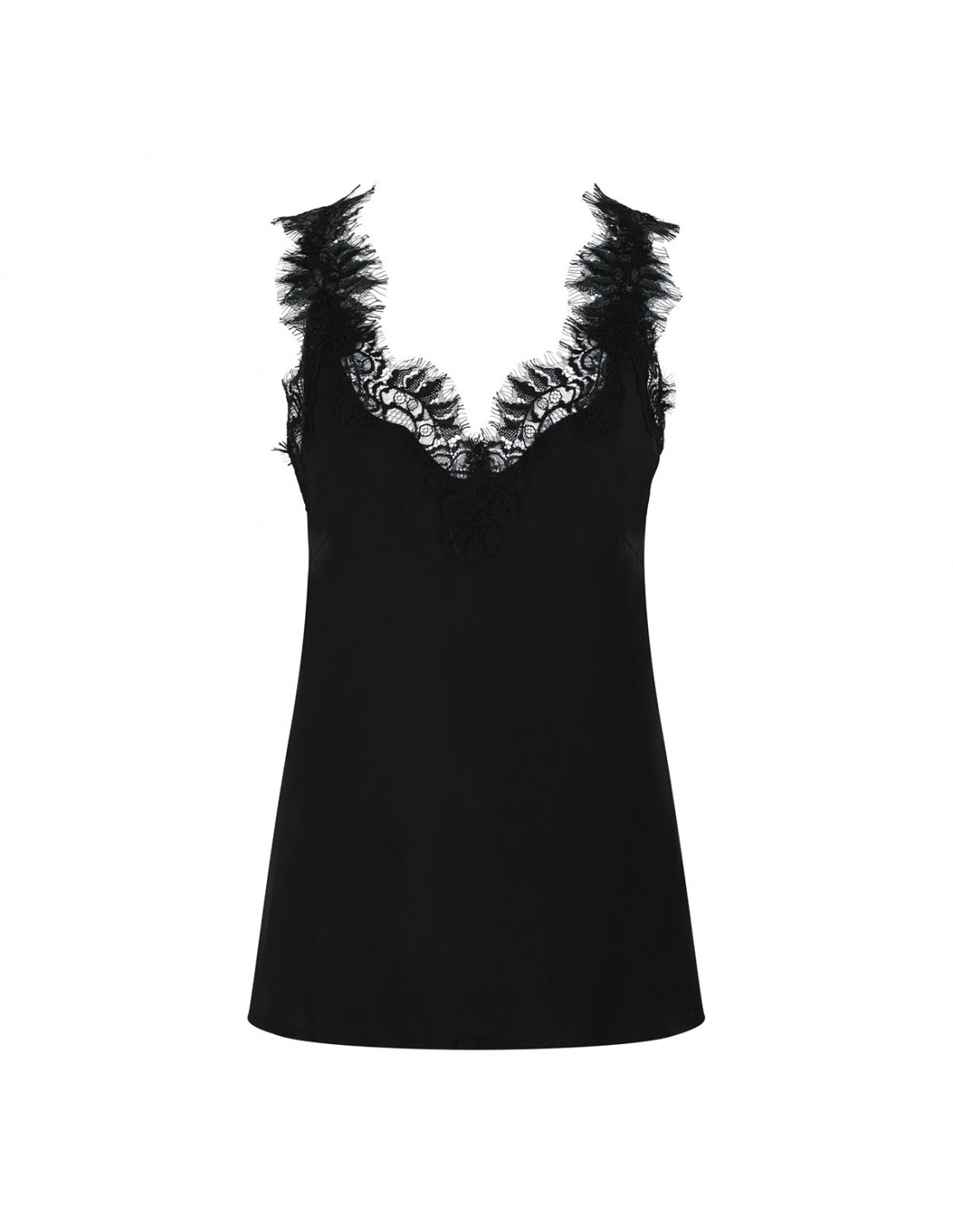 Black silk Megan Coco Megan strap camisole from Gold Hawk featuring bias cut, signature Coco Lace on neckline and straps, V-neck, sleeveless silhouette.