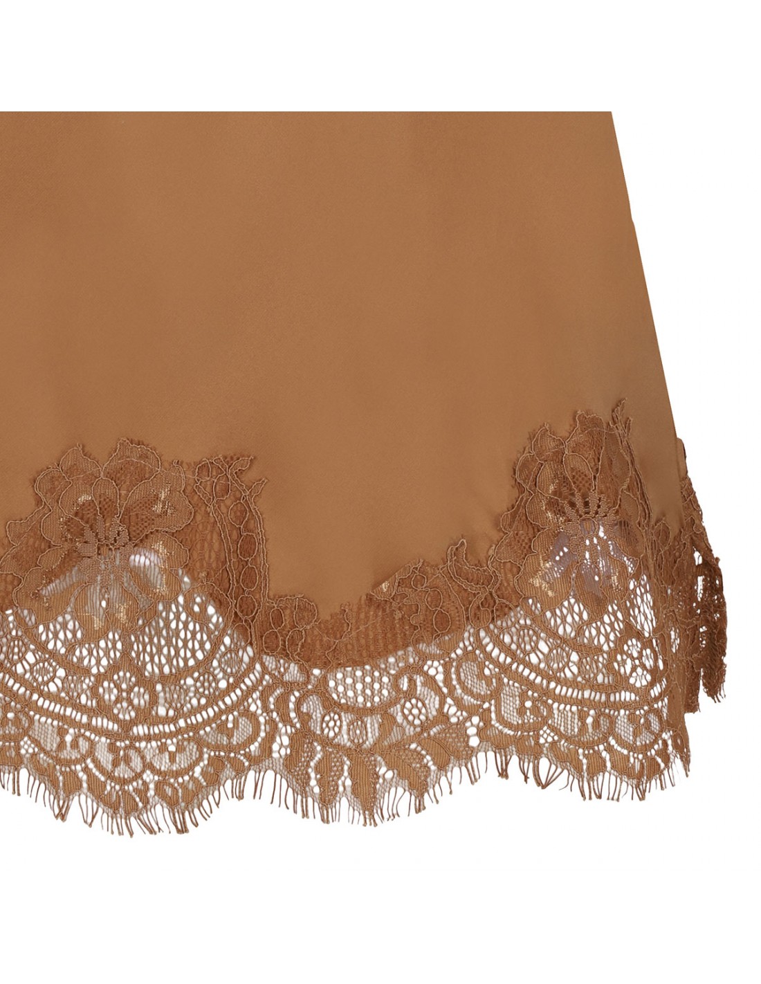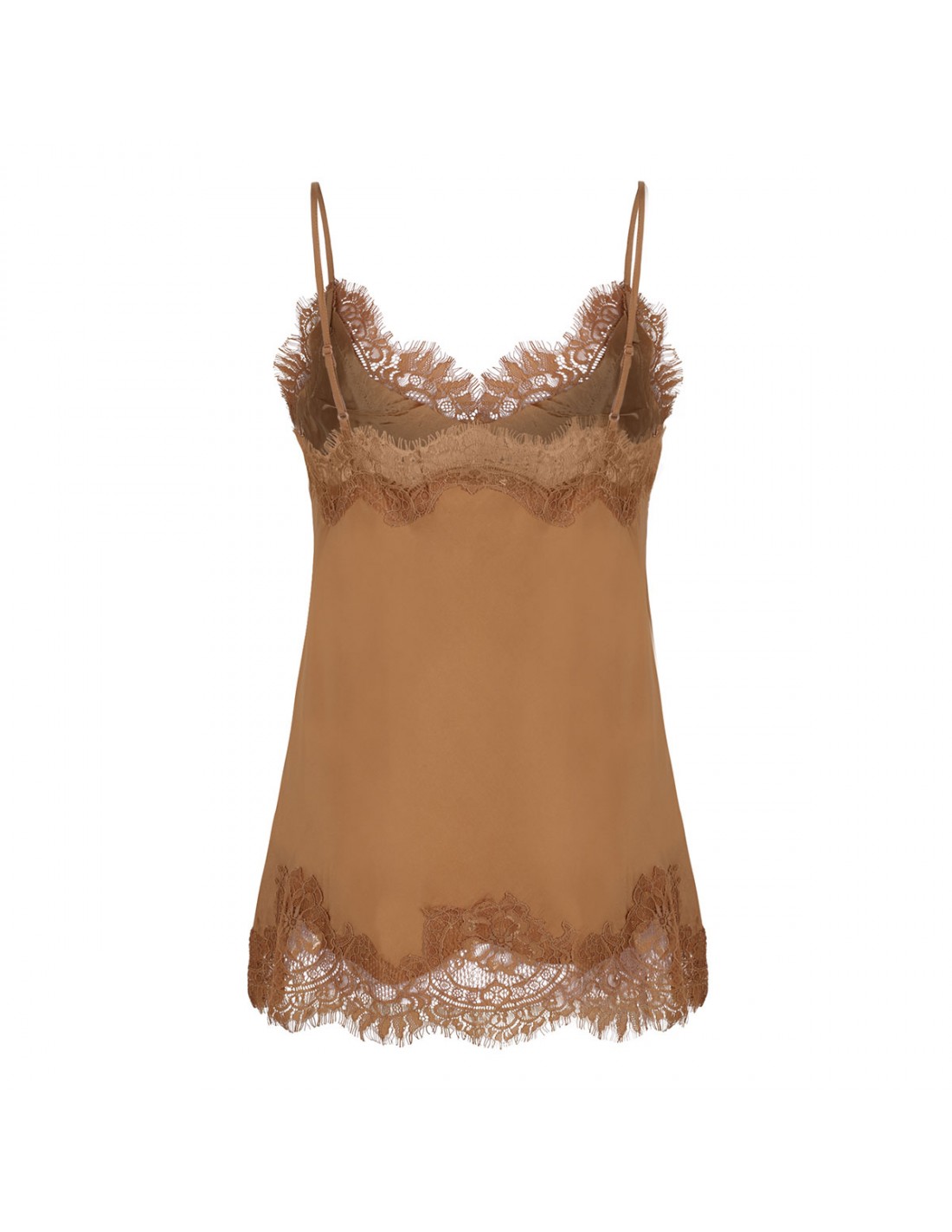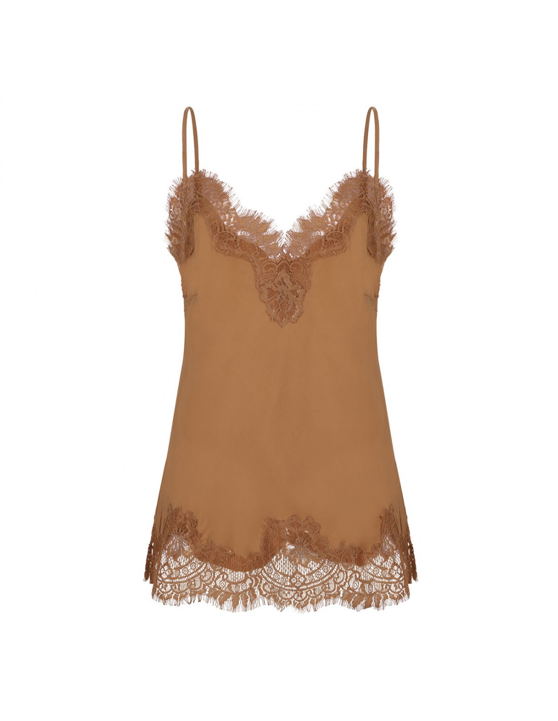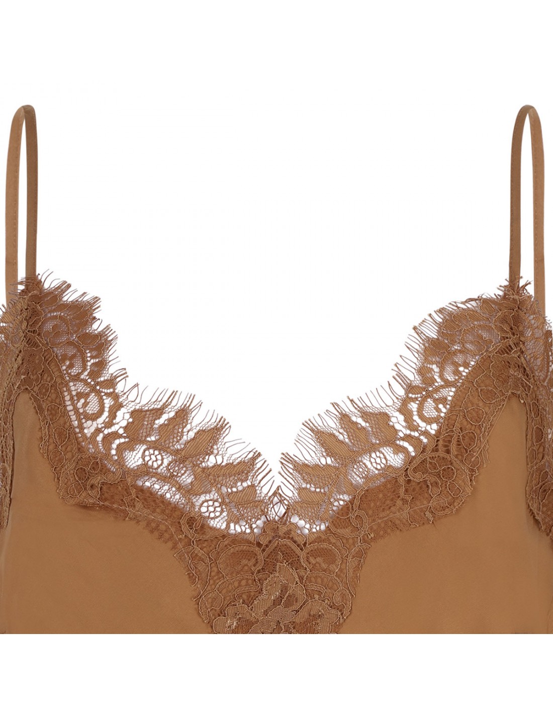 Butter camel silk Coco lace camisole from Gold Hawk featuring signature Coco Lace on neckline and hem, V-neck, sleeveless silhouette. spaghetti straps.