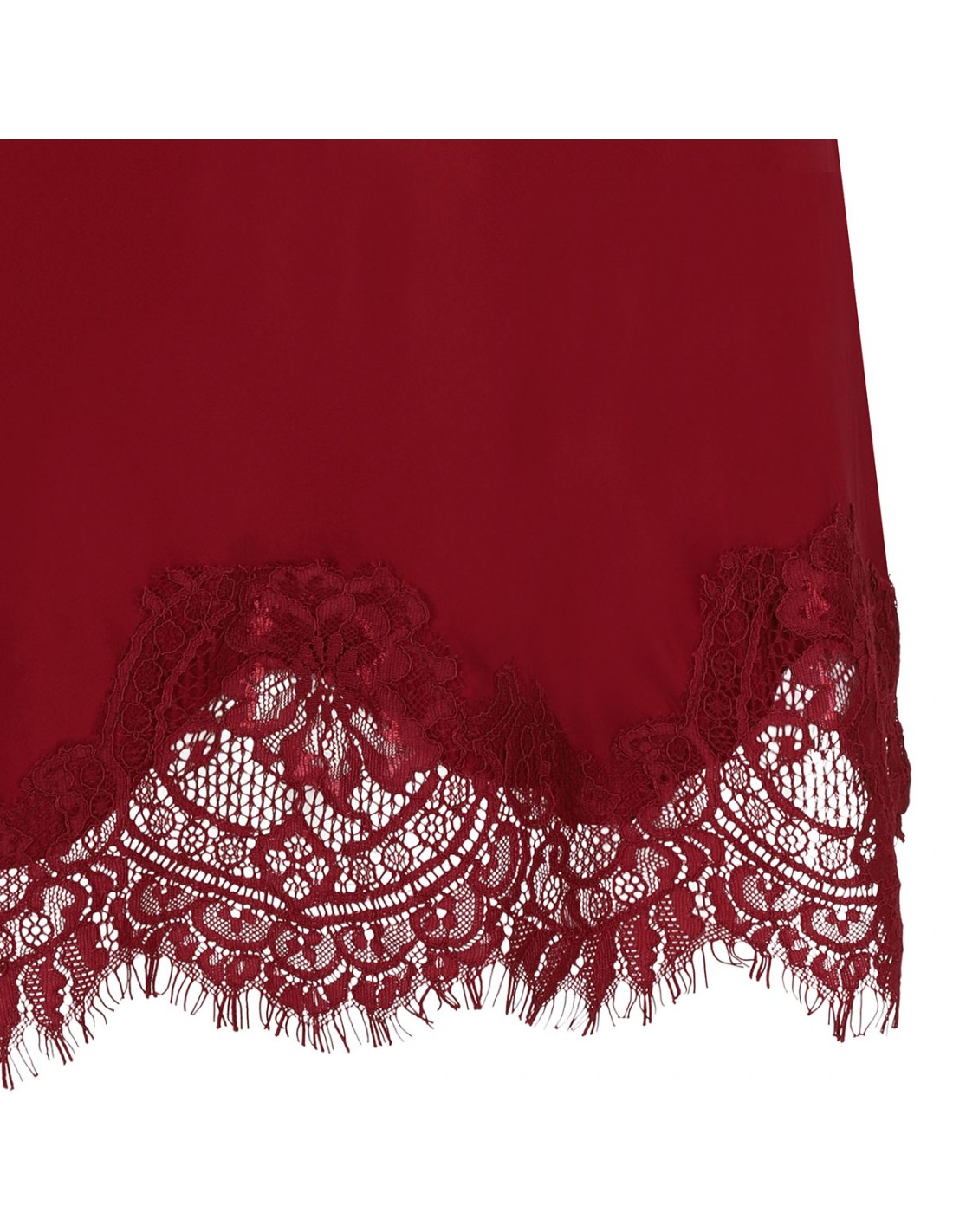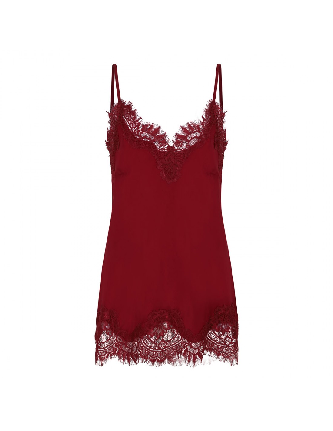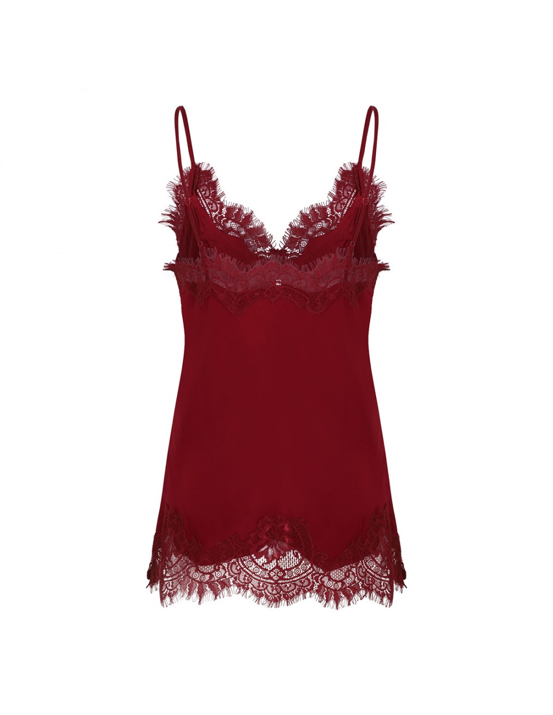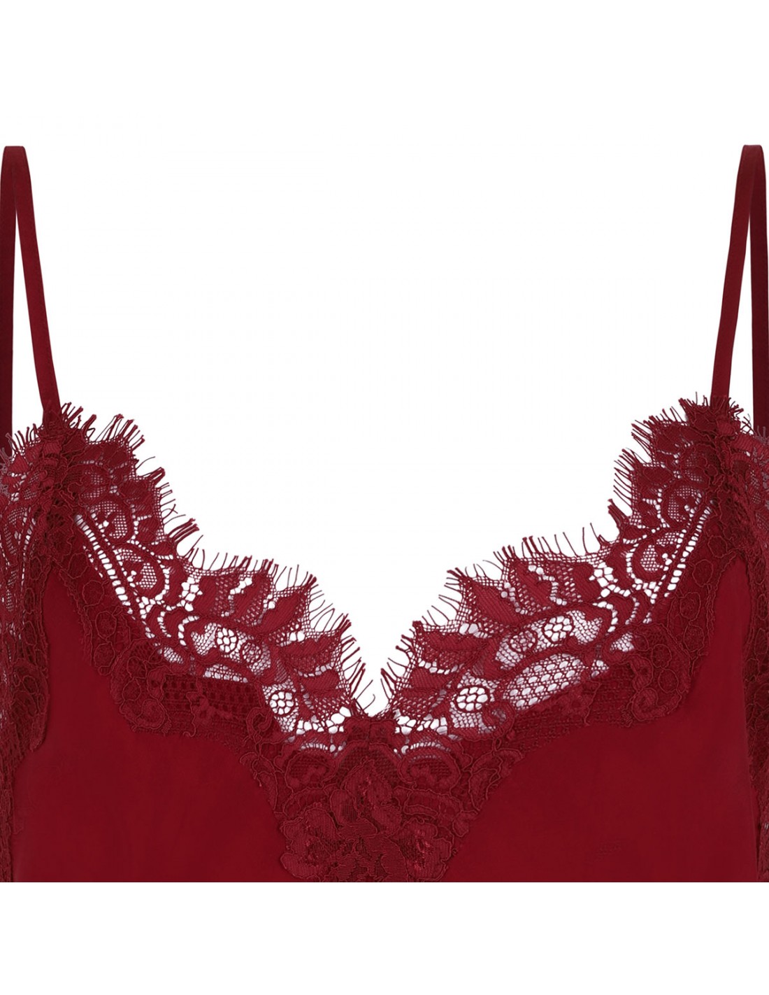 Pomegranate hue silk Coco lace camisole from Gold Hawk featuring signature Coco Lace on neckline and hem, V-neck, sleeveless silhouette. spaghetti straps.