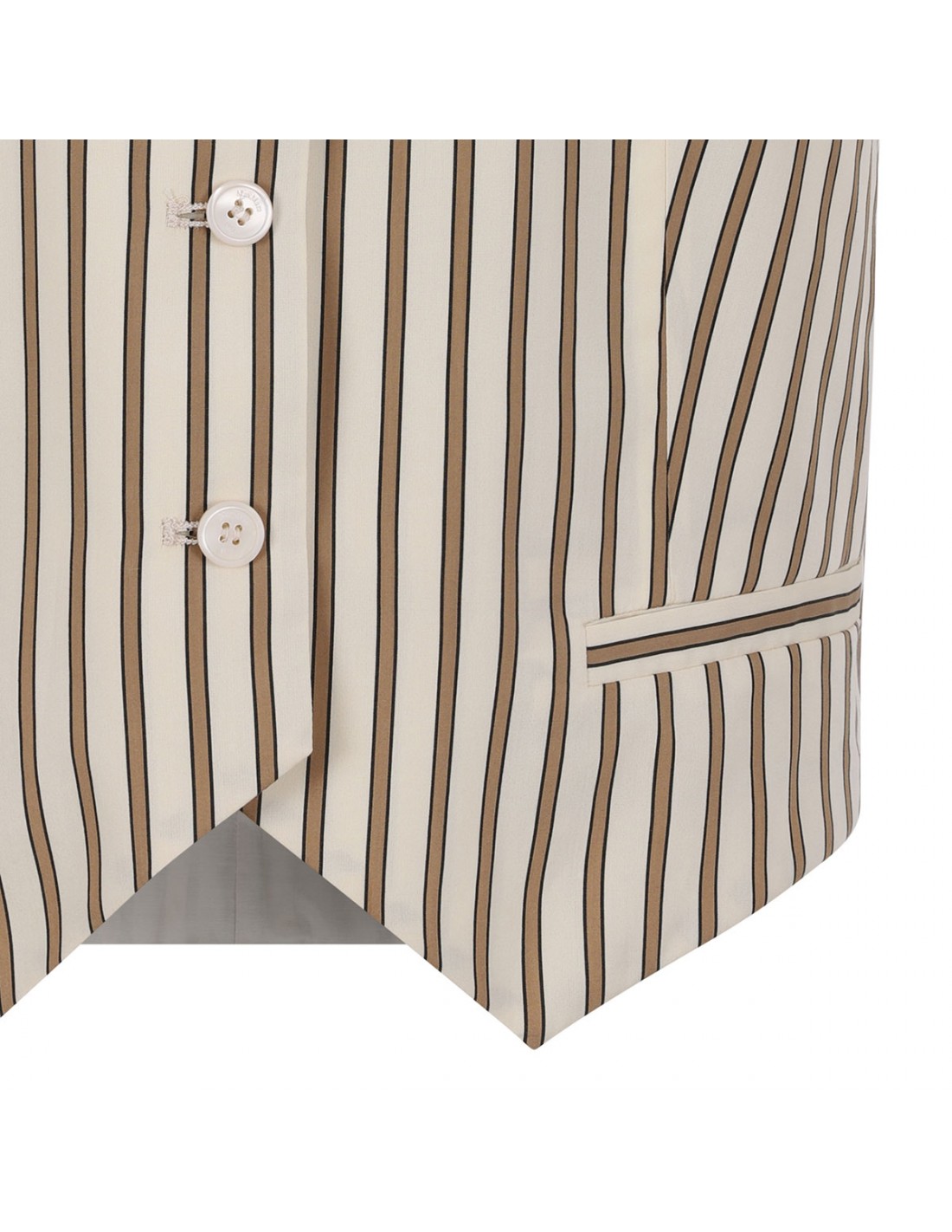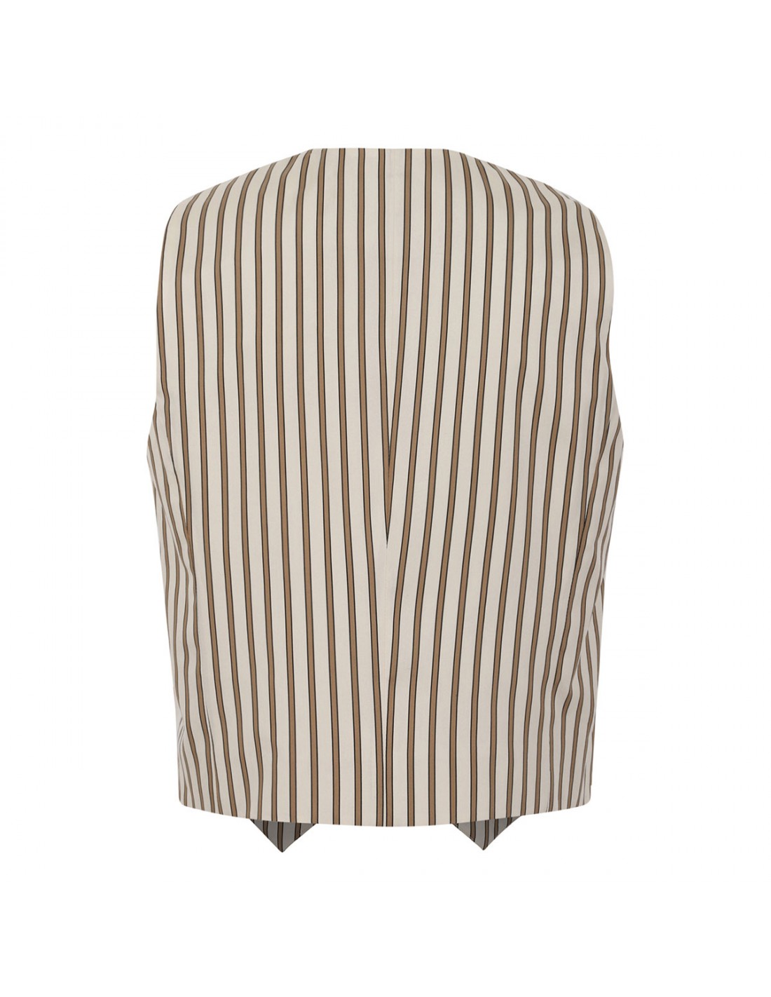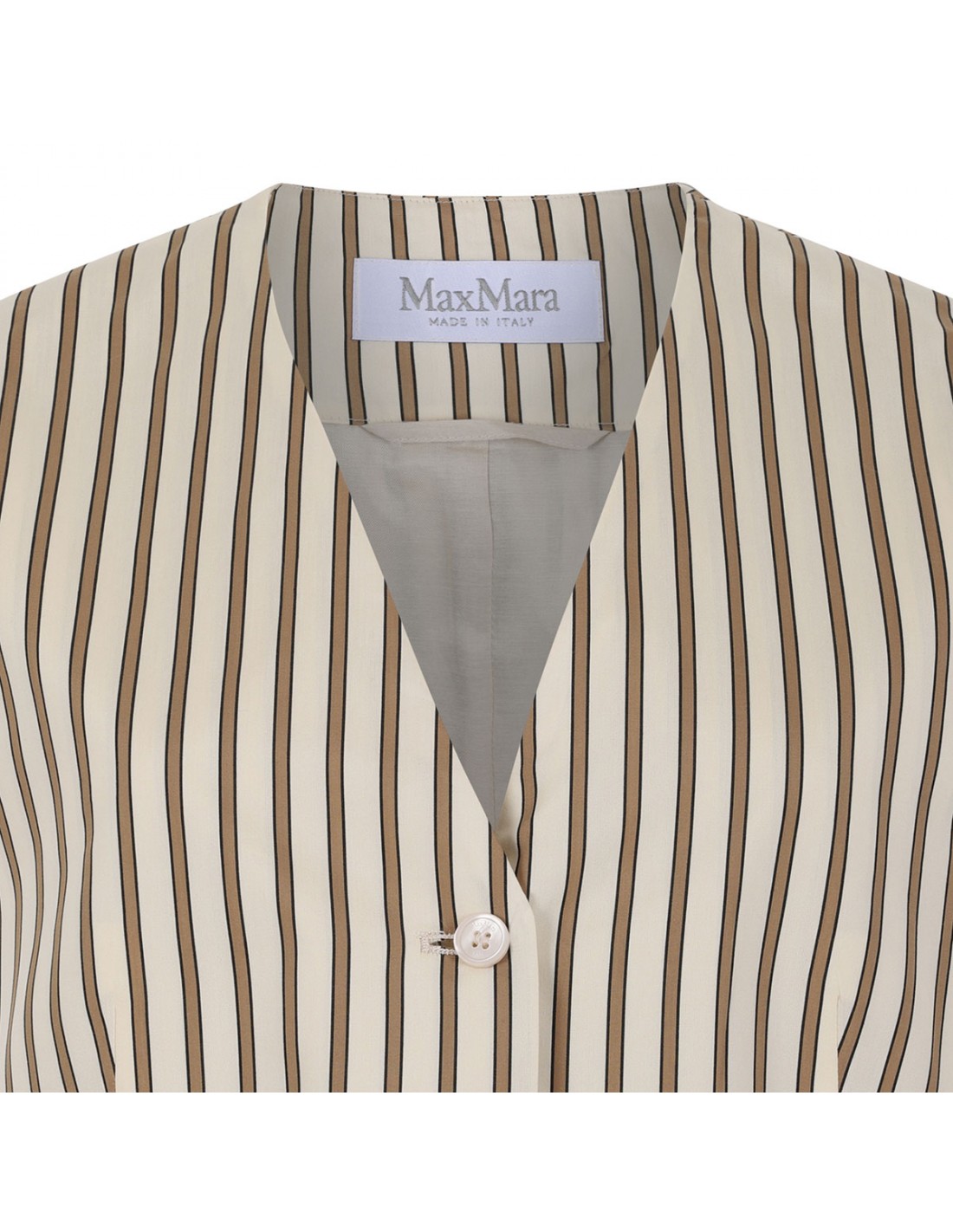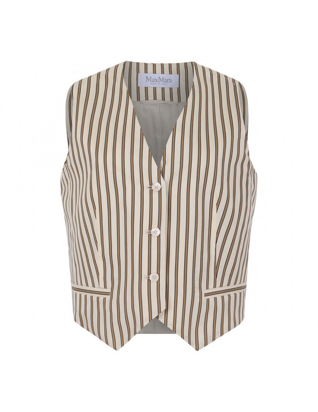 Beige cotton and silk canvas Fauno vest from Max Mara featuring striped motif, V-neckline, mother-of-pearl button fastening, front pockets, darts on front of waist.