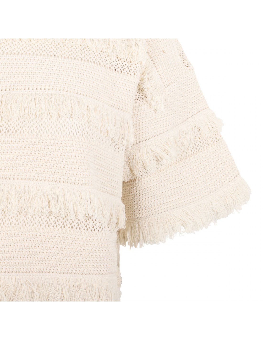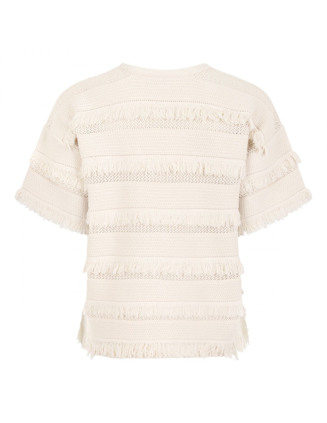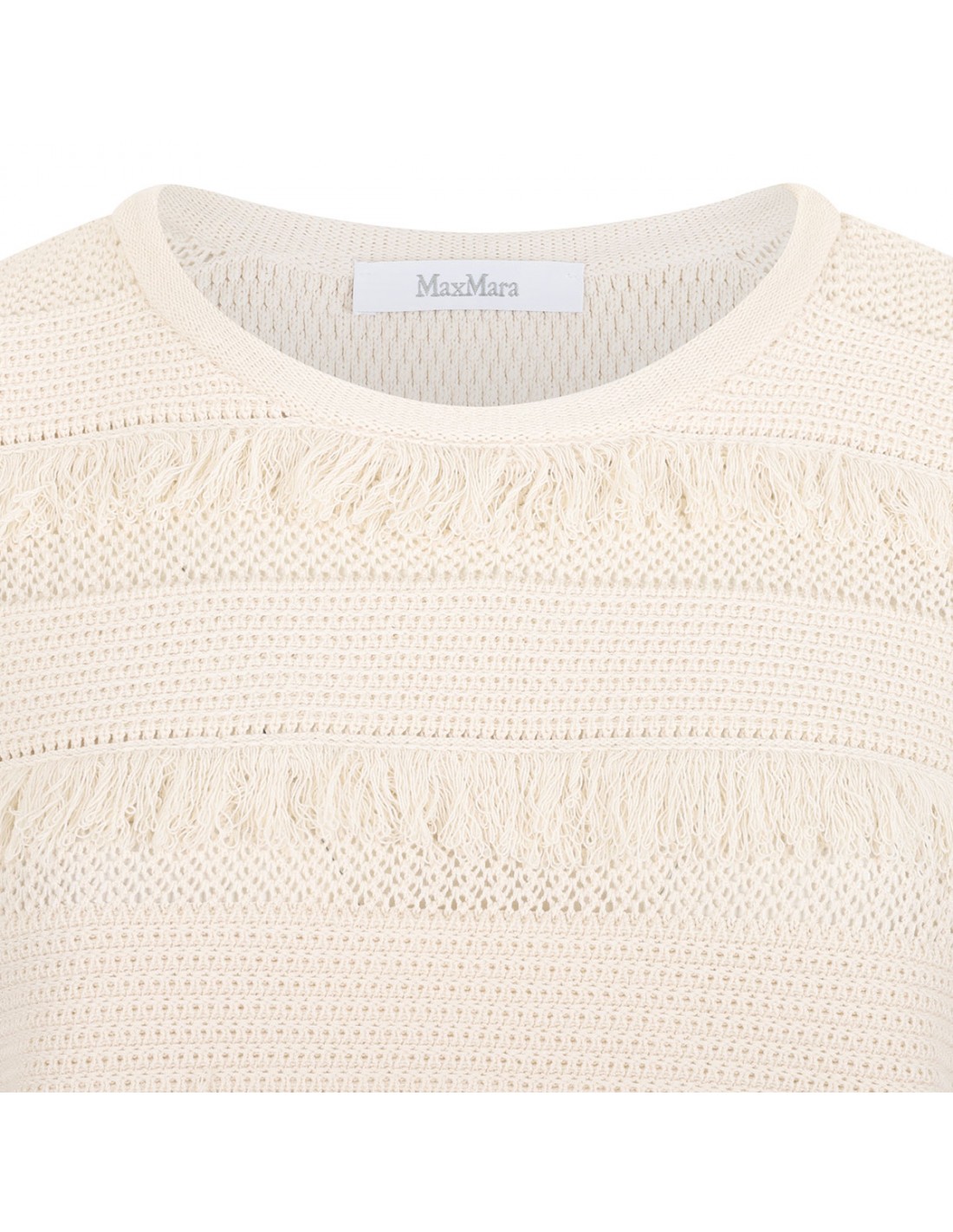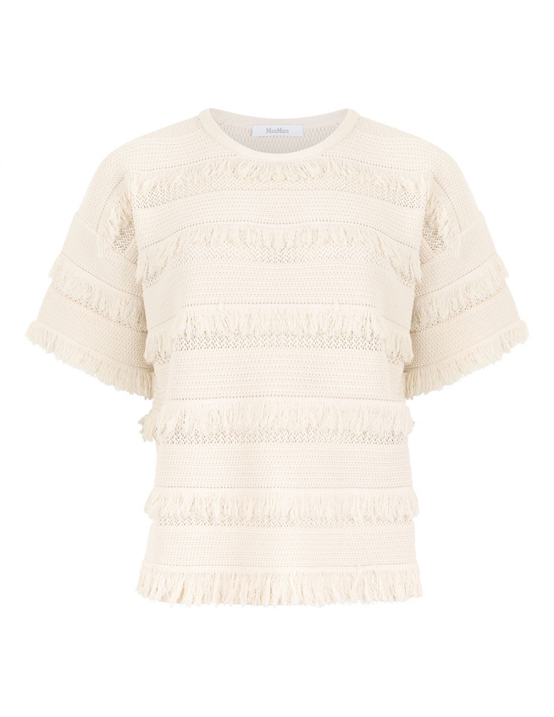 Ivory stretch knit viscose Garza top from Max Mara featuring decorative stitch and fringe motif, crew-neck, short sleeves, dropped shoulders, oversized fit, straight hem.