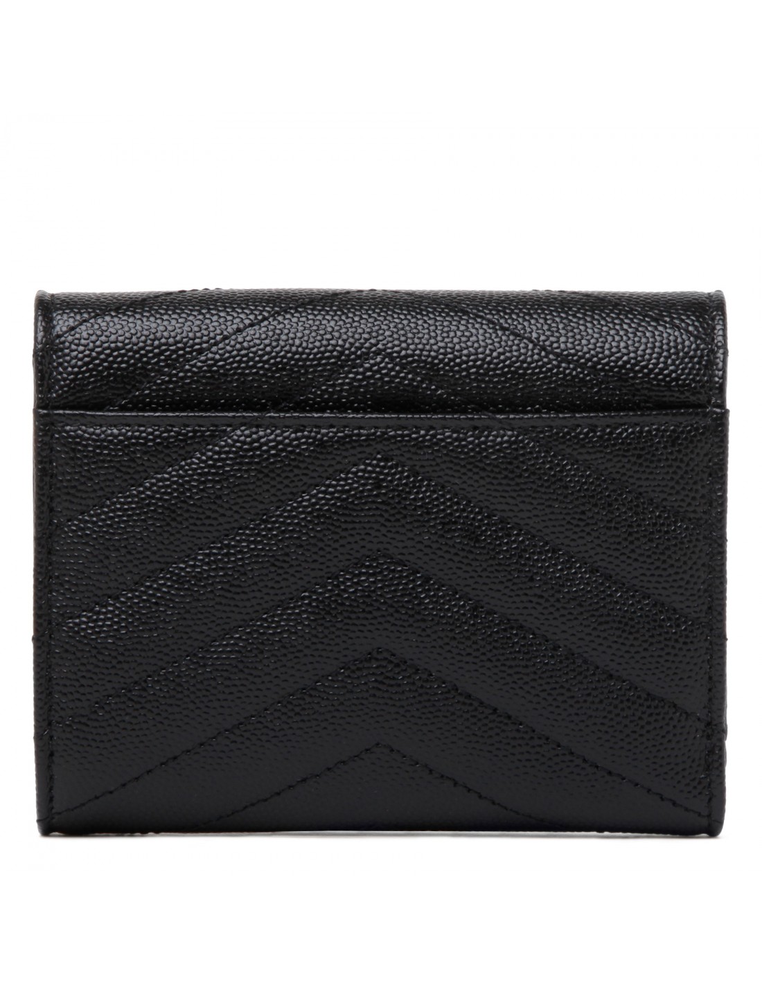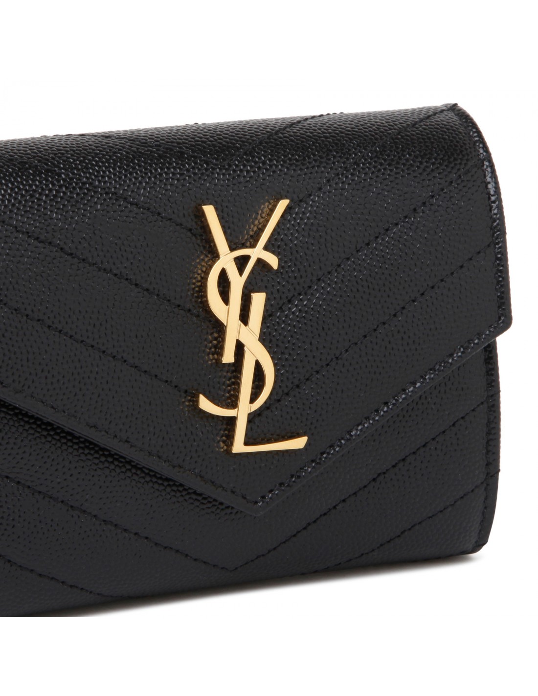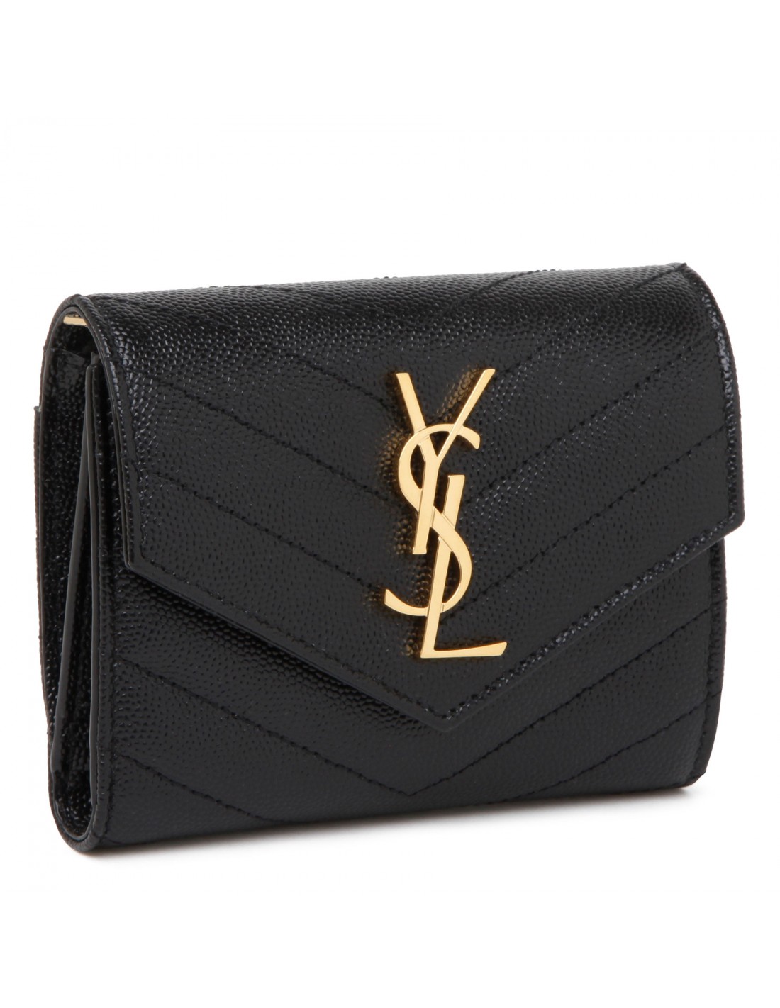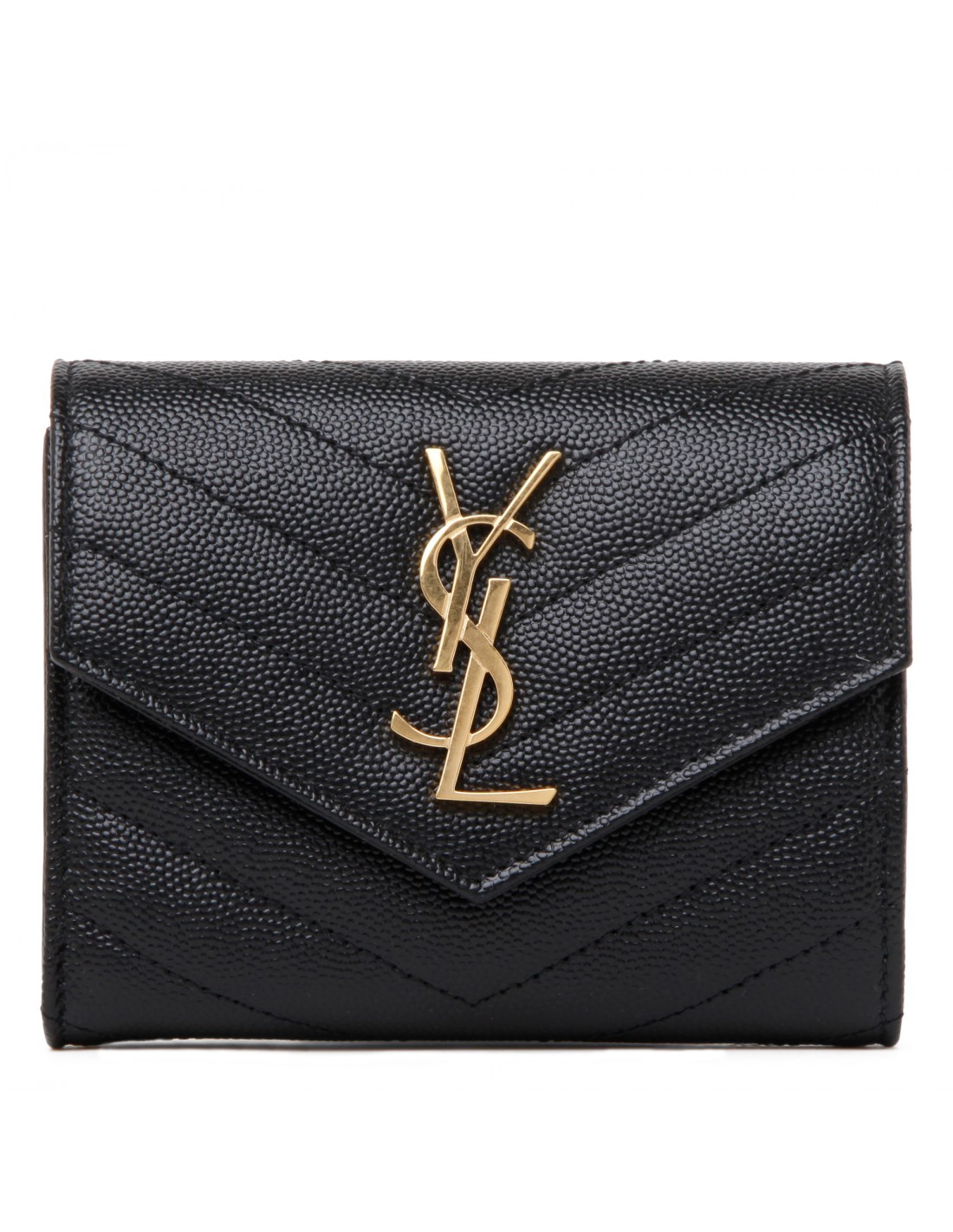 Black grain de poudre matelassé leather compact tri fold wallet from Saint Laurent featuring gold-tone metal Cassandre and hardware, quilted overstitching, snap button closure, slit pocket on back, internal six card slots, one zipped coin pocket, one bill compartment and four receipt compartments.
