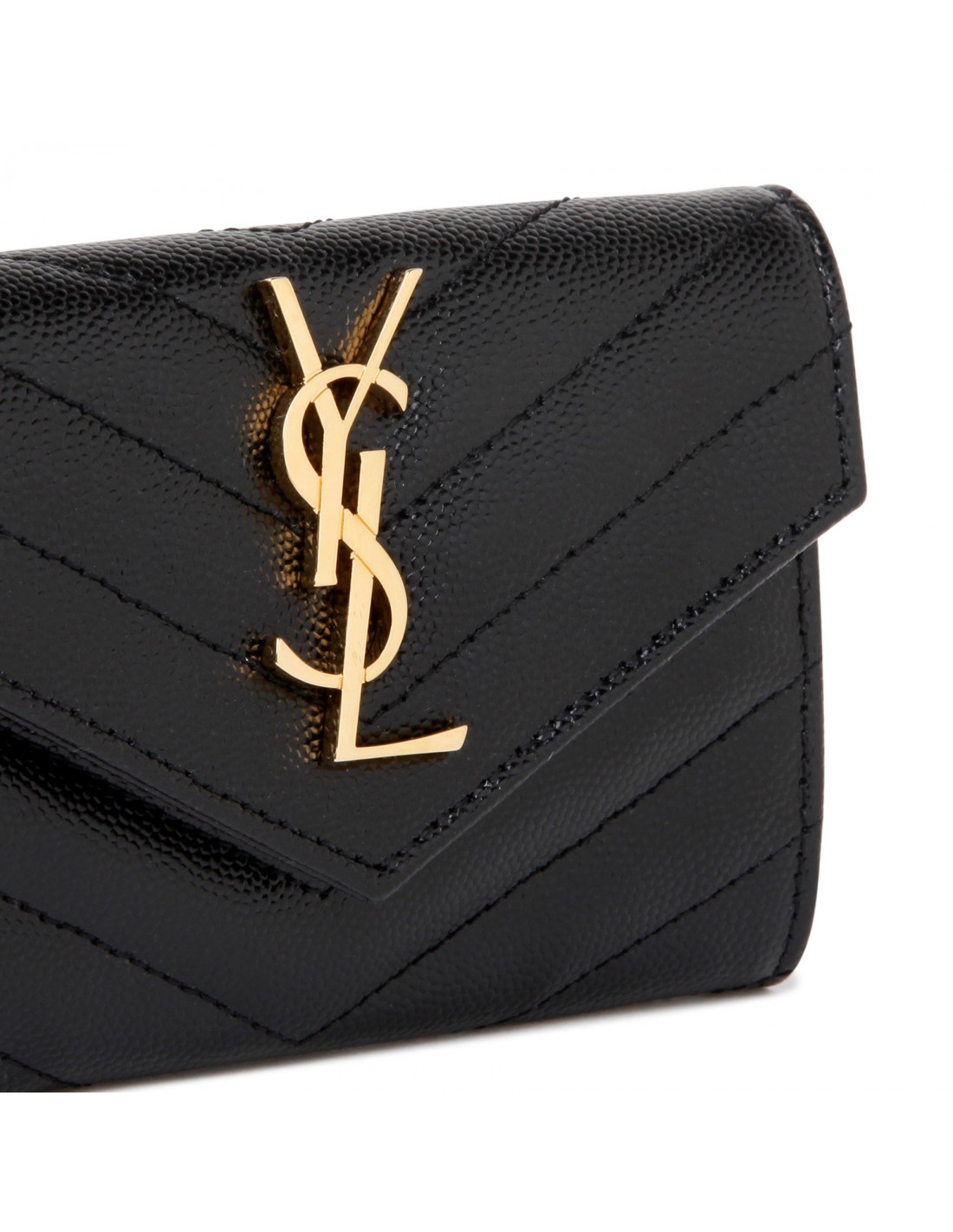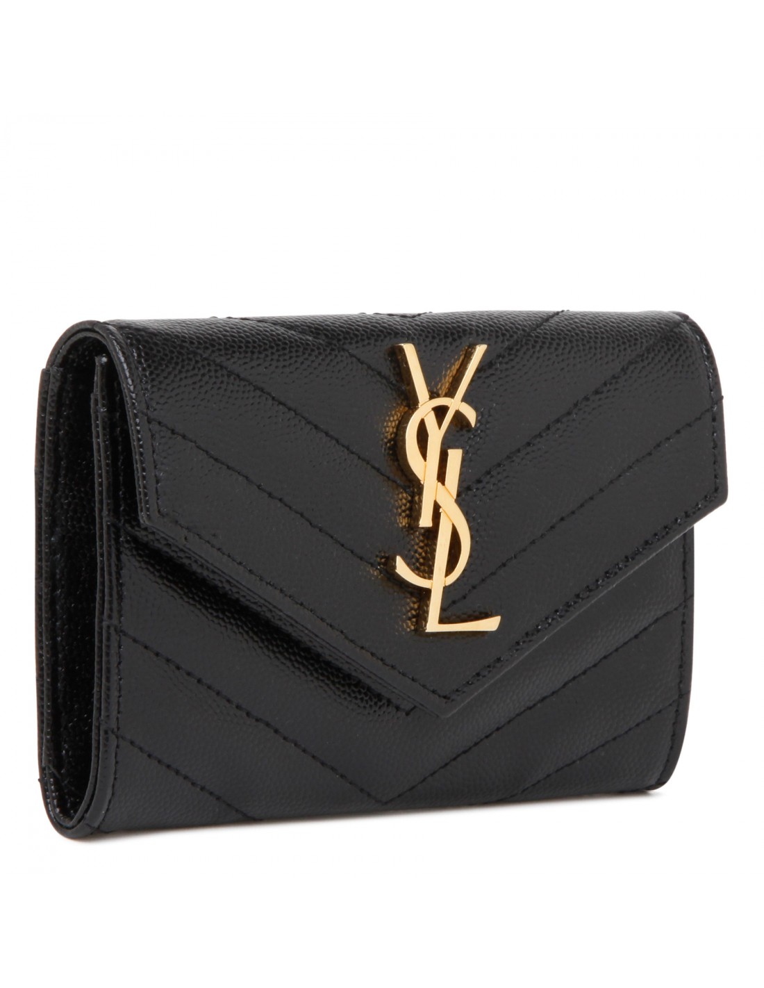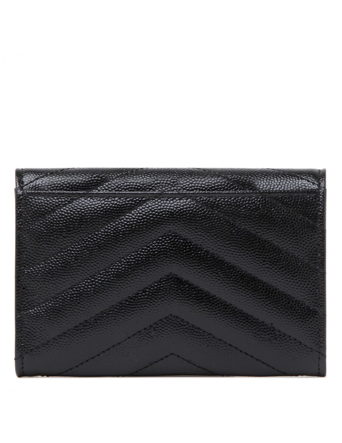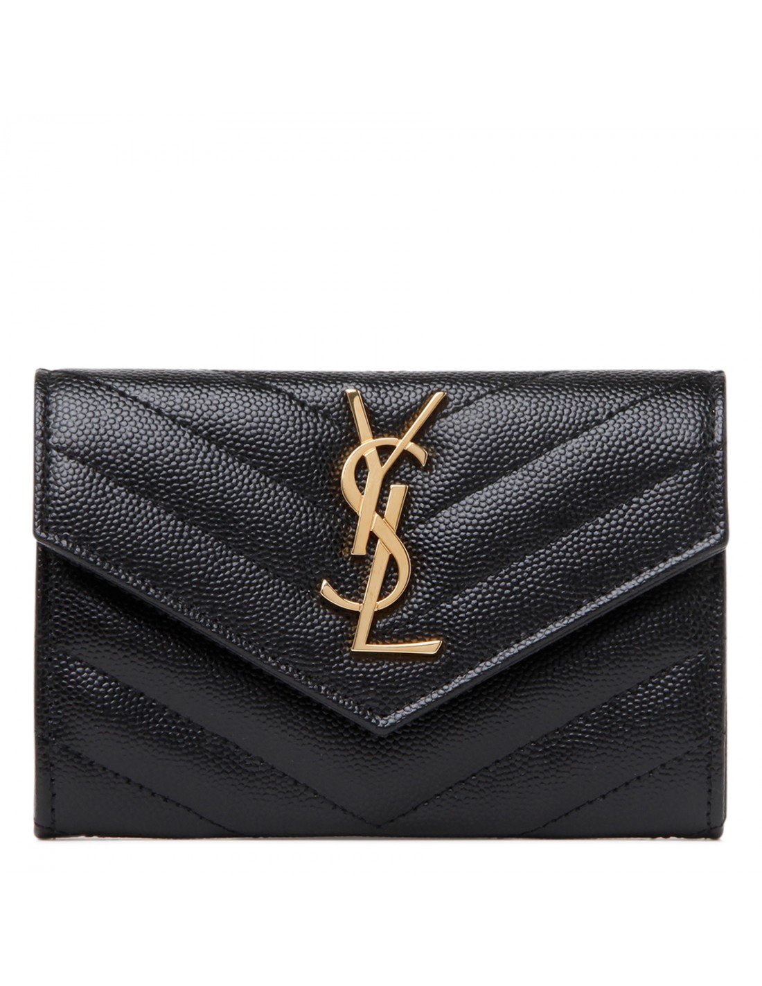 Black grain de poudre matelassé leather Cassandre small envelope wallet from Saint Laurent featuring iconic chevron quilting, cassandre embellishment, snap closure, external back slot pocket, four card slots, one open compartment.