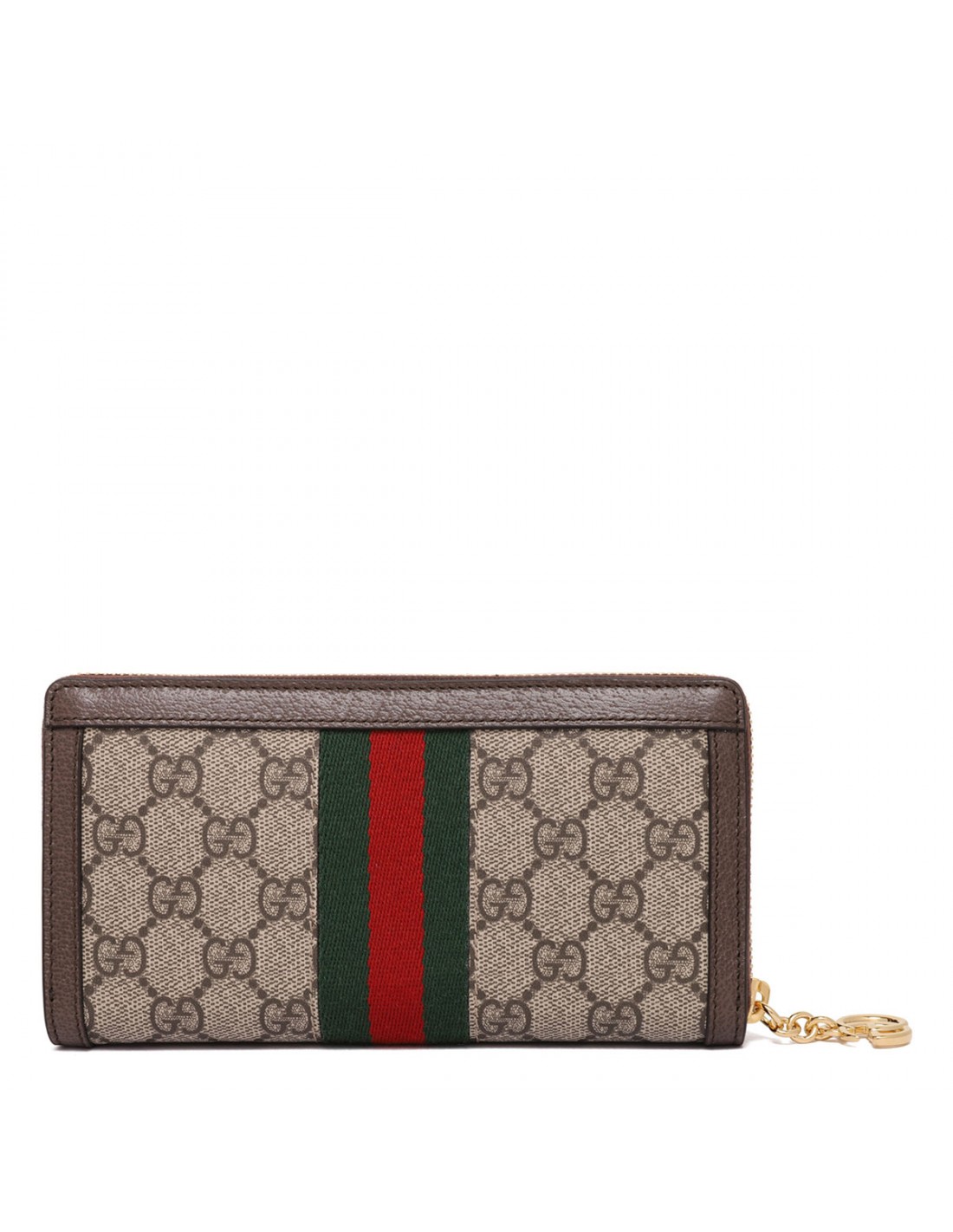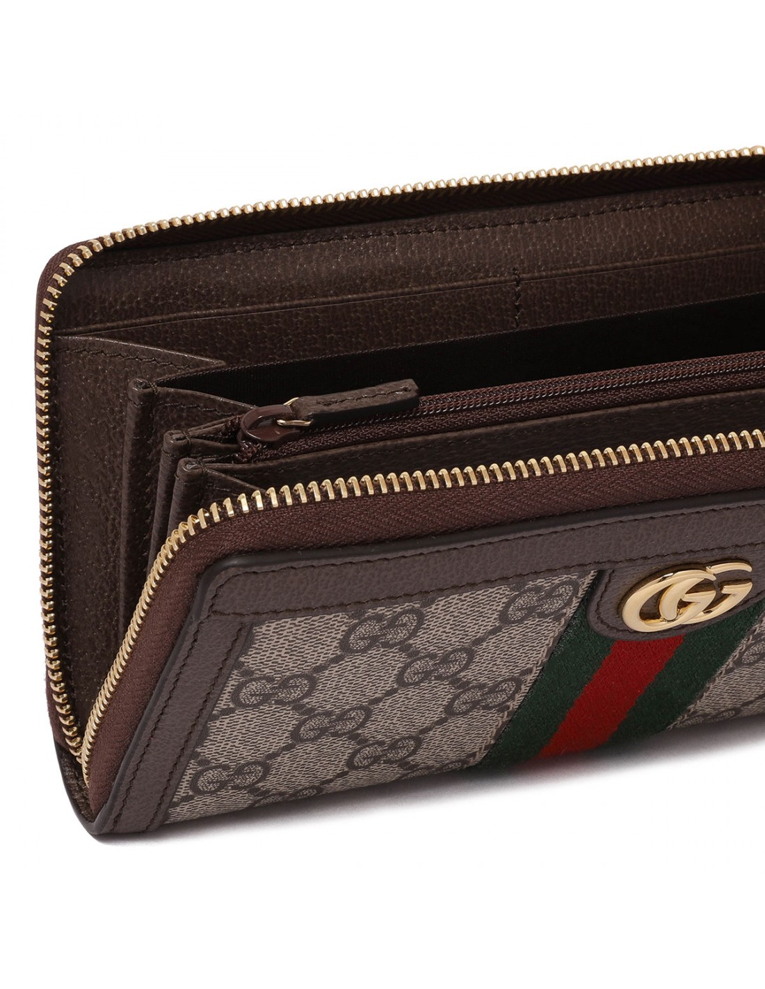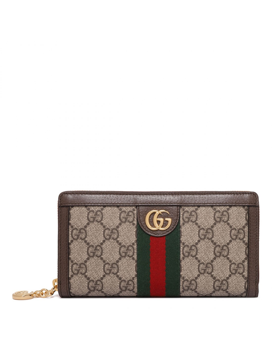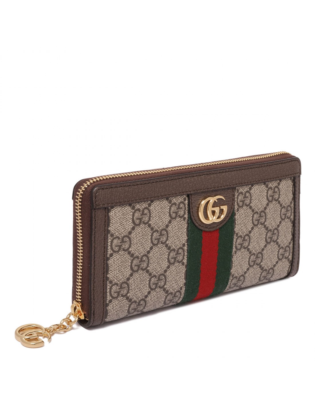 Beige and brown Supreme Ophidia wallet from Gucci featuring GG motif, brown leather trim, light gold-toned double G and hardware, zip around fastening, eight card slots, one zipped pocket, four small flat pockets.
