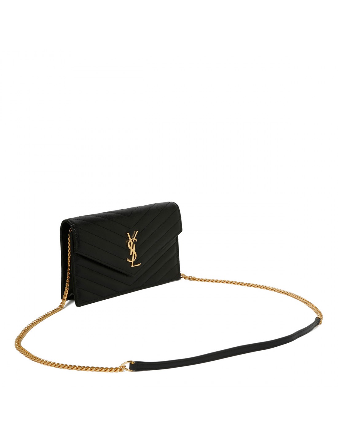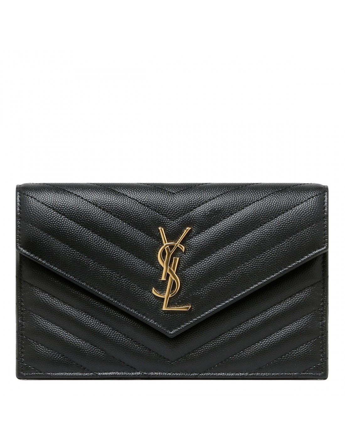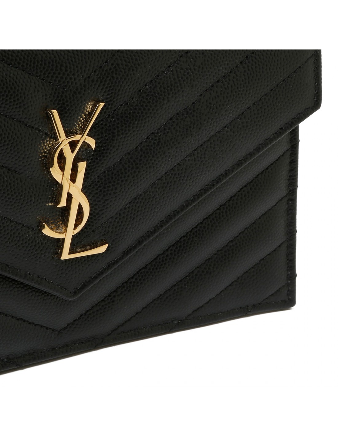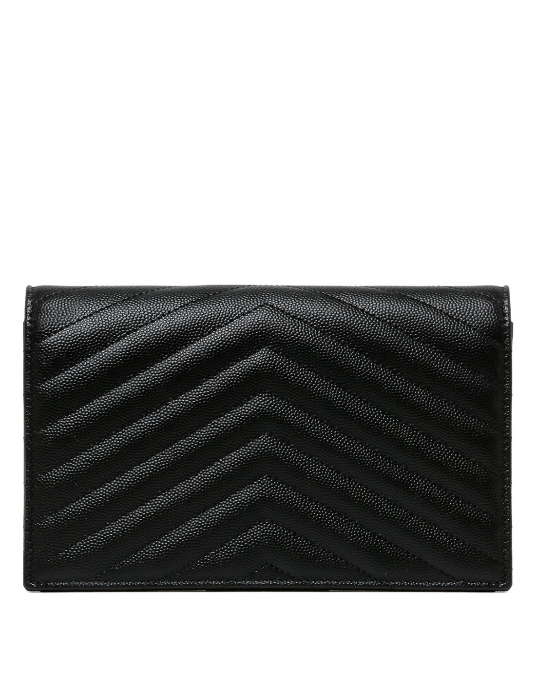 Black grain de poudre embossed leather Cassandre matelassé chain wallet from Saint Laurent featuring flap with interlocking YSL logo, snap fastening, detachable chain shoulder strap, quilted overstitching, six card slots, bill slot central compartment, internal zipped pocket.