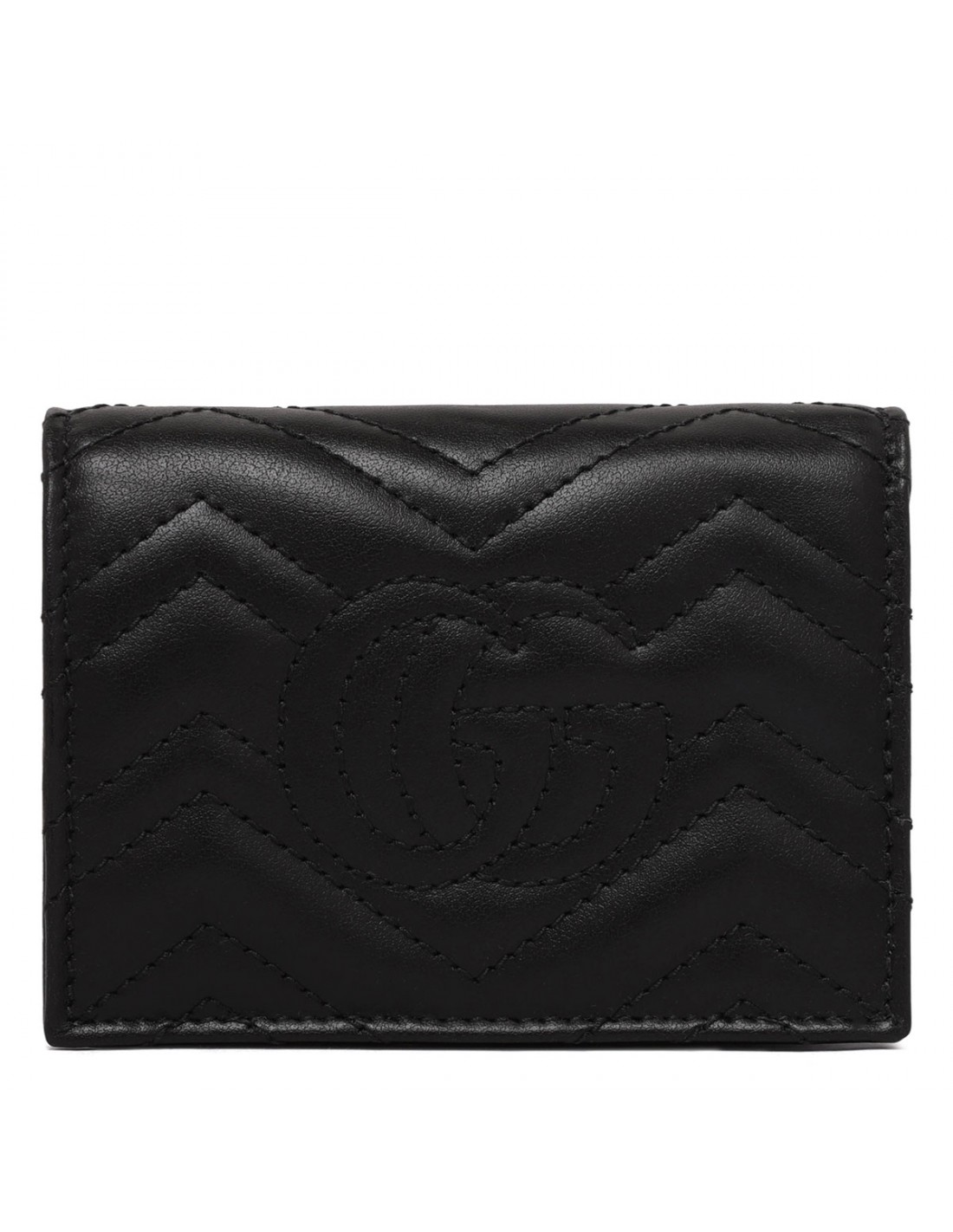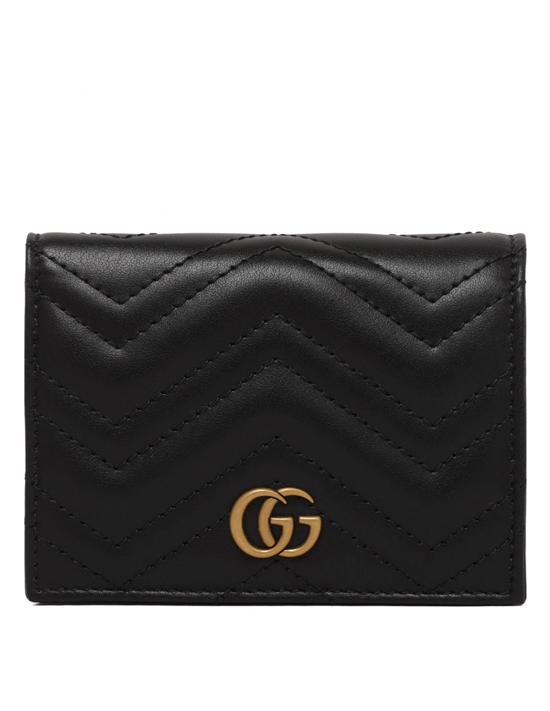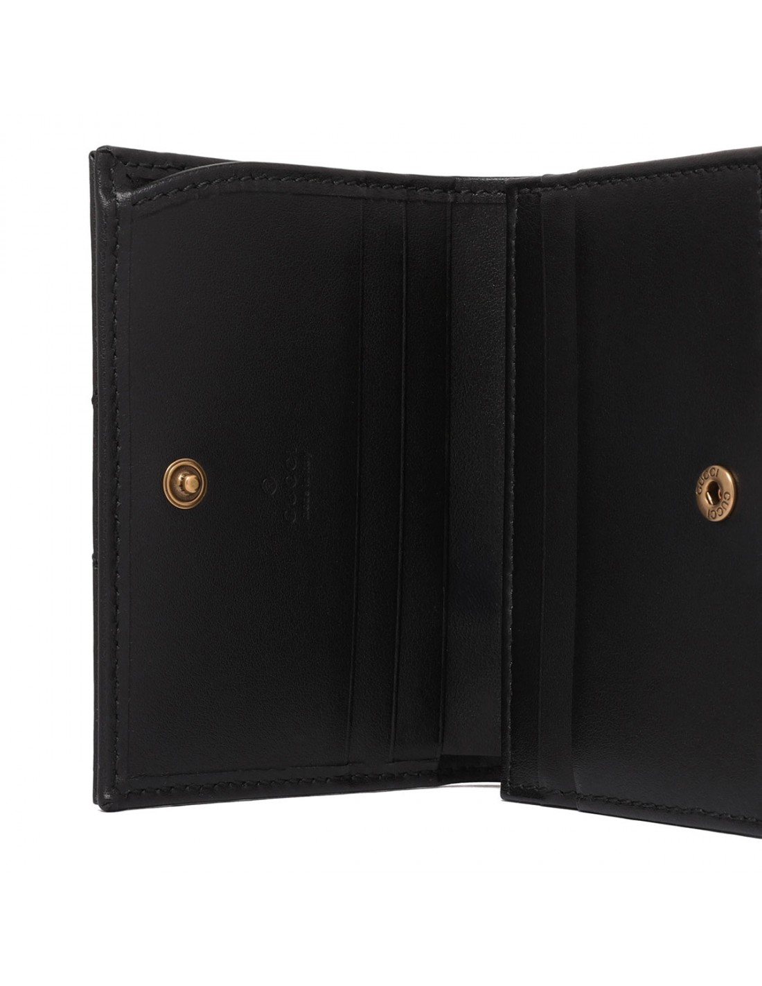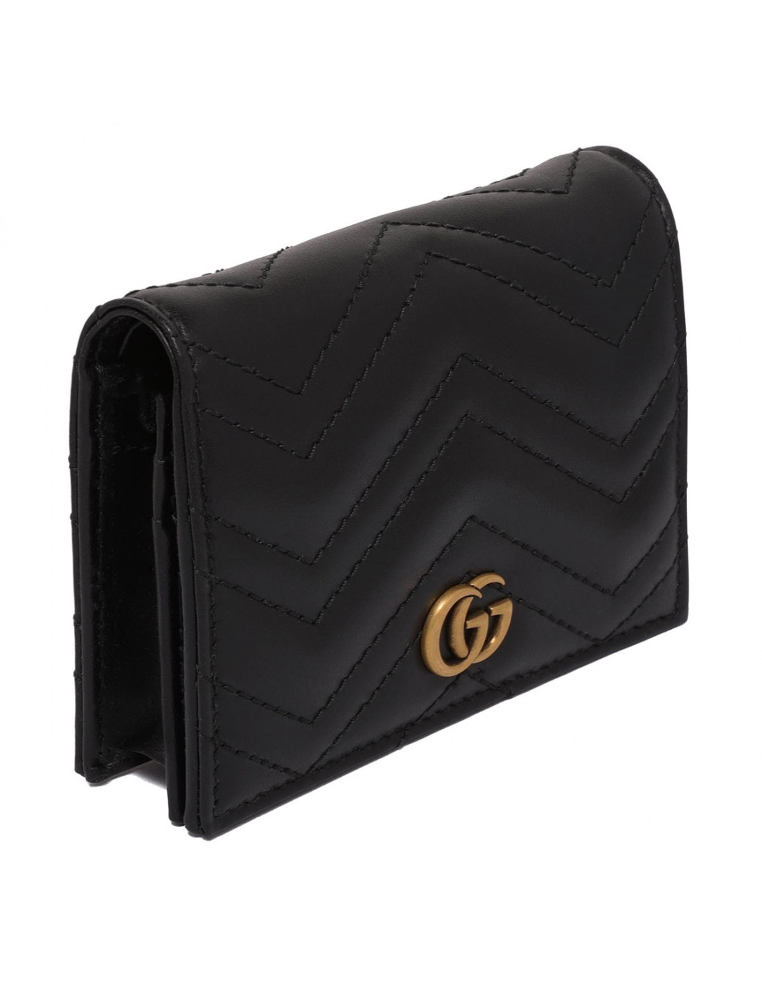 Black matelassé chevron leather GG Marmont card case wallet from Gucci featuring GG on back, antique gold-toned double G and hardware, snap button closure, five card slots, open pocket, one zipped pocket, one bill compartment.