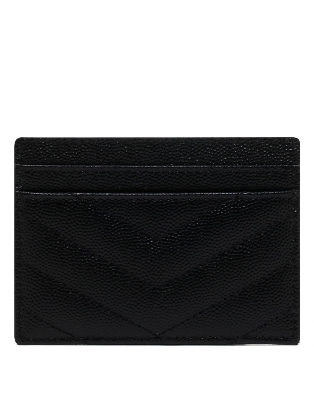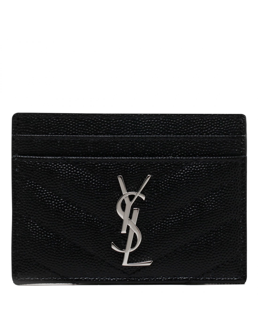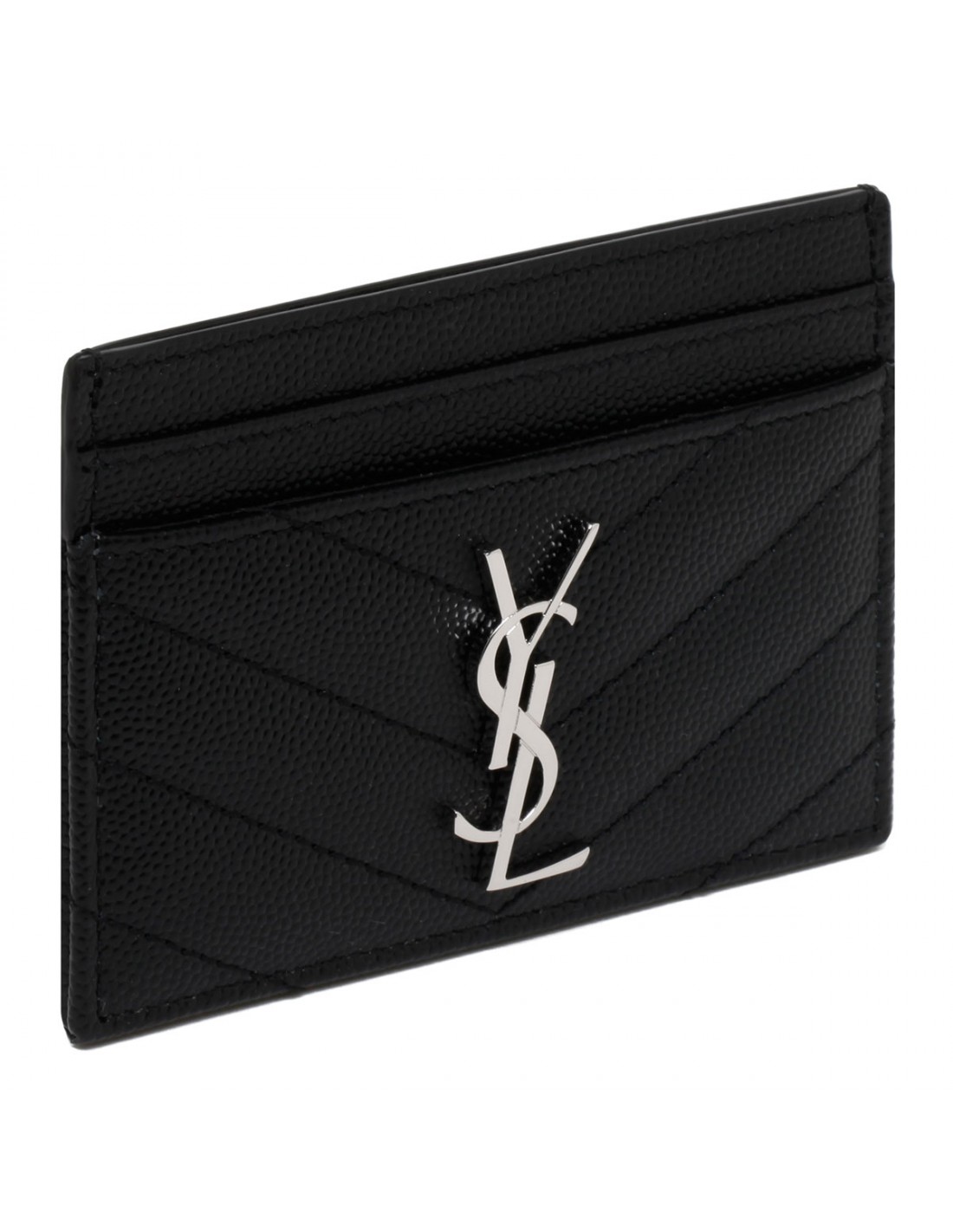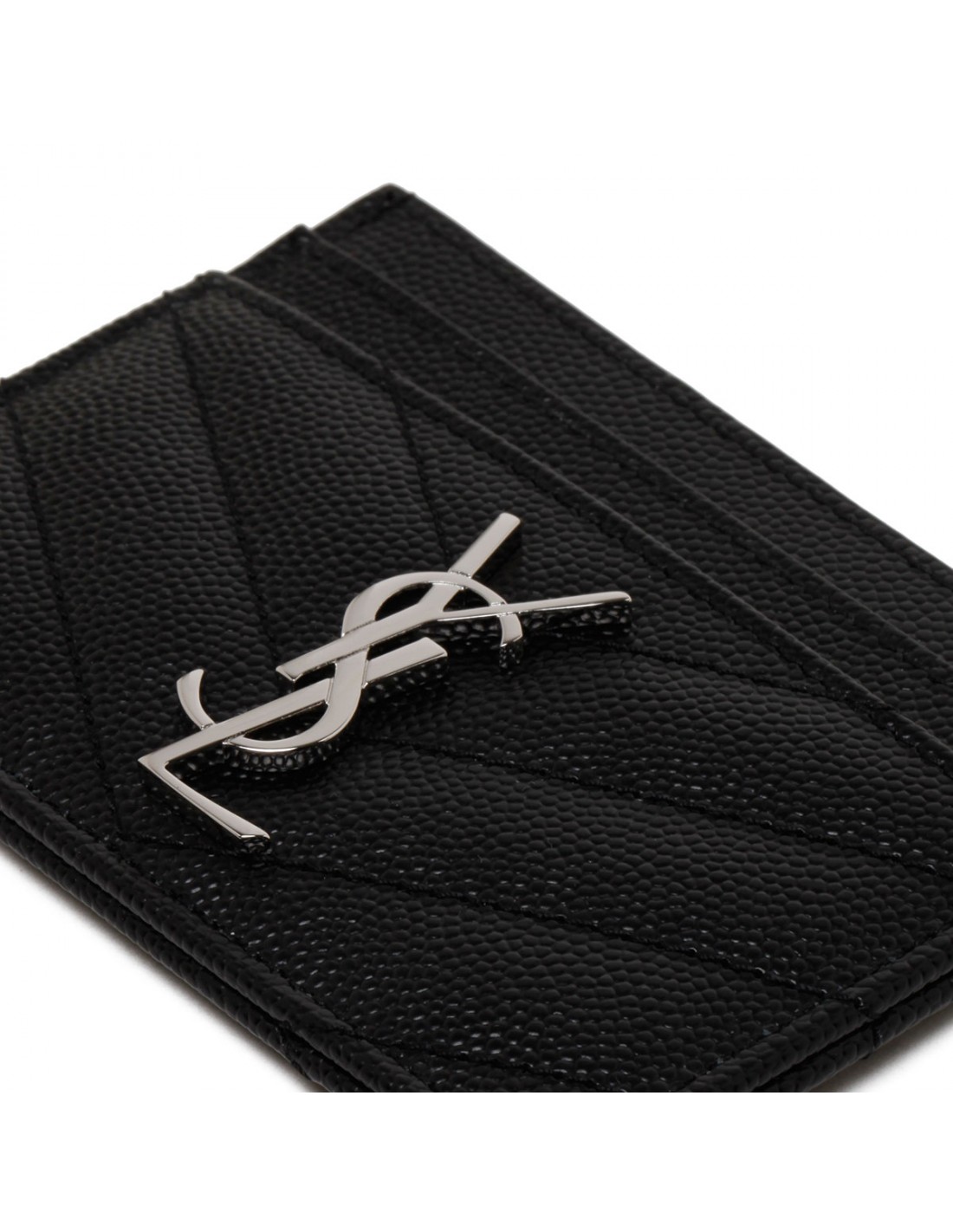 Black matelassé grained leather Cassandre card holder from Saint Laurent featuring silver metal interlaced YSL logo, quilted overstitching, silver-toned hardware and five card slots.