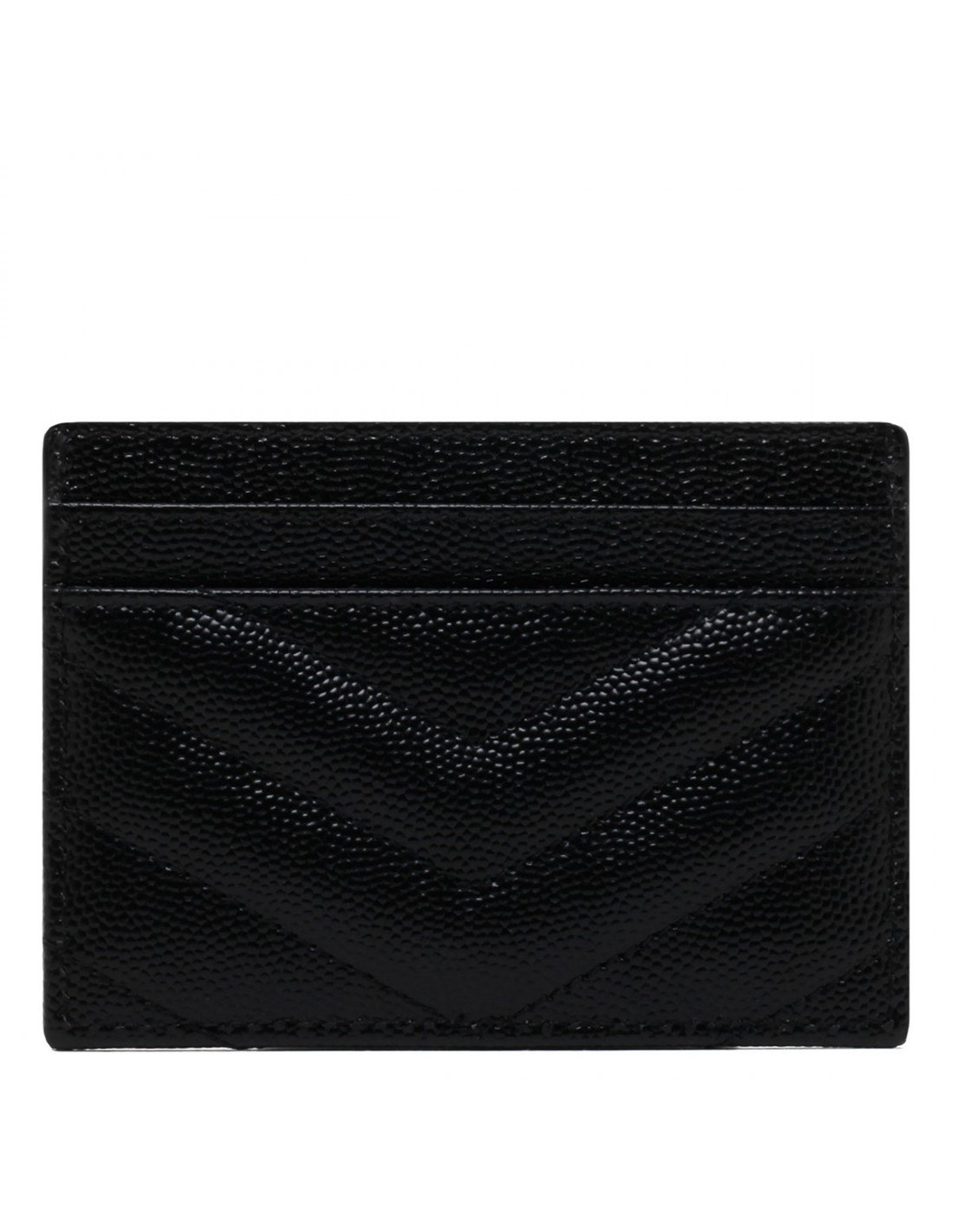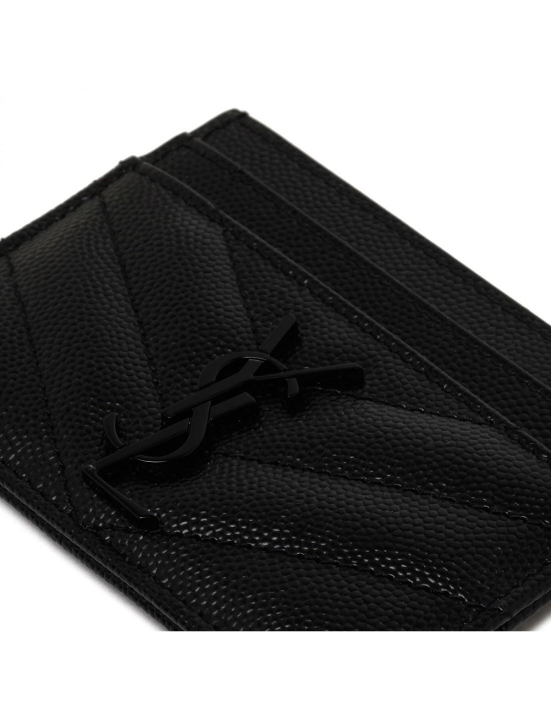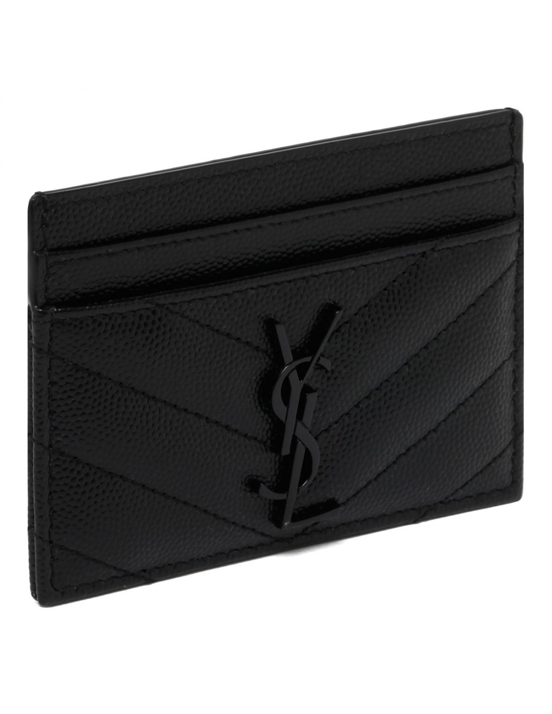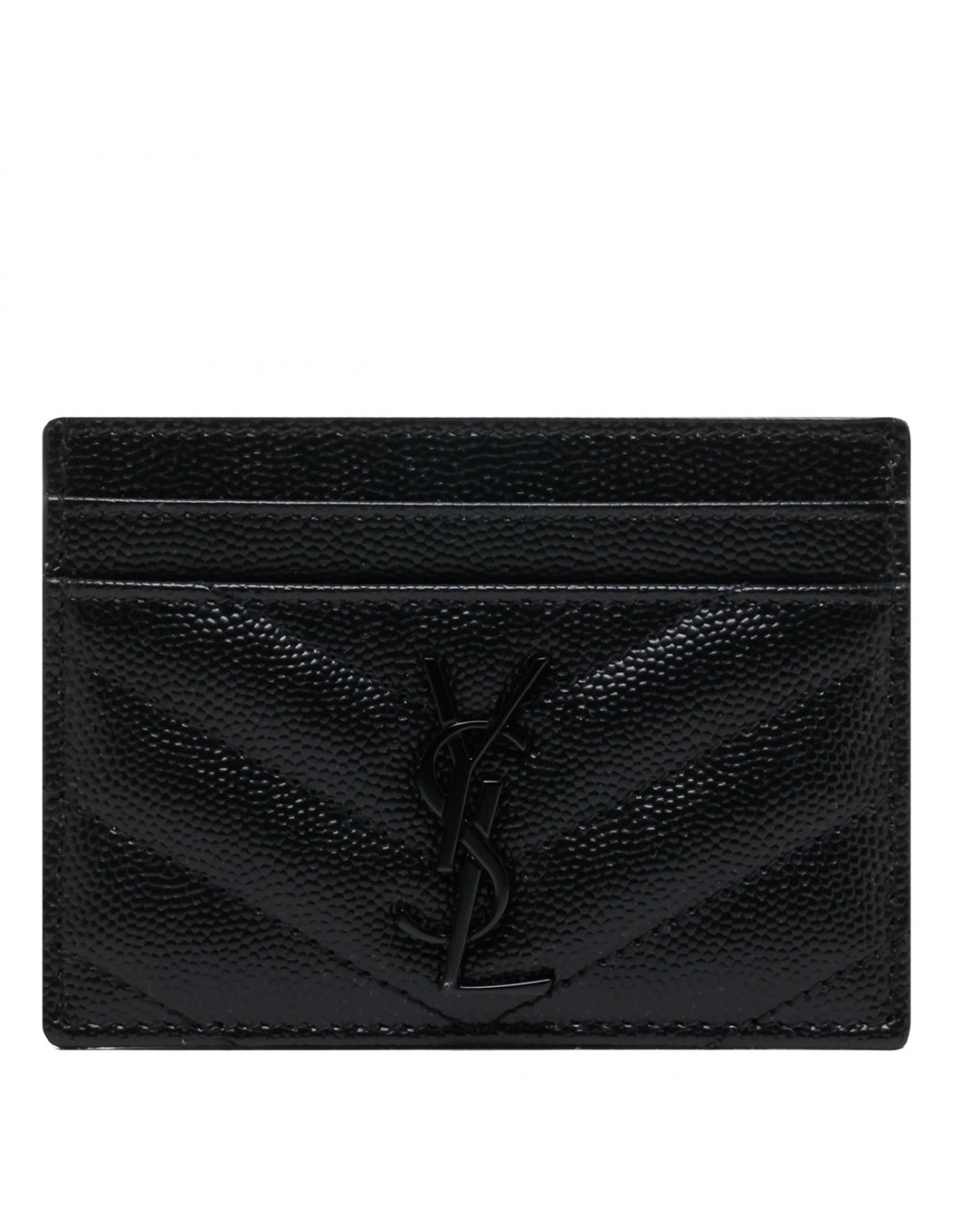 Black matelassé grained leather Cassandre card holder from Saint Laurent featuring black enameled interlaced YSL logo, quilted overstitching and five card slots.