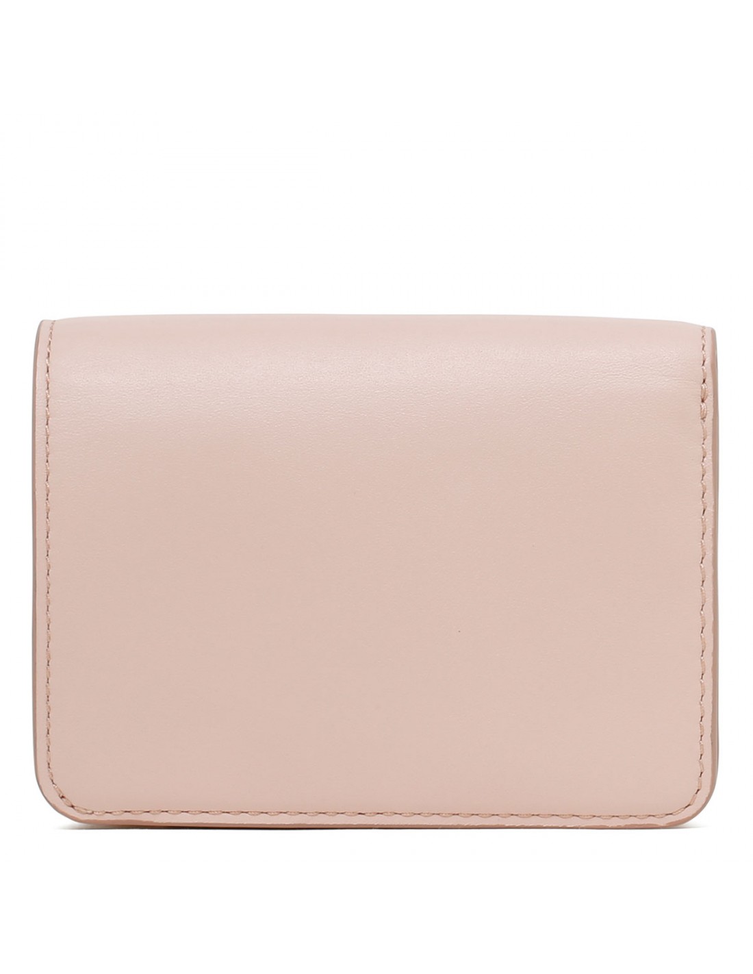 Rose smooth leather The Covered J Marc mini compact wallet from Marc Jacobs featuring leather-covered J Marc logo, snap closure, twill lining, four slip pockets, six card slots, one bill sleeve, one coin pouch with double gusset.