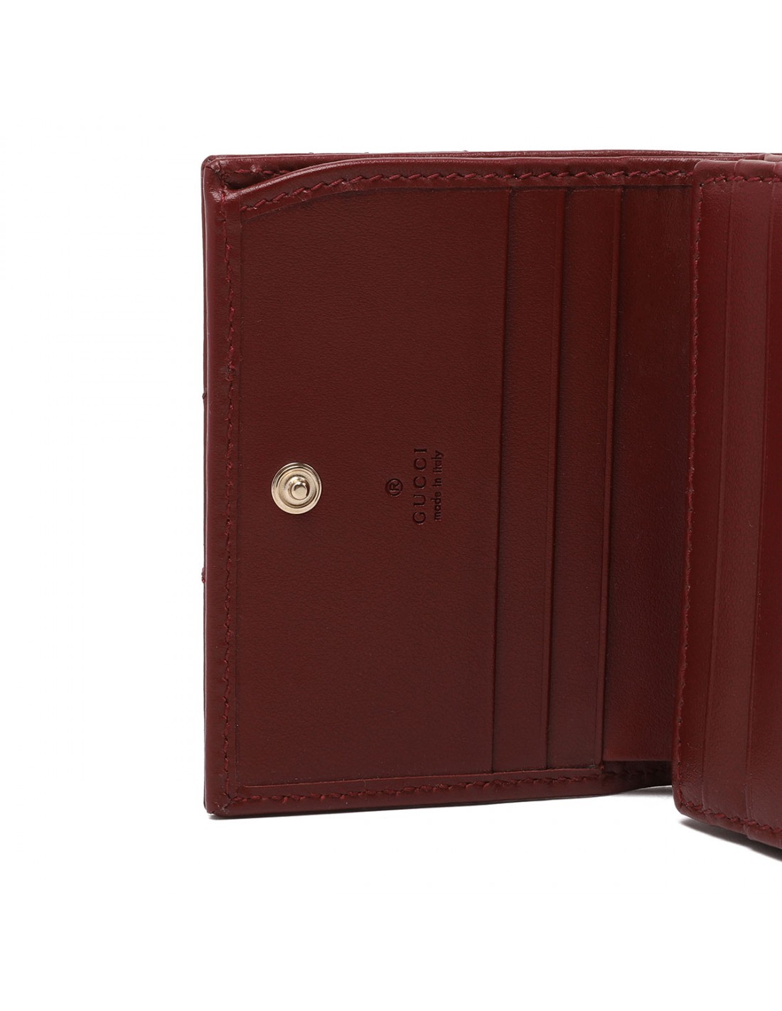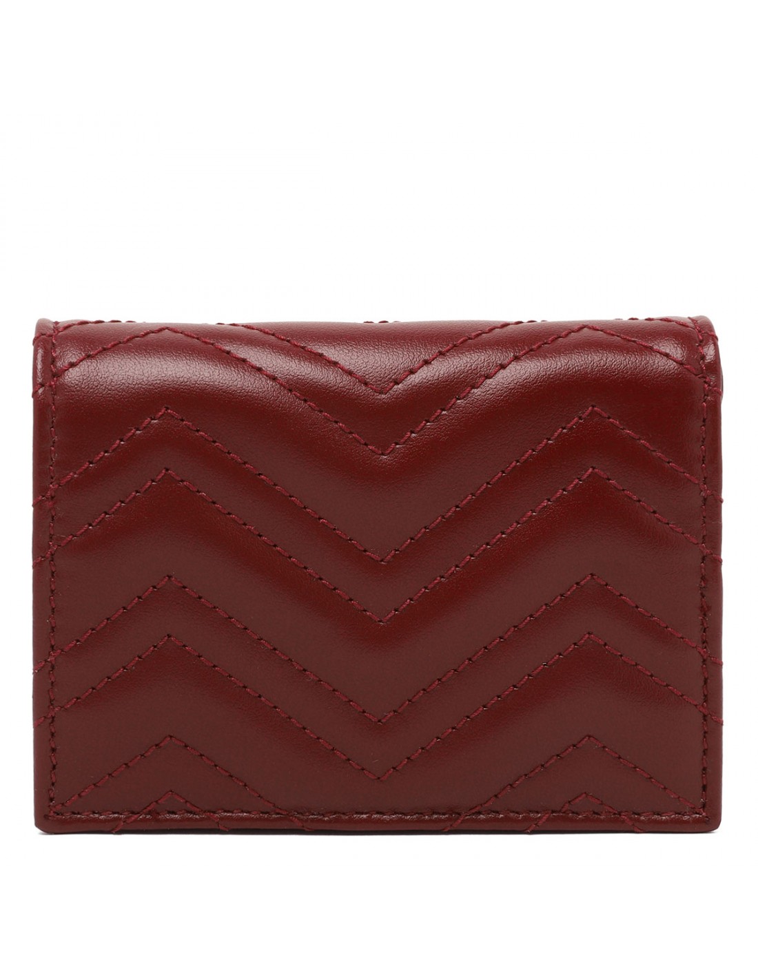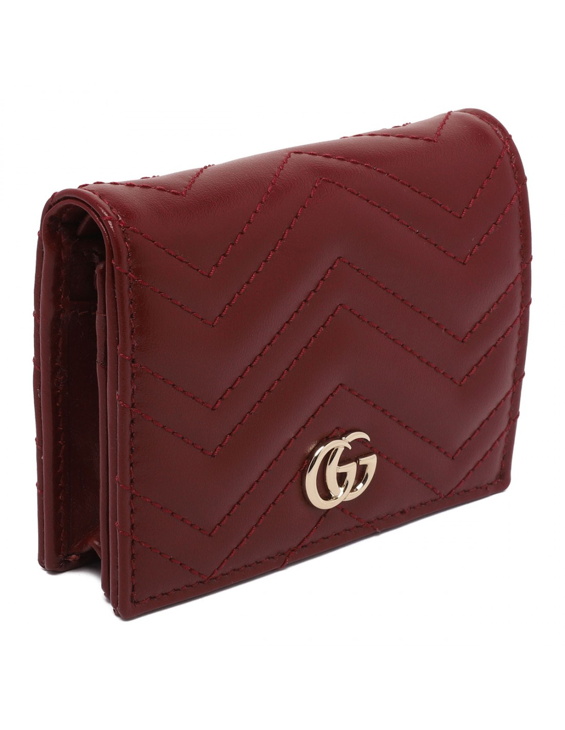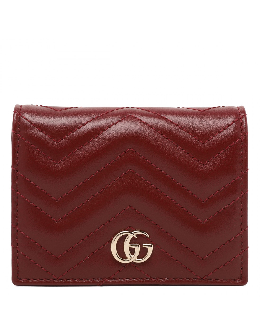 Rosso Ancora red matelassé chevron leather GG Marmont card case wallet from Gucci featuring light gold-toned double G and hardware, flap with snap closure, moiré lining, five card slots, one bill compartment, one zip pocket.
