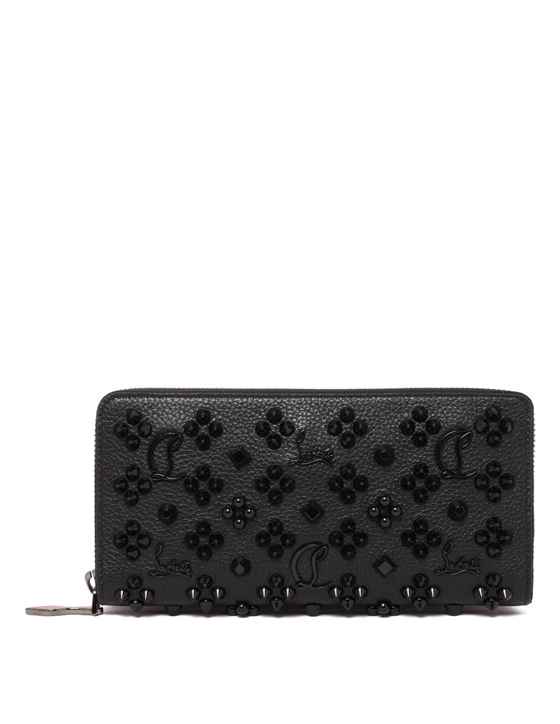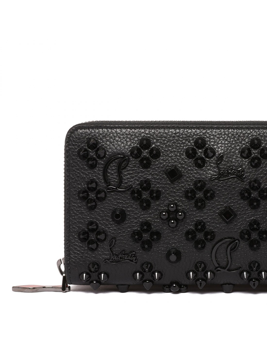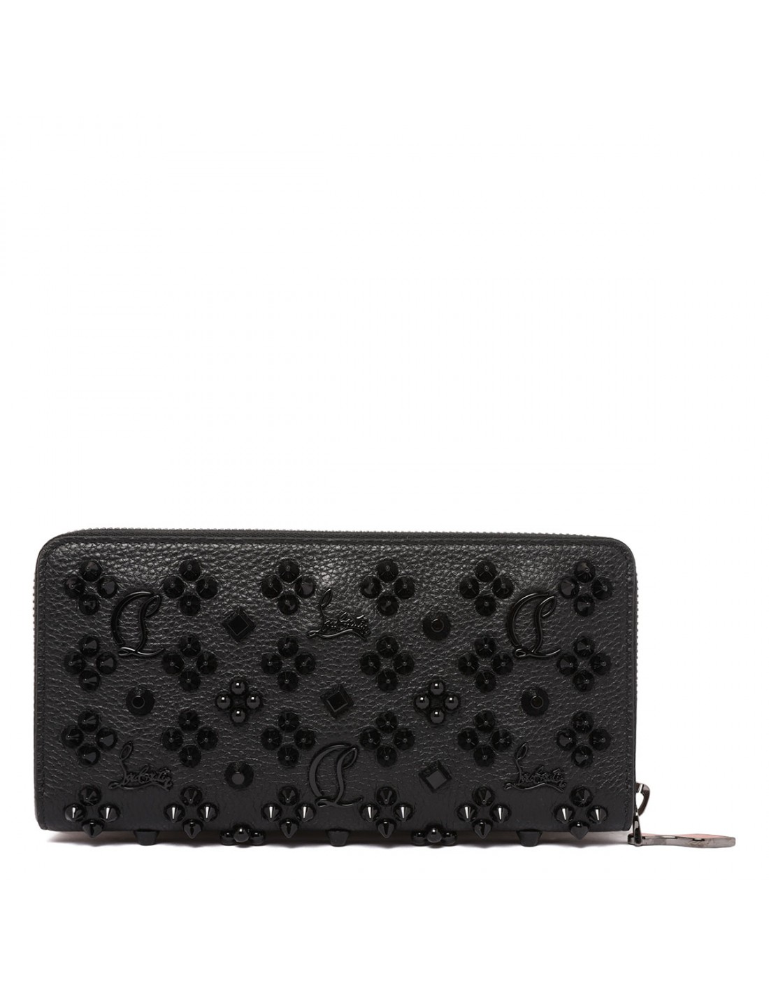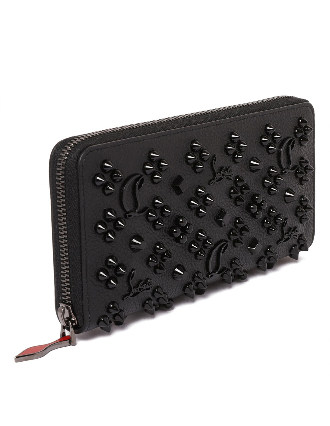 Black grained calf leather Panettone wallet from Christian Loubouting featuring tonal Loubinthesky spikes and logo motif, zip around fastening, Loubi red lining, twelve card slots, four flat pockets, two compartments and one zipped coin pocket.