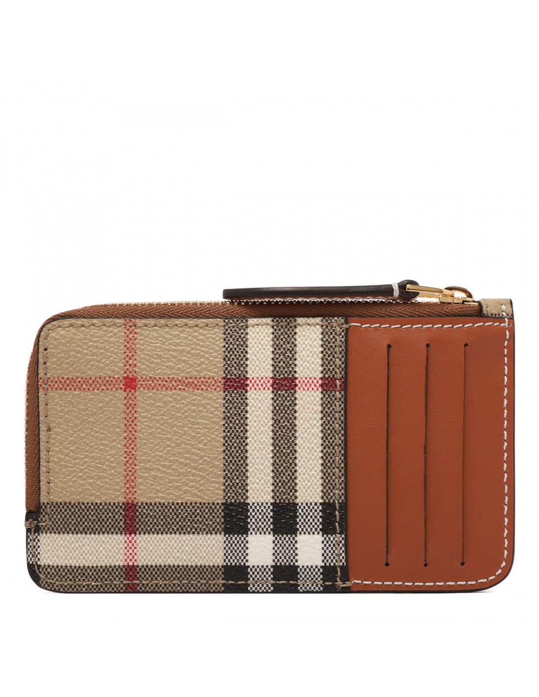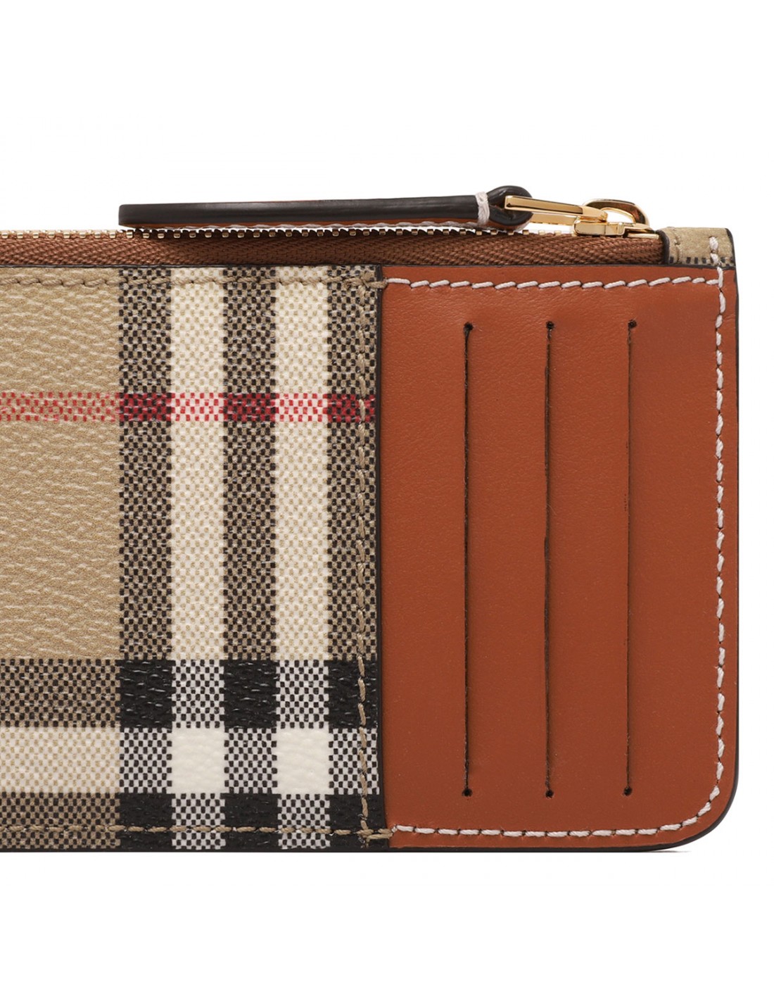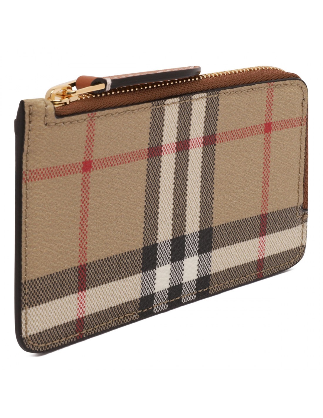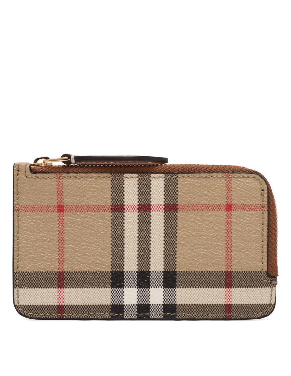 Vintage check coated cotton blend card case from Burberry featuring brown smooth leather detail and lining, zip fastening, hand-painted edges, polished metal hardware and three card slots.