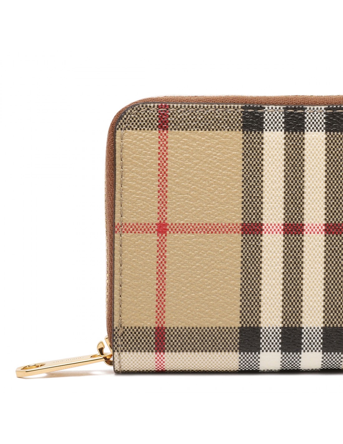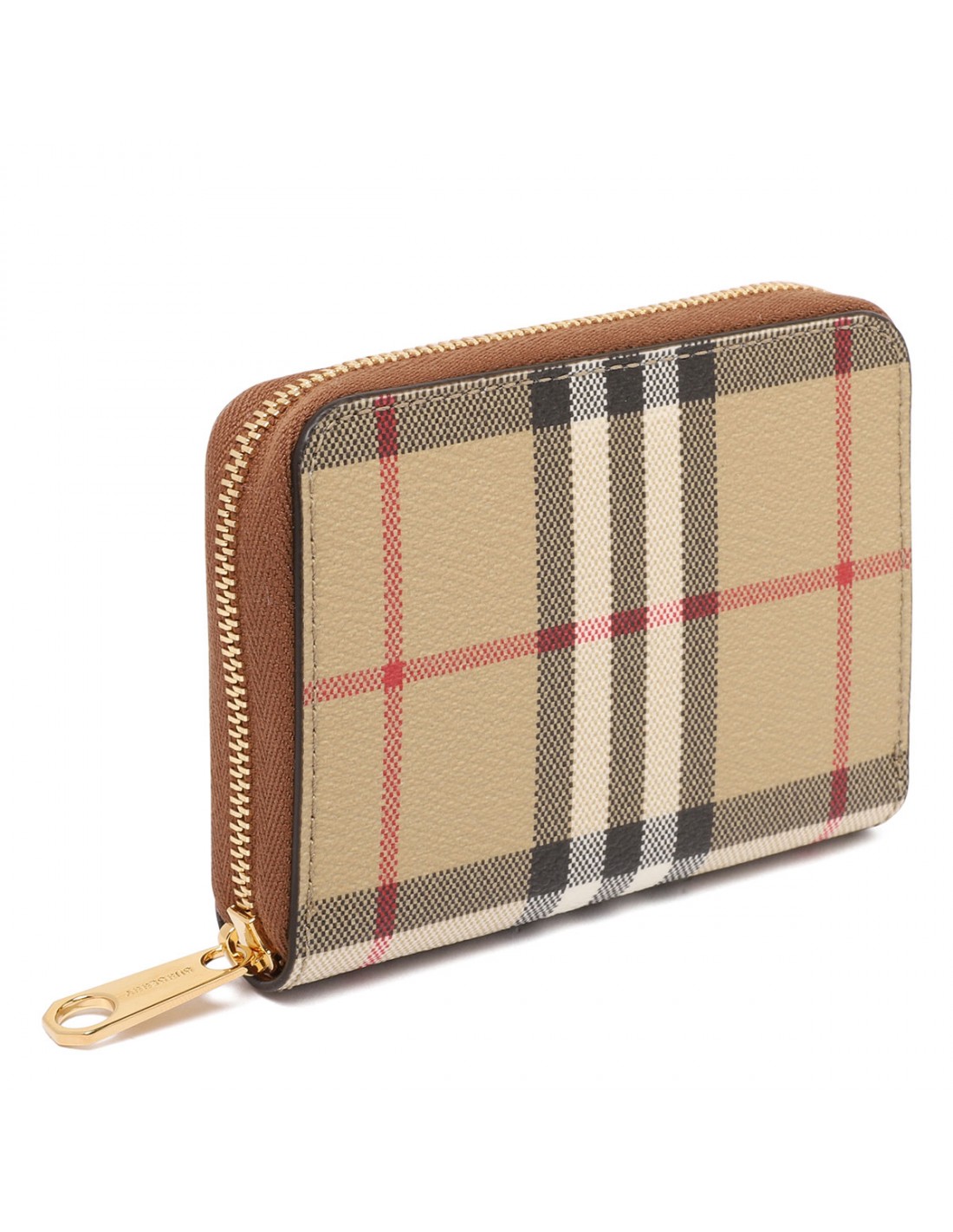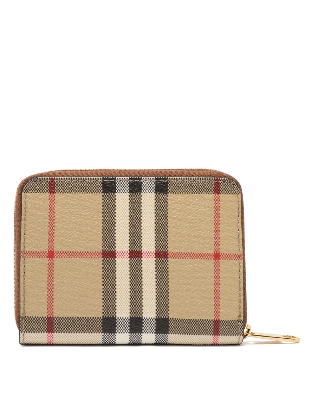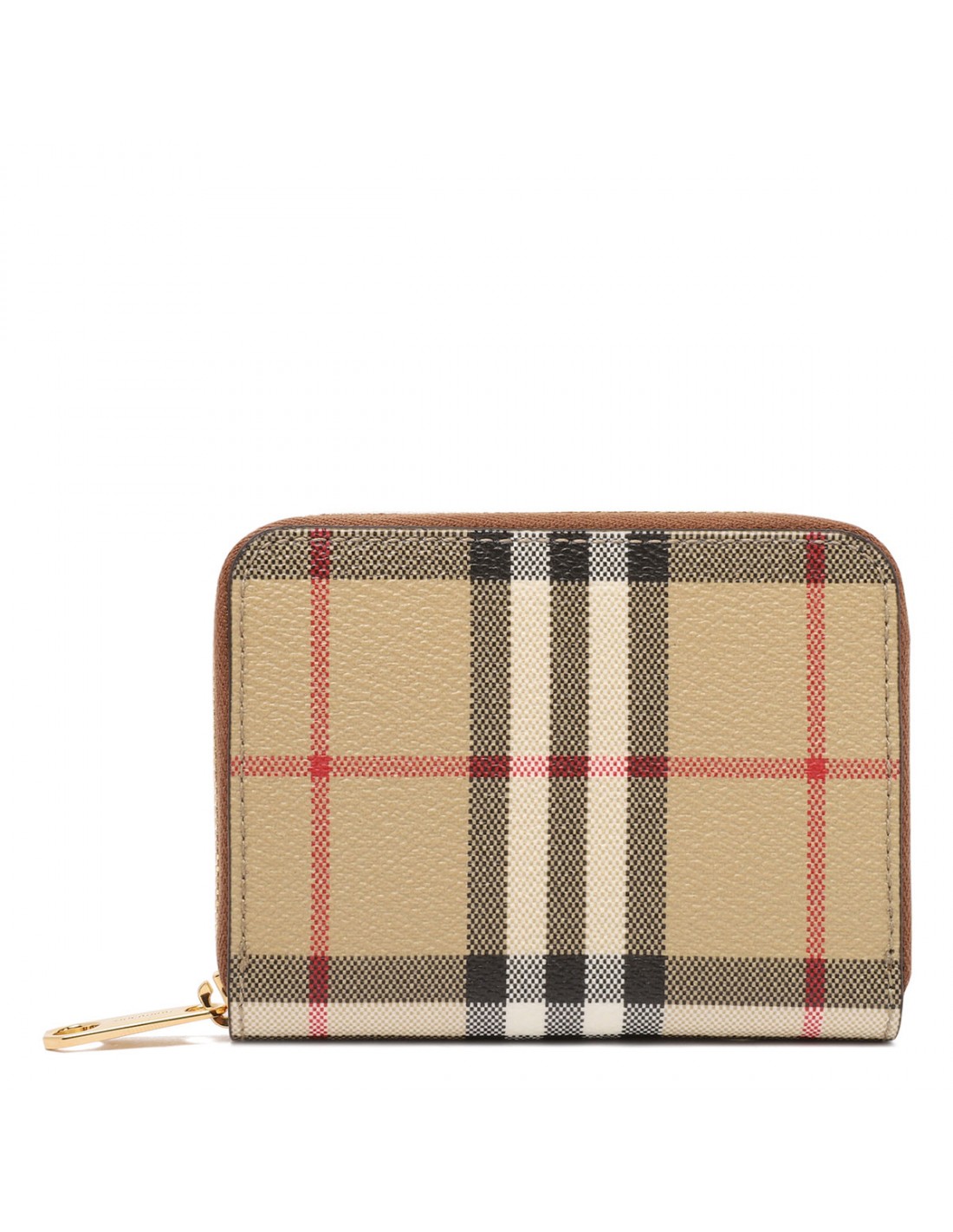 Beige and brown coated cotton blend small wallet from Burberry featuring iconic check motif, smooth calf leather trims, zip closure, hand-painted edges, brushed metal hardware, four card slots and three slip pockets.