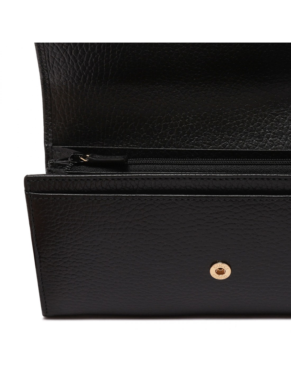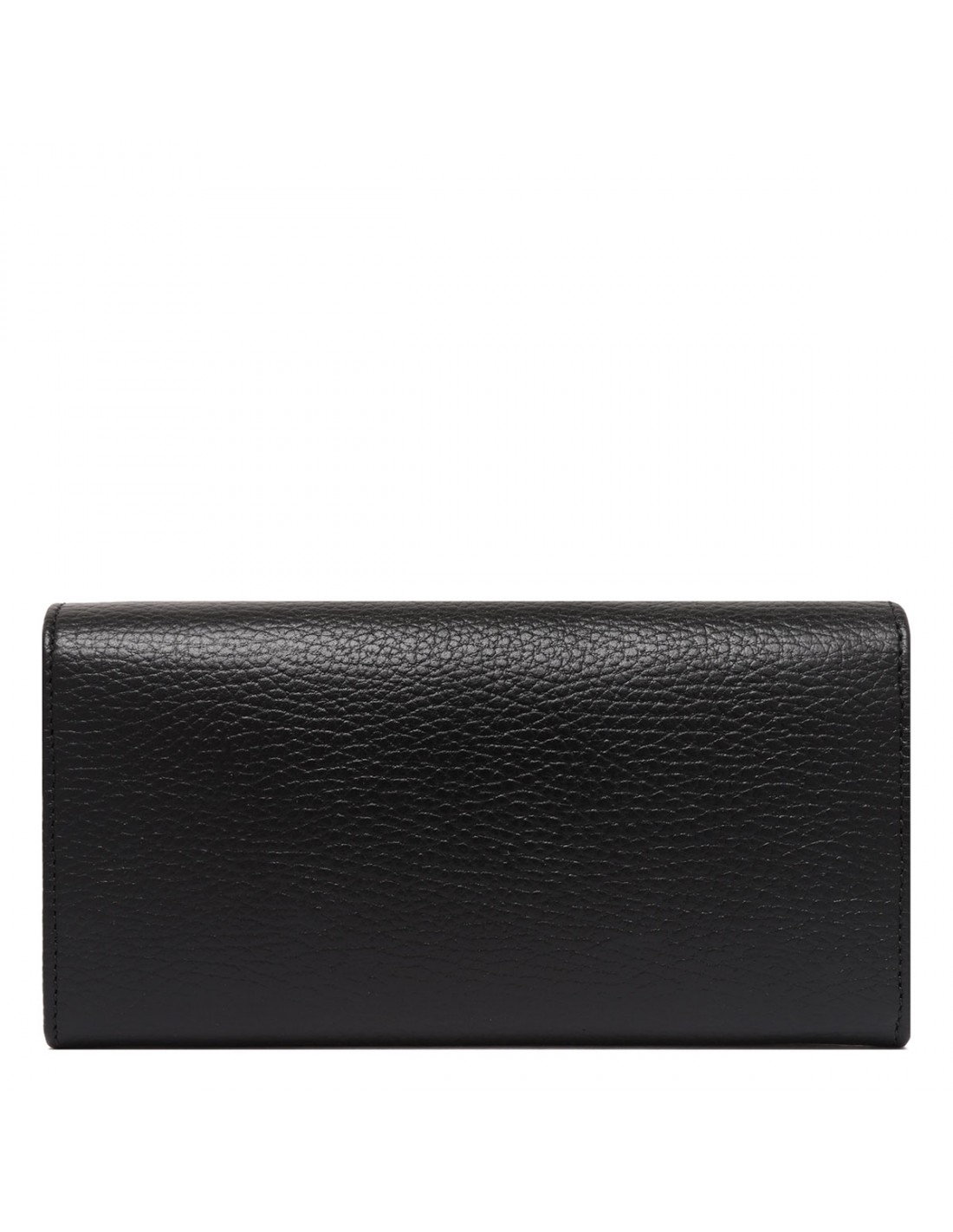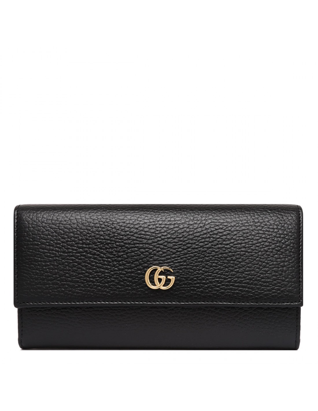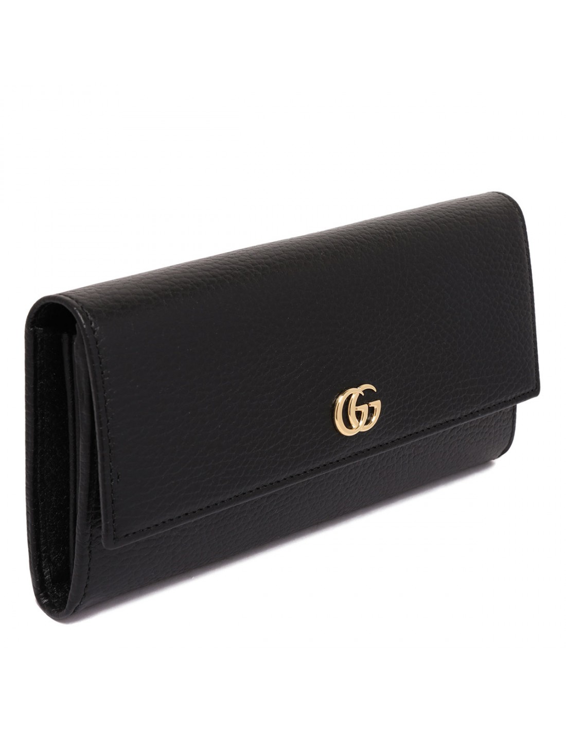 Black leather GG Marmont continental wallet from Gucci featuring gold-toned double G and hardware, external open pocket, snap closure, zip coin pocket, twelve card slots and two bill compartments, two separate interior compartments.