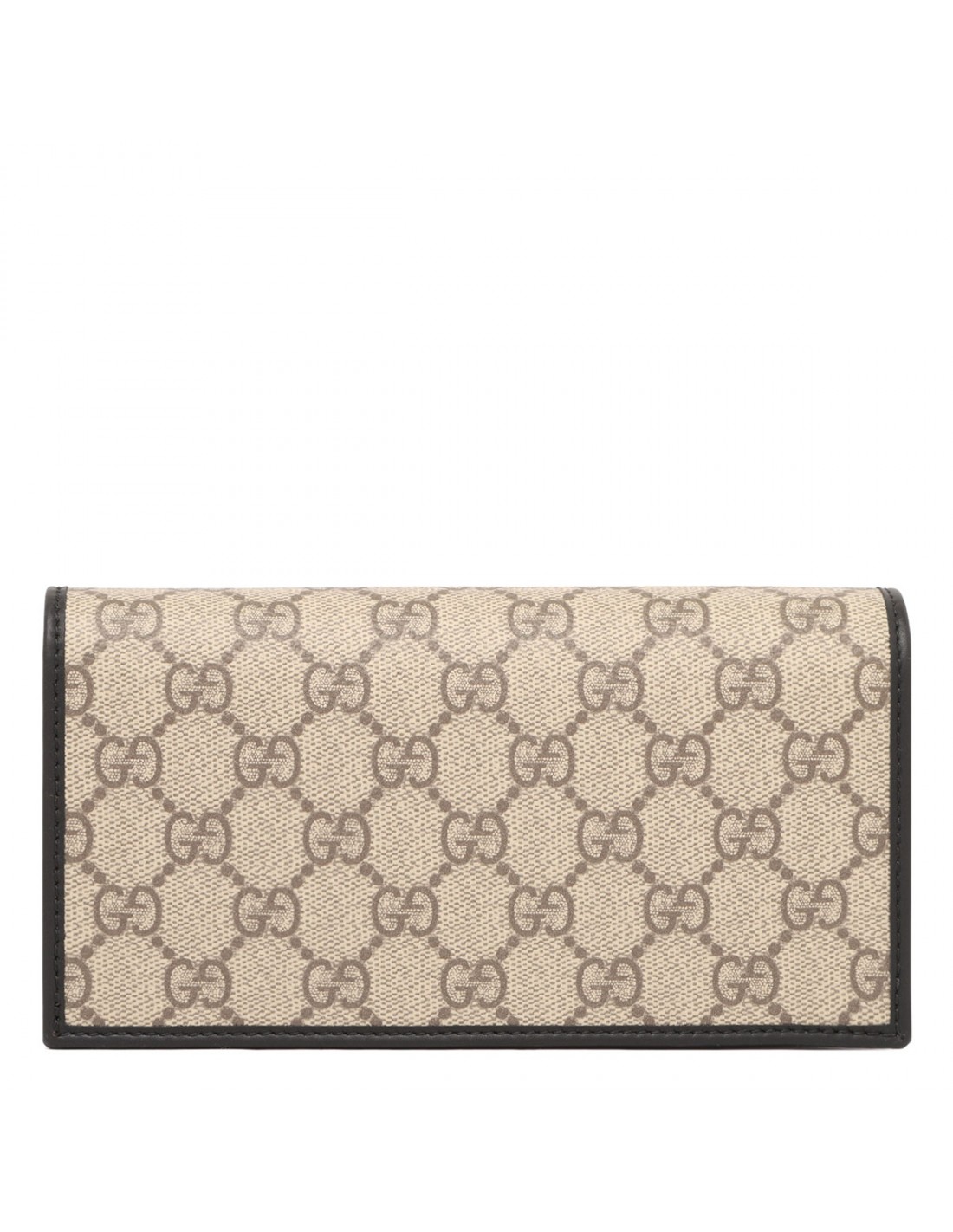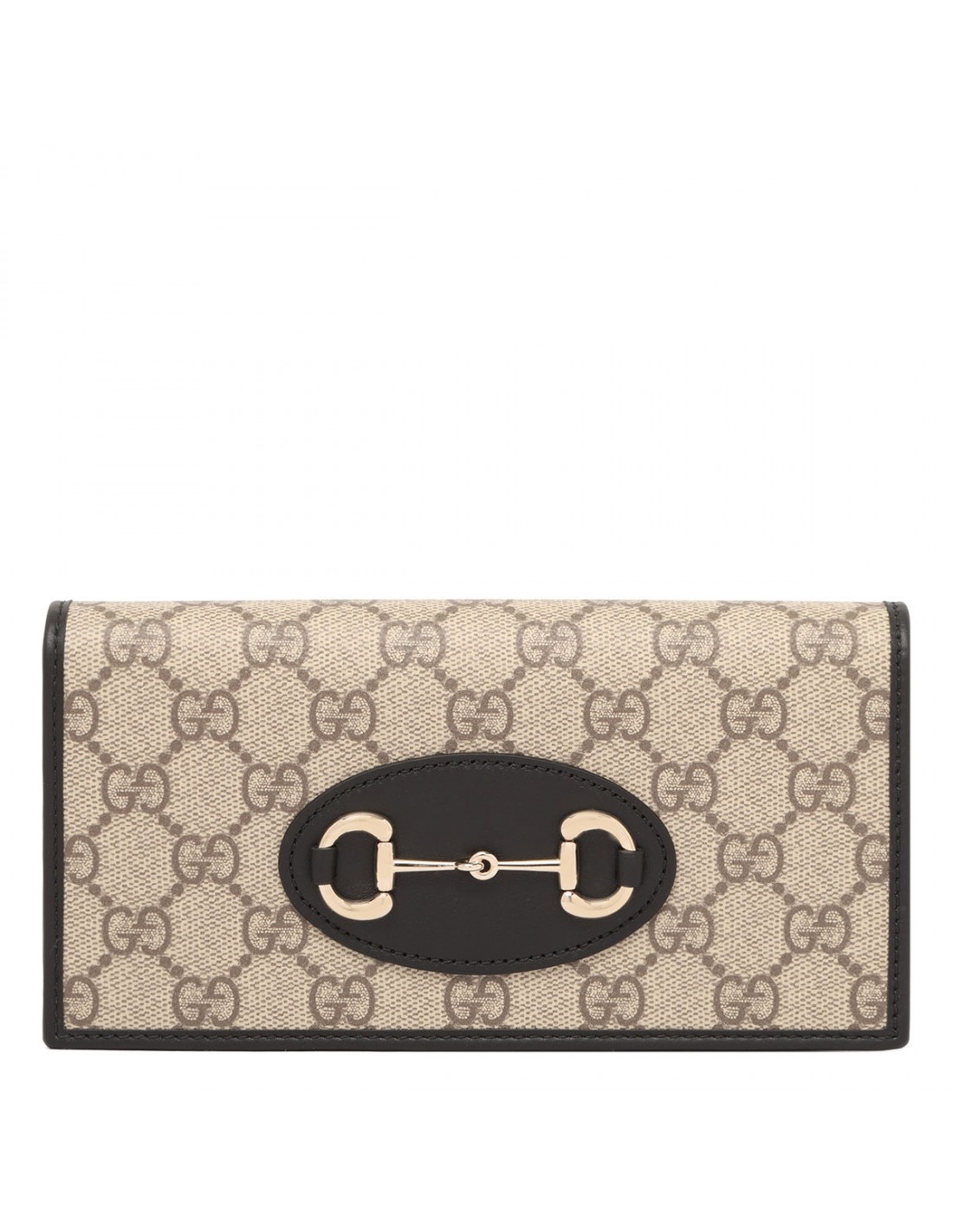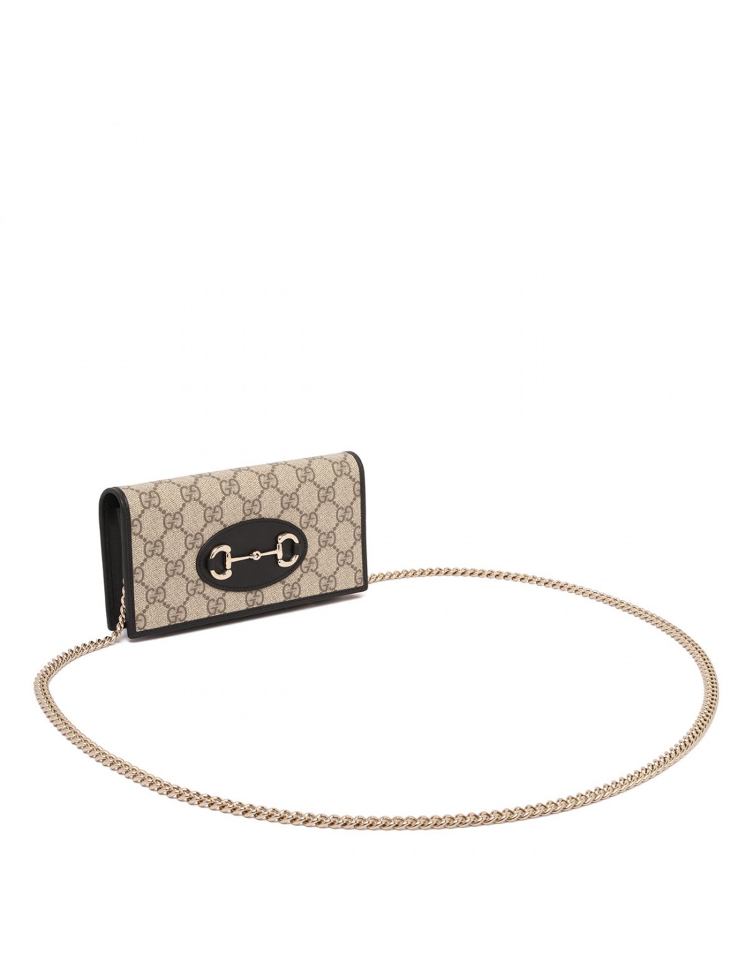 Beige and dark brown new coated fabric Horsebit 1955 wallet on chain from Gucci featuring GG Monogram, black leather trims, light gold-toned hardware, detachable chain, snap button closure, moiré lining, six card slots, one flat pocket, one zip pocket with gusset, open compartment, zipped pocket, open pocket.
