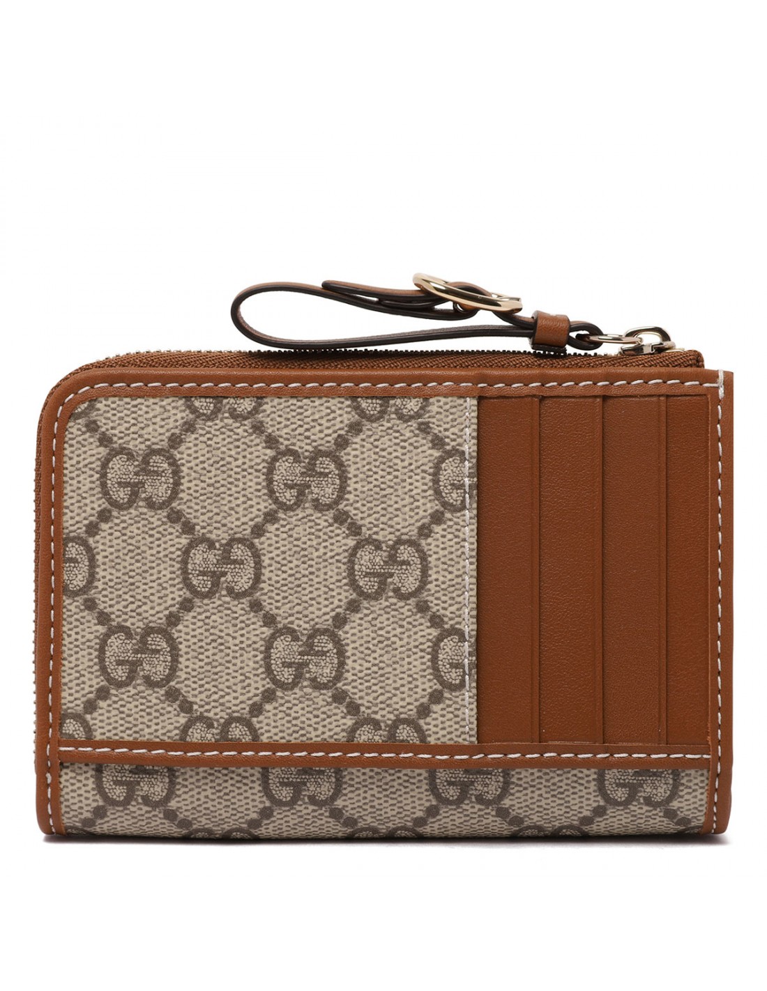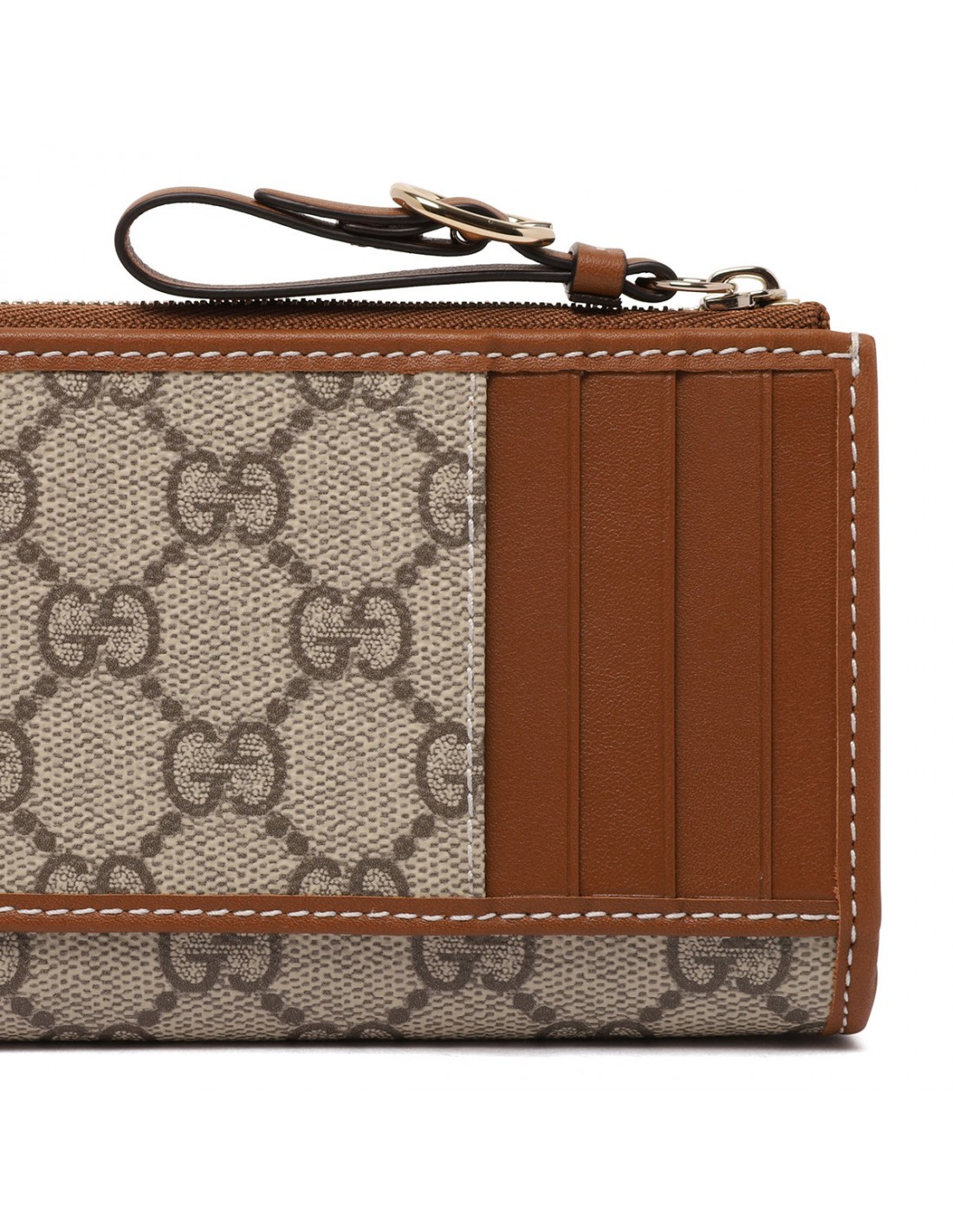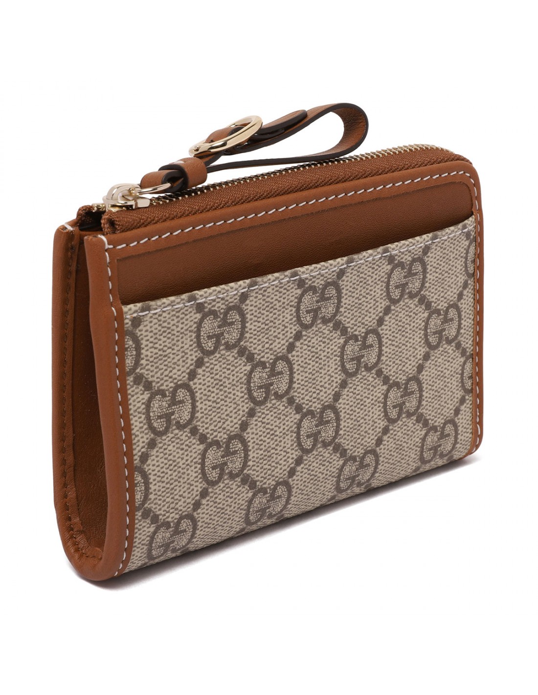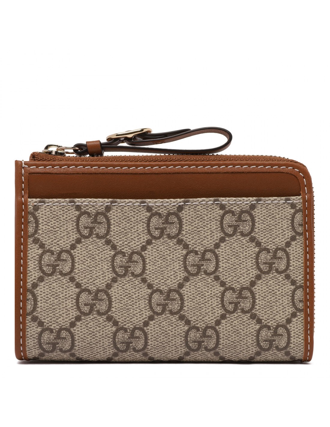 Beige and brown coated fabric GG Emblem zip card case from Gucci featuring new GG monogram, brown leather trims, Web taffeta lining, zip closure with leather puller, external front flat pocket, back flat pocket, three card slots, internal one coin compartment.