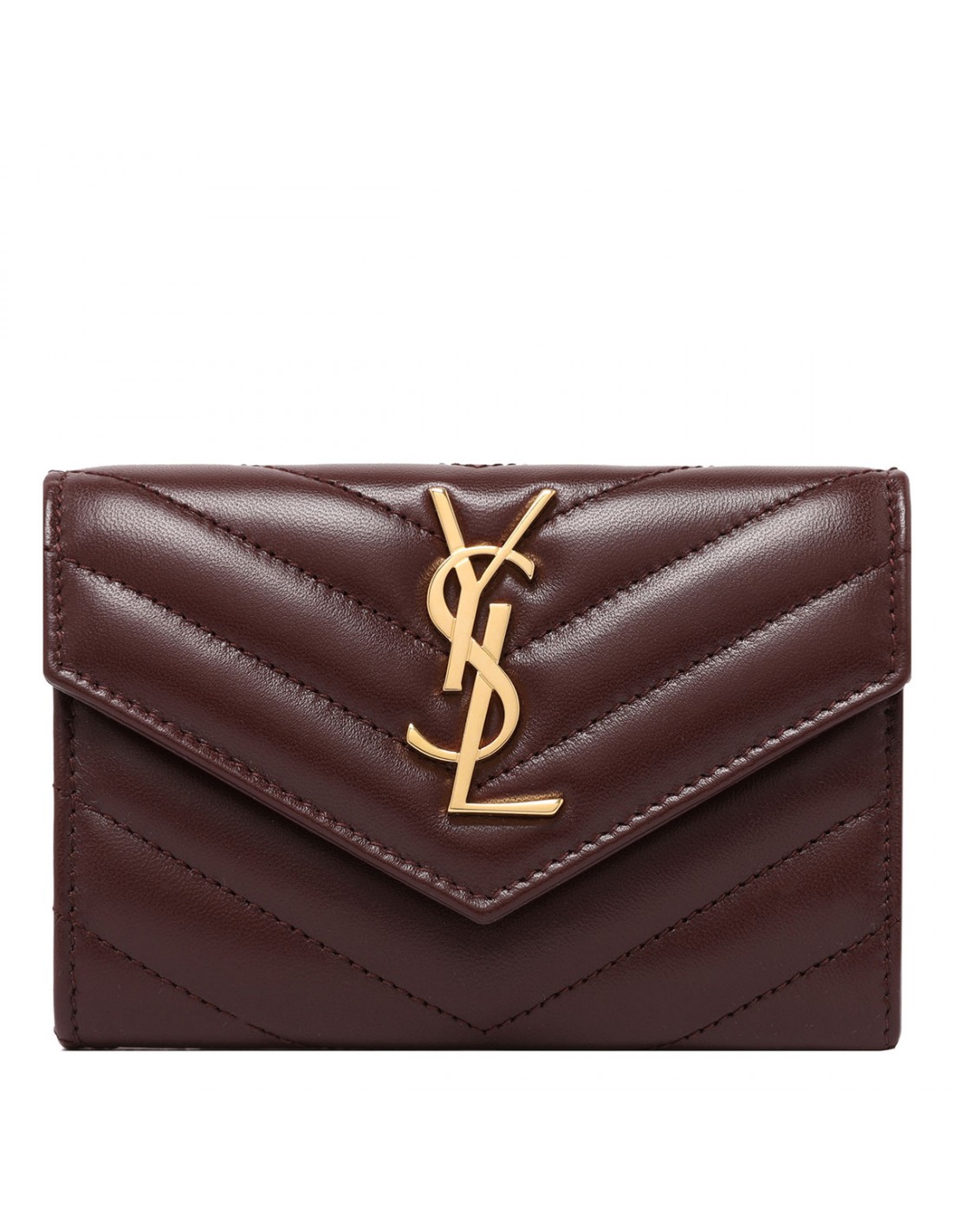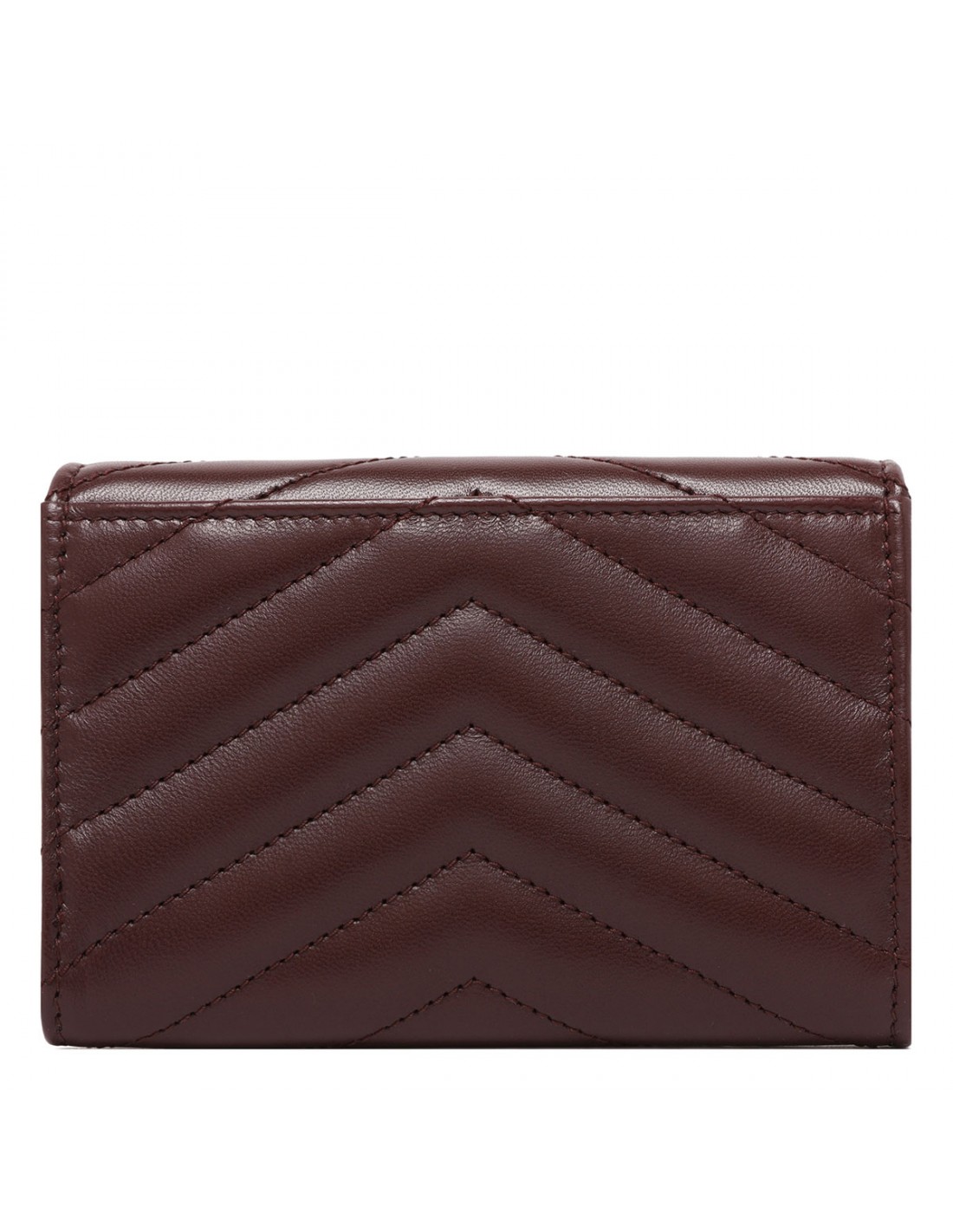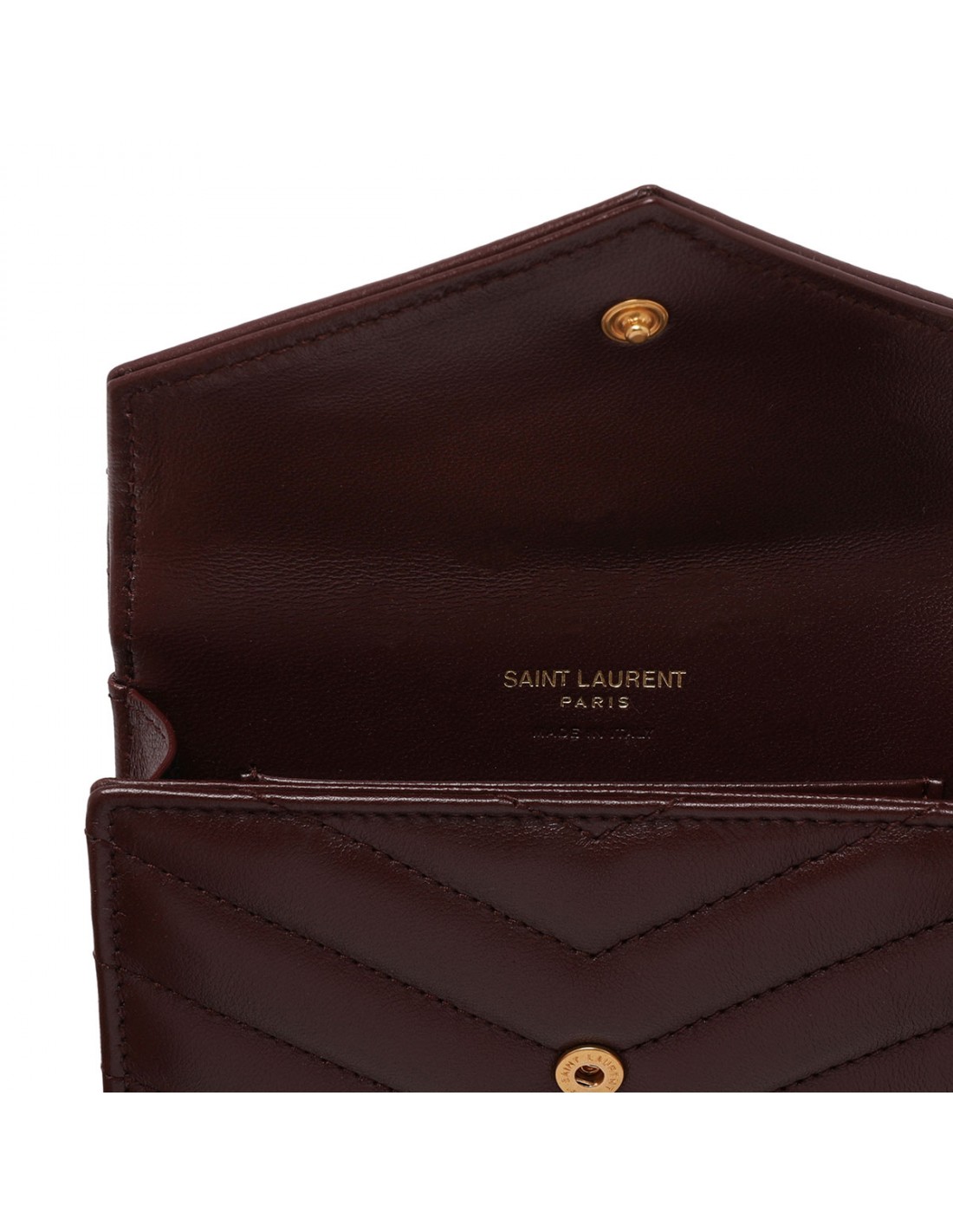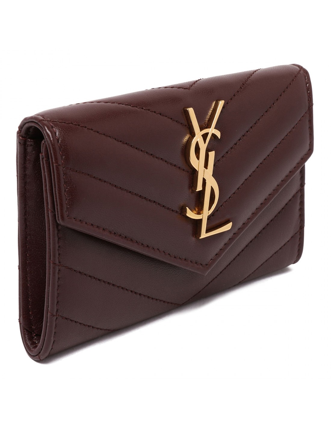 Cabernet red hue matelassé leather envelope wallet from Saint Laurent featuring Cassandre decoration, quilted topstitching, snap-button closure, gold-tone hardware, four card slots, one flat pocket at back, leather lining.