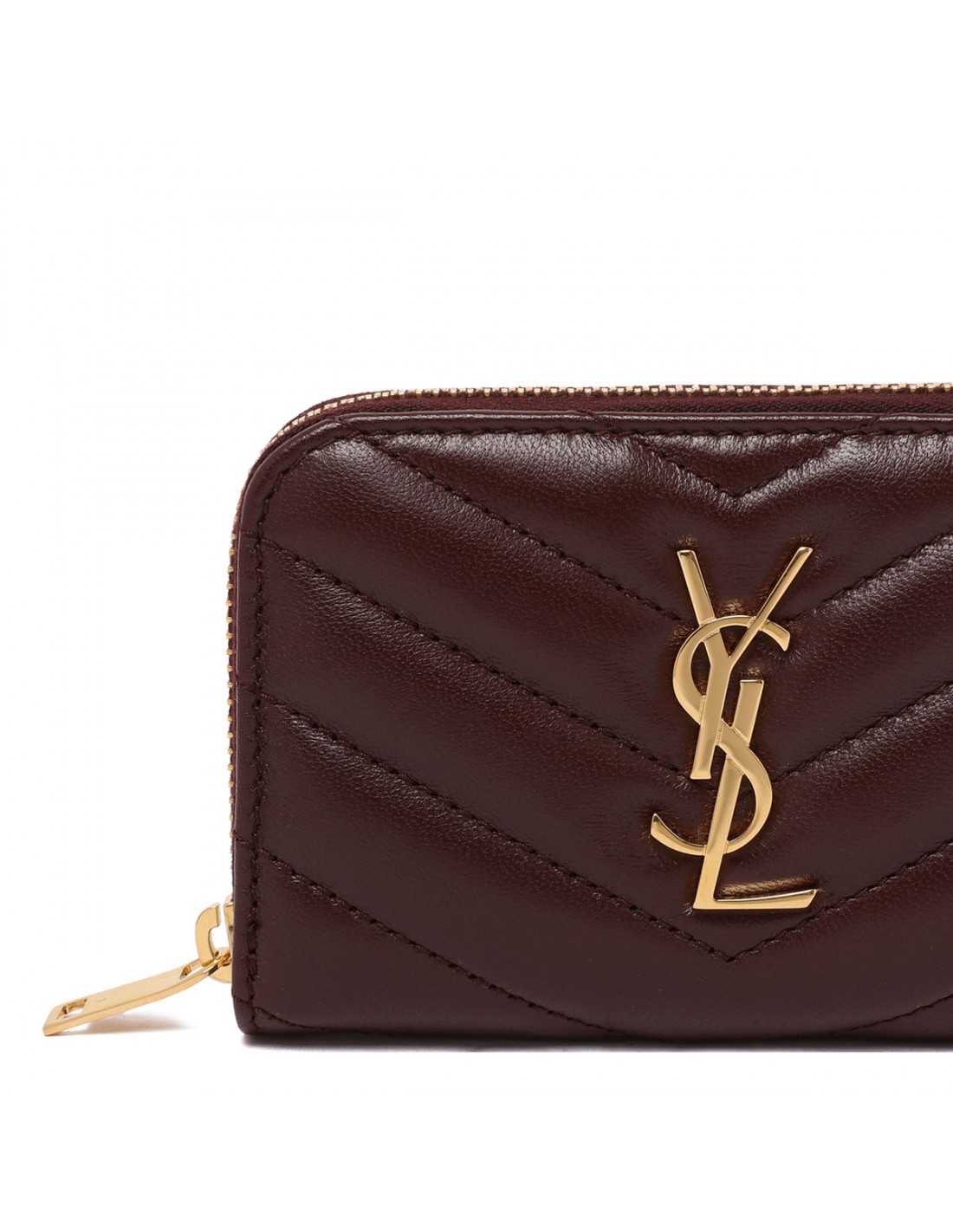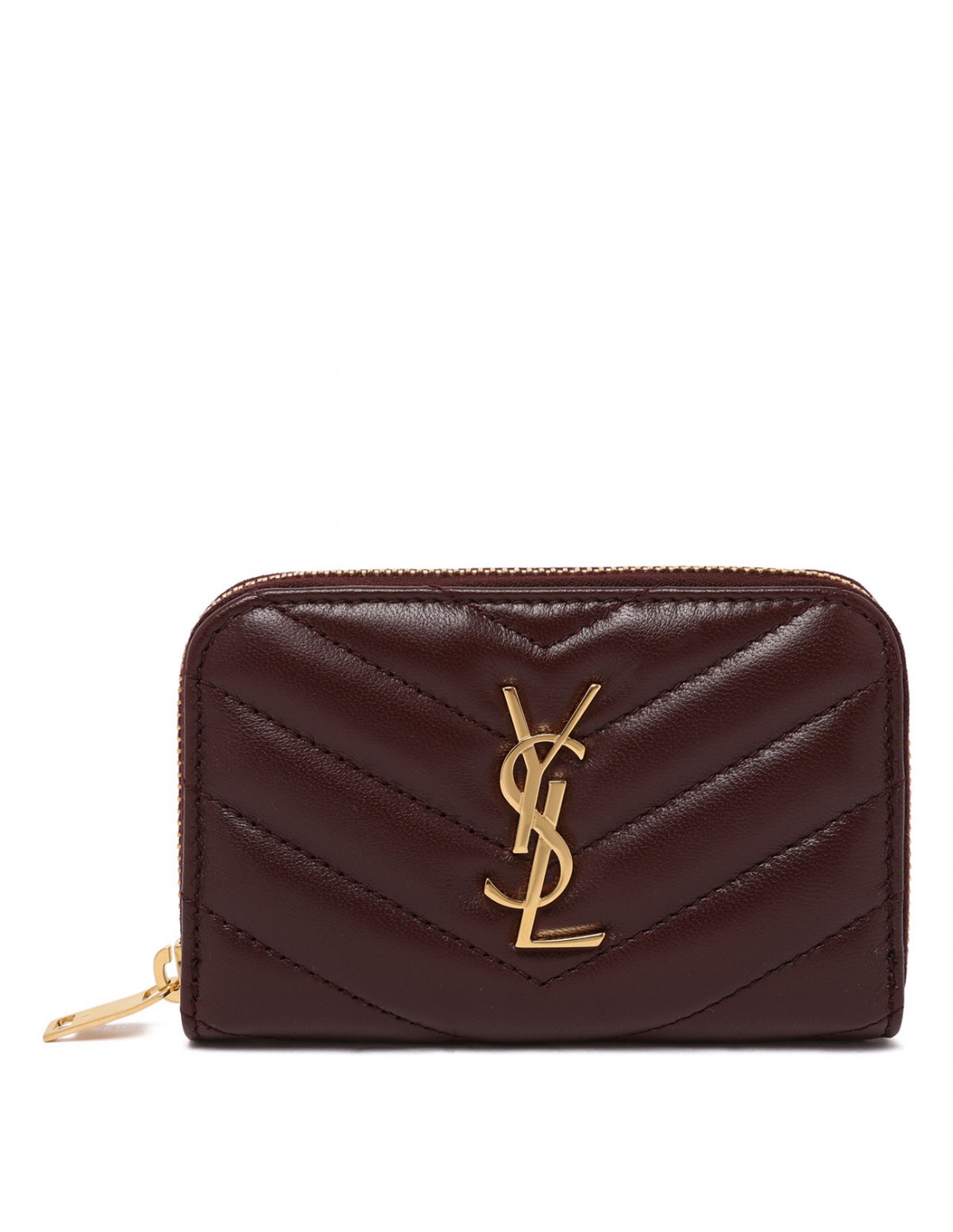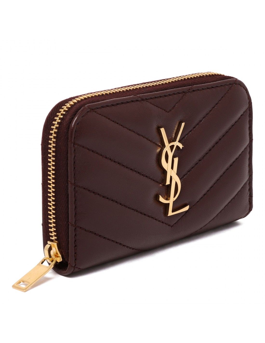 Red cabernet matelassé leather coin purse from Saint Laurent featuring zip fastening, gold-tone Cassandre decoration, quilted topstitching, gold-tone hardware, internal zipped comaprtment, two gusseted compartments.