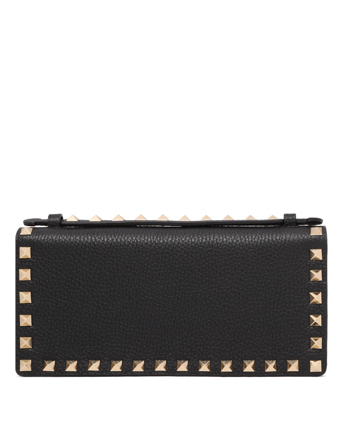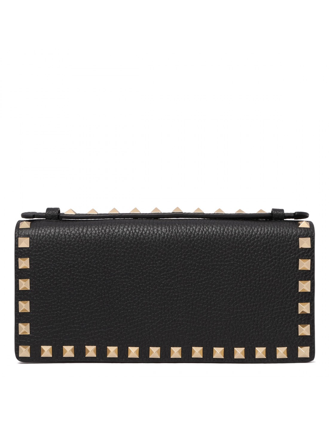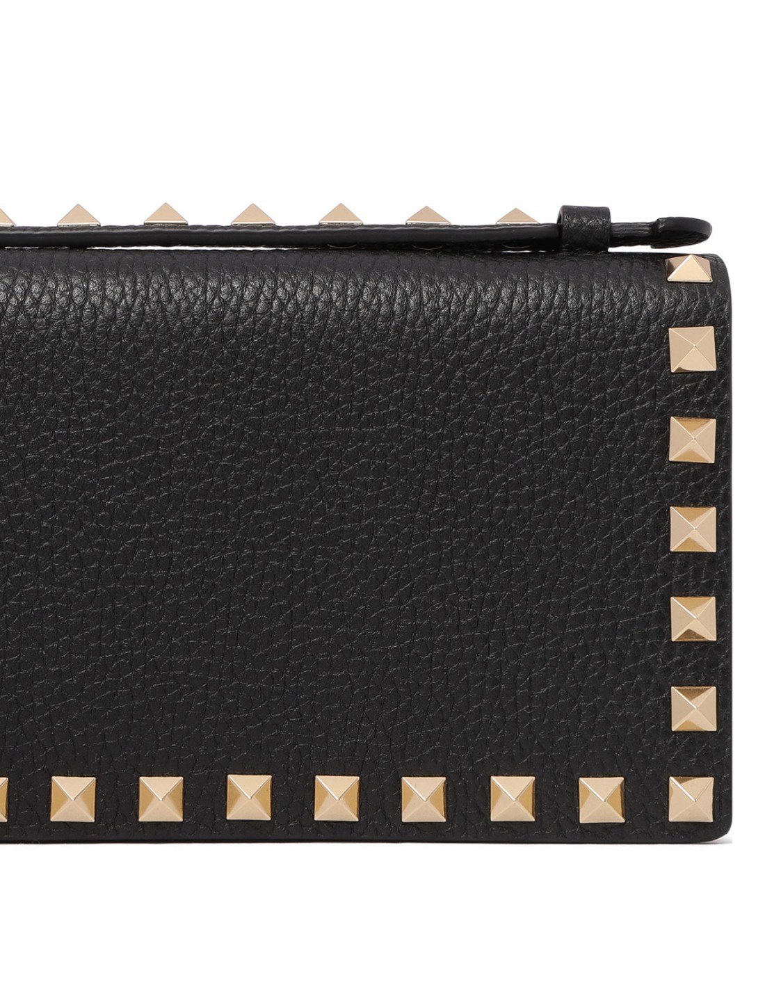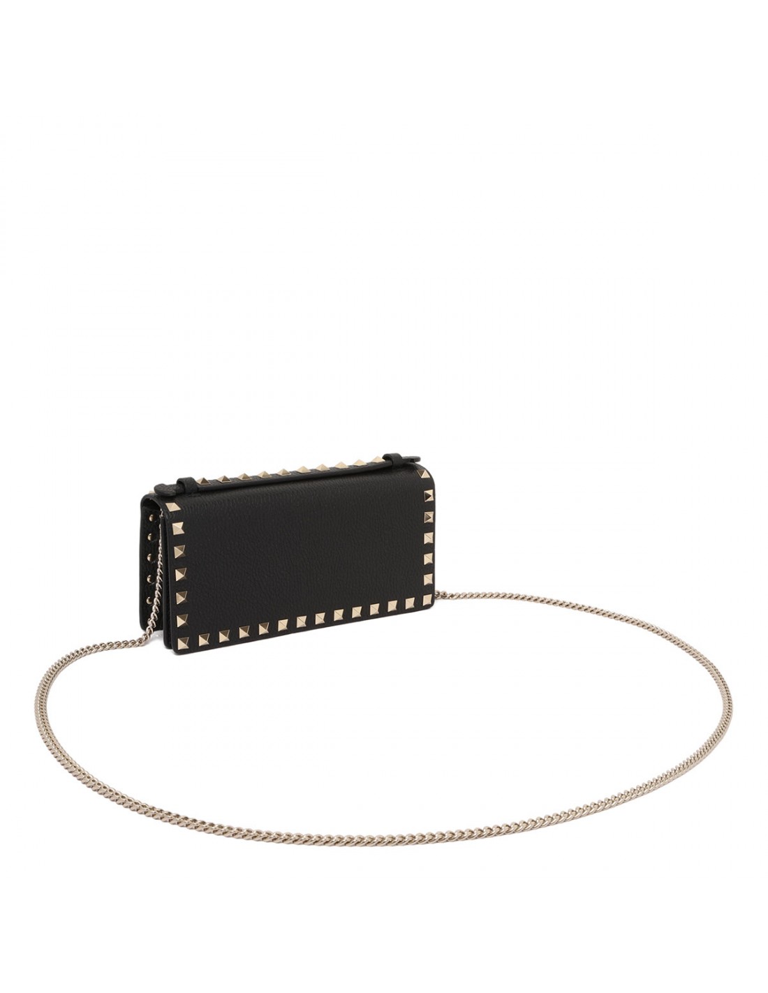 Black grainy calfskin Rockstud wallet on chain from Valentino Garavani featuring leather handle, detachable chain shoulder strap, platinum-finish studs and hardware, magnetic button fastening, nappa lining, internal zip pocket and card slot.