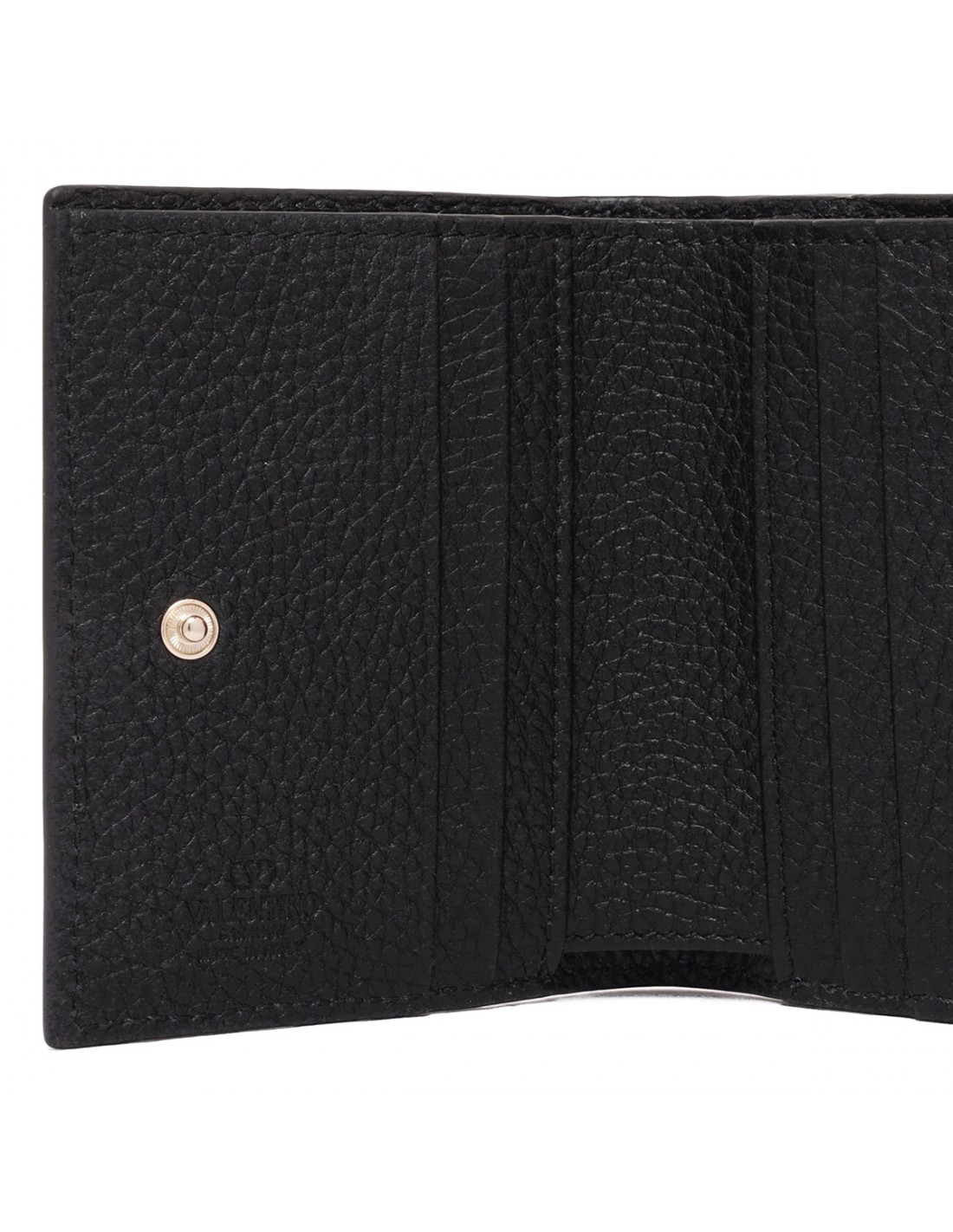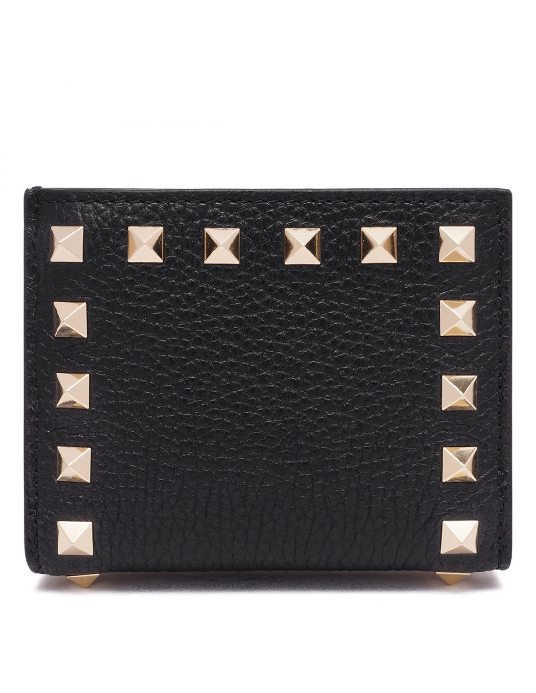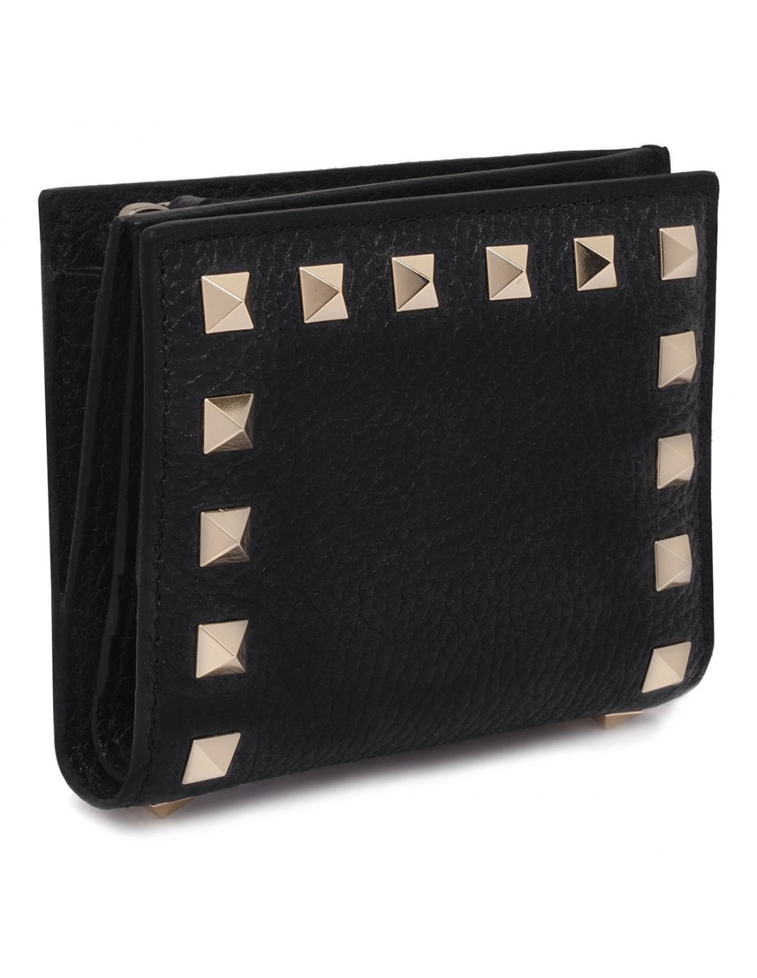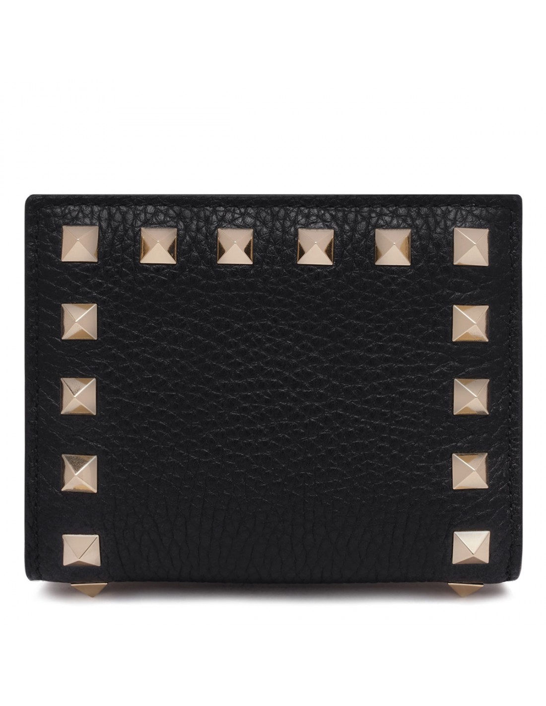 Black grainy calf leather Rockstud compact wallet from Valentino Garavani featuring platinum-finish studs and hardware, snap button fastening, six card slots, one zipped coin pocket and one bill pocket.