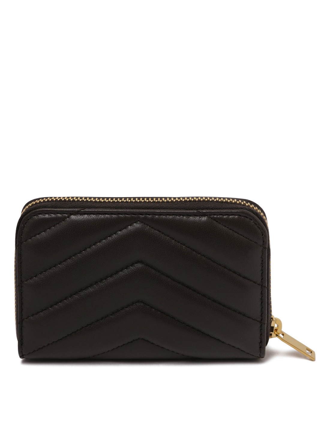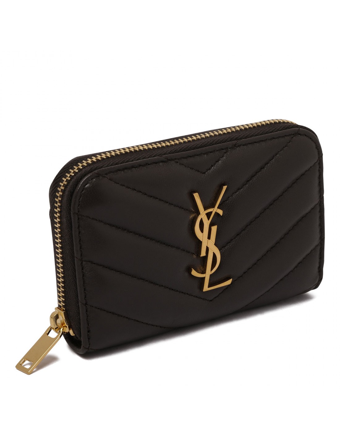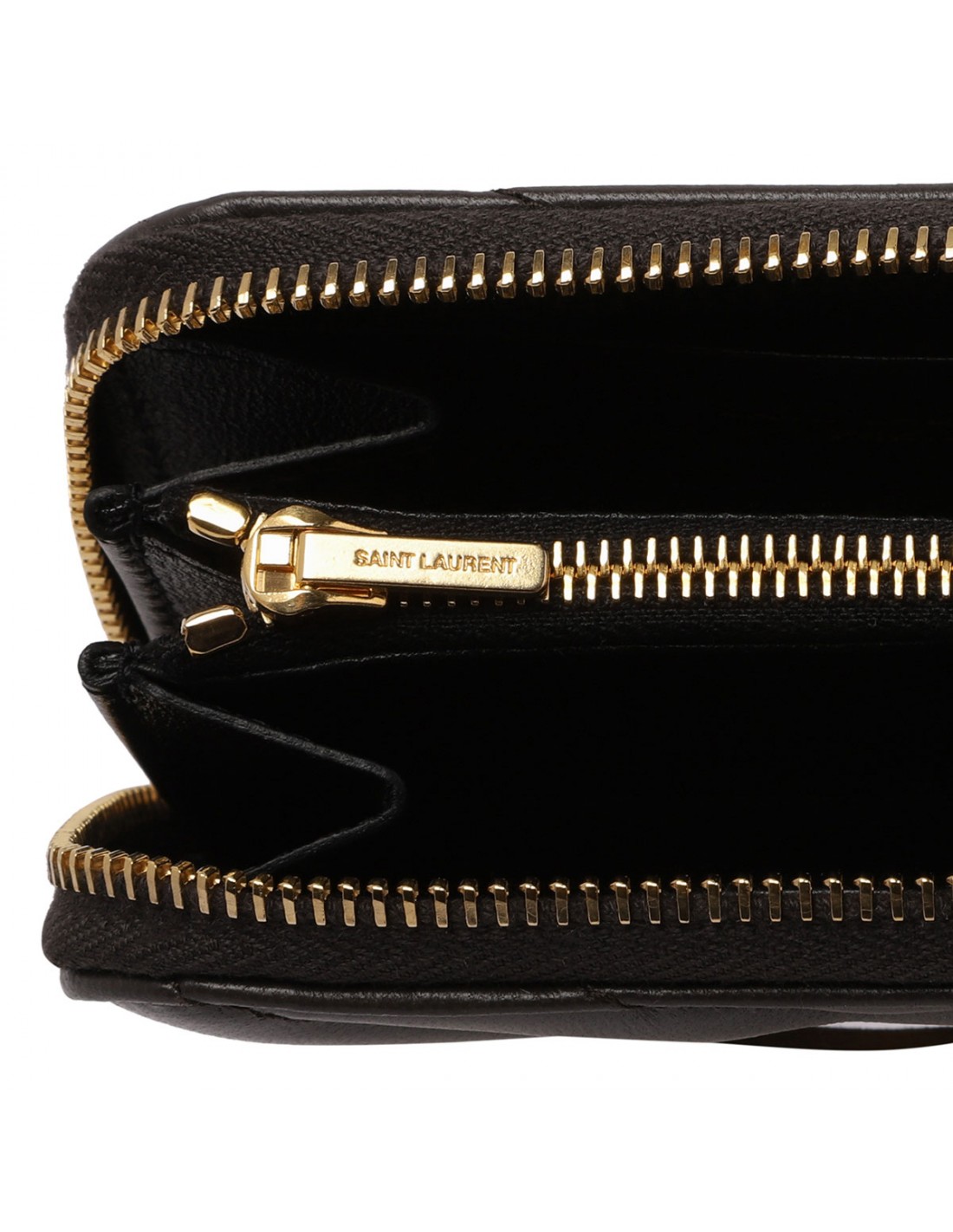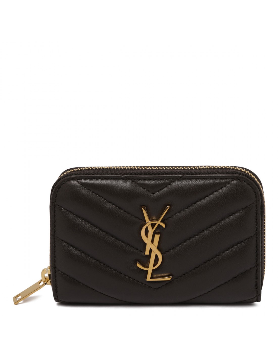 Clover hue quilted leather change purse from Saint Laurent featuring zip fastening along top, Cassandre decoration, gold-tone hardware, two gusseted compartments.