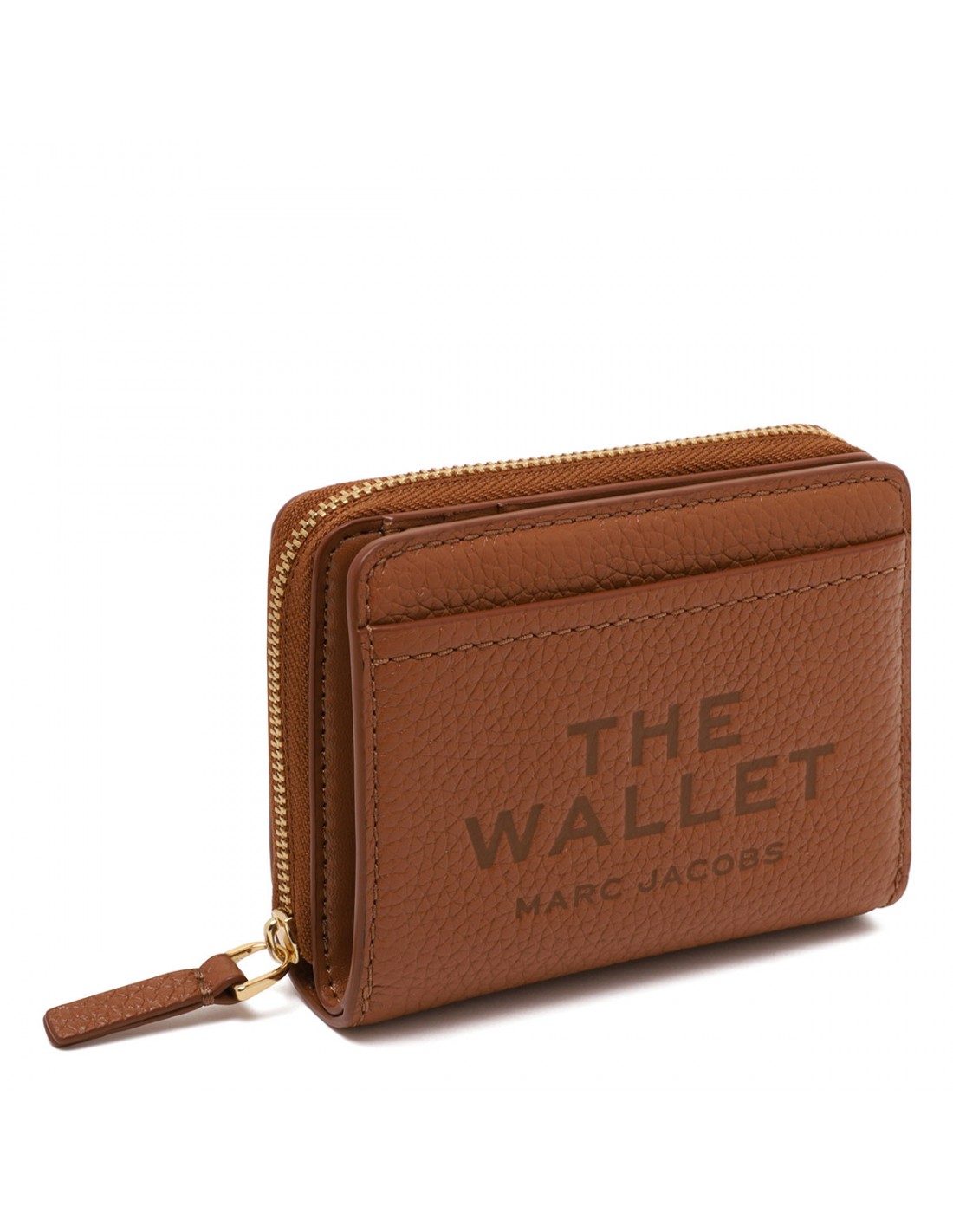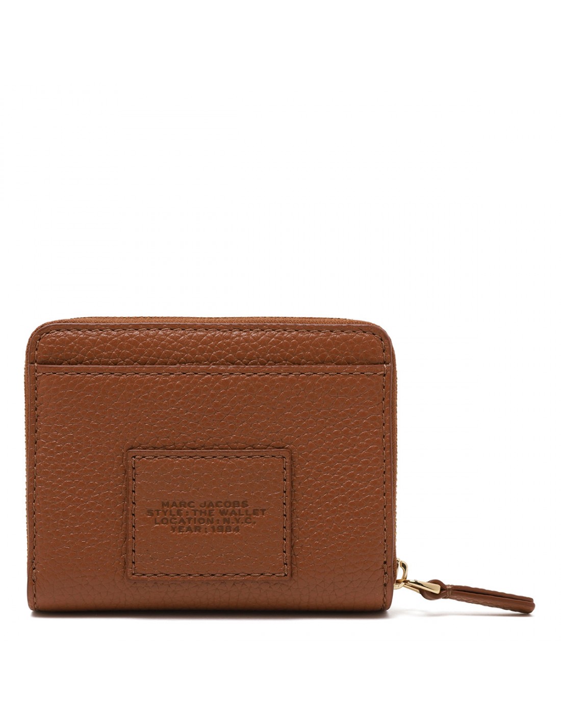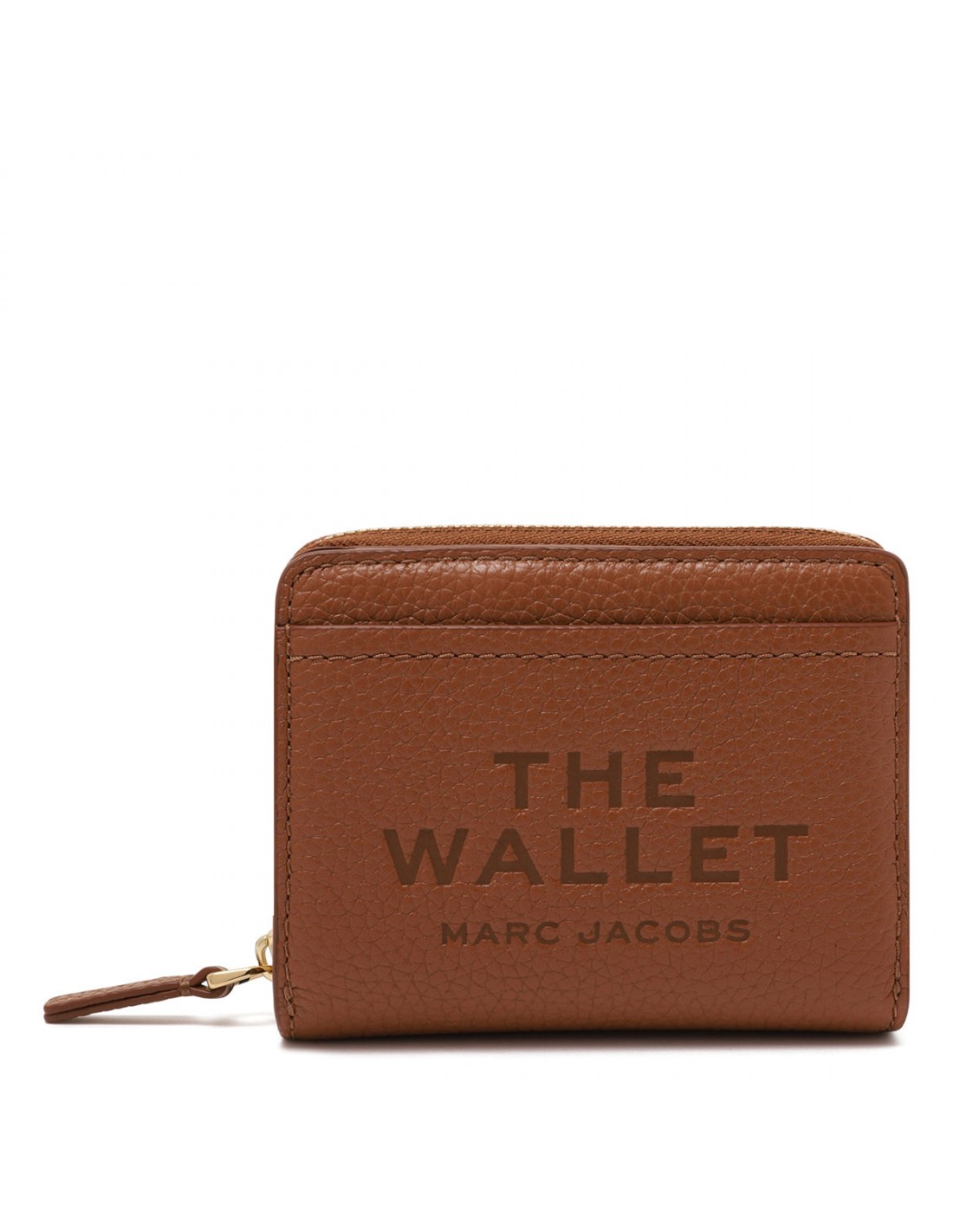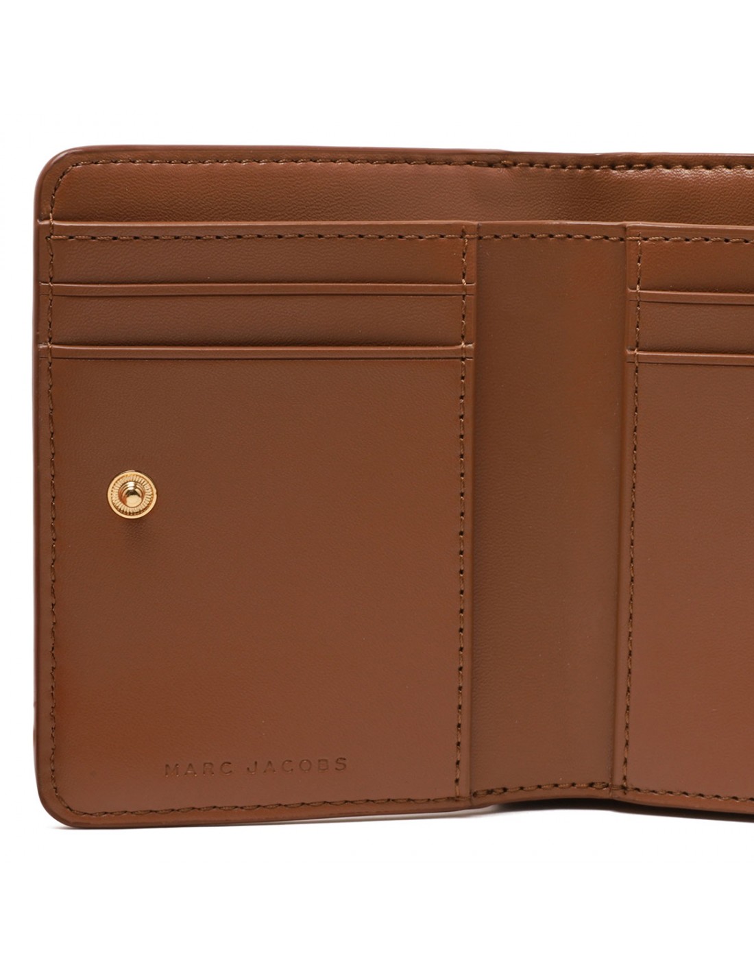 Camel hue pebble leather The mini compact wallet from Marc Jacobs featuring logo embossed, snap closure, two external slip pocket, twill lining, four card slots, one bill sleeve, two interior slip pockets, one coin pouch with double gusset.