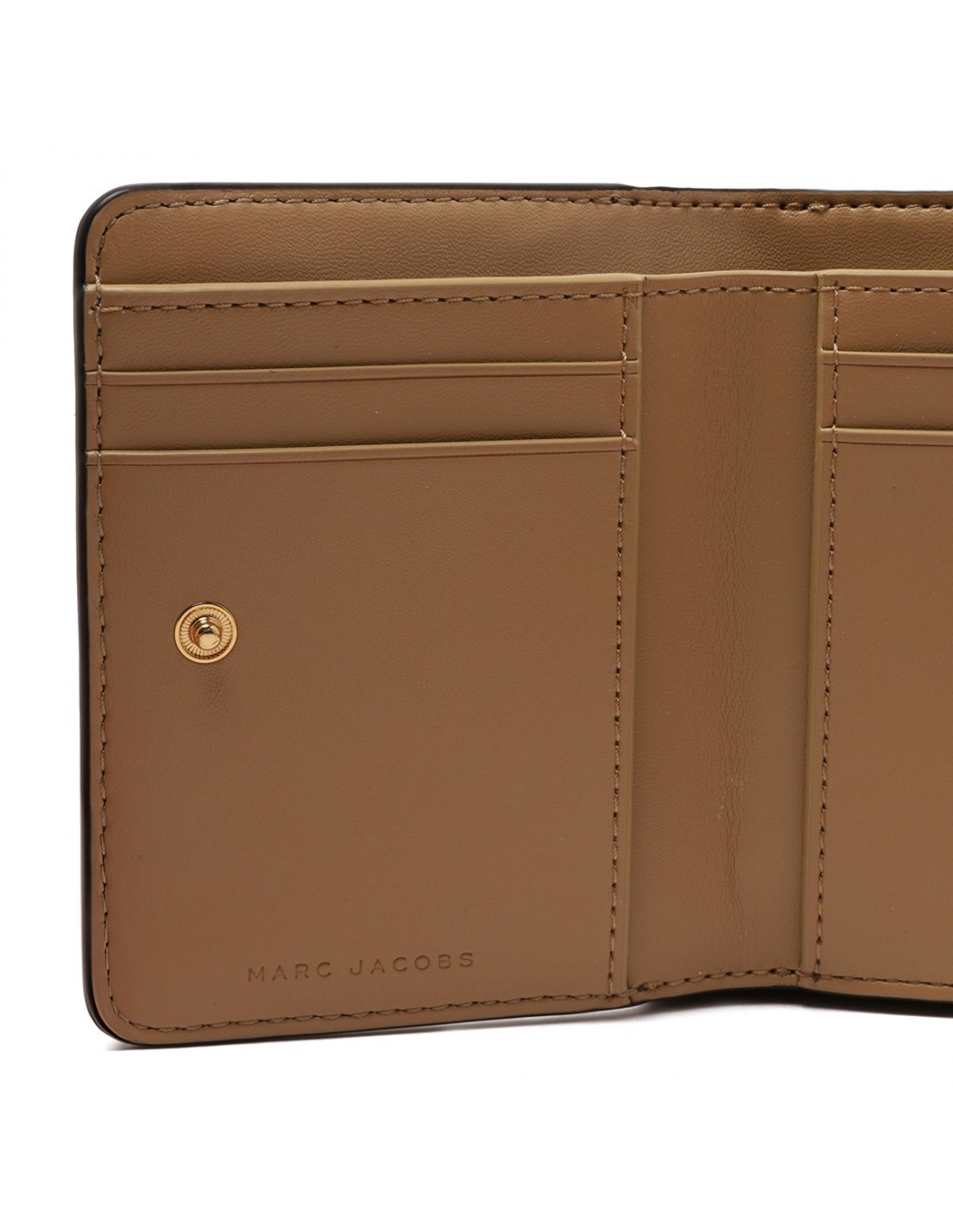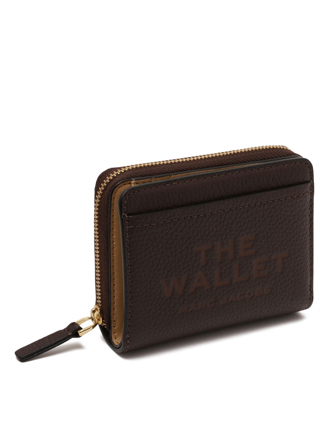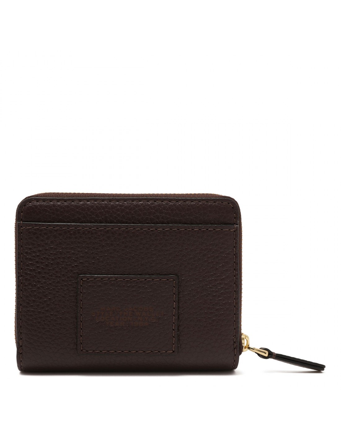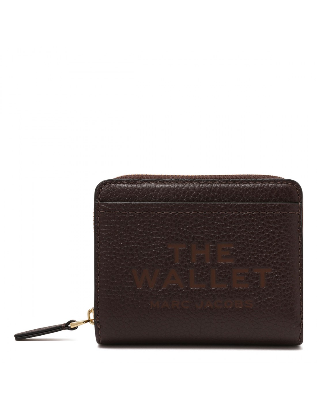 Chocolate brown pebble leather The mini compact wallet from Marc Jacobs featuring logo embossed, snap closure, two external slip pocket, twill lining, four card slots, one bill sleeve, two interior slip pockets, one coin pouch with double gusset.