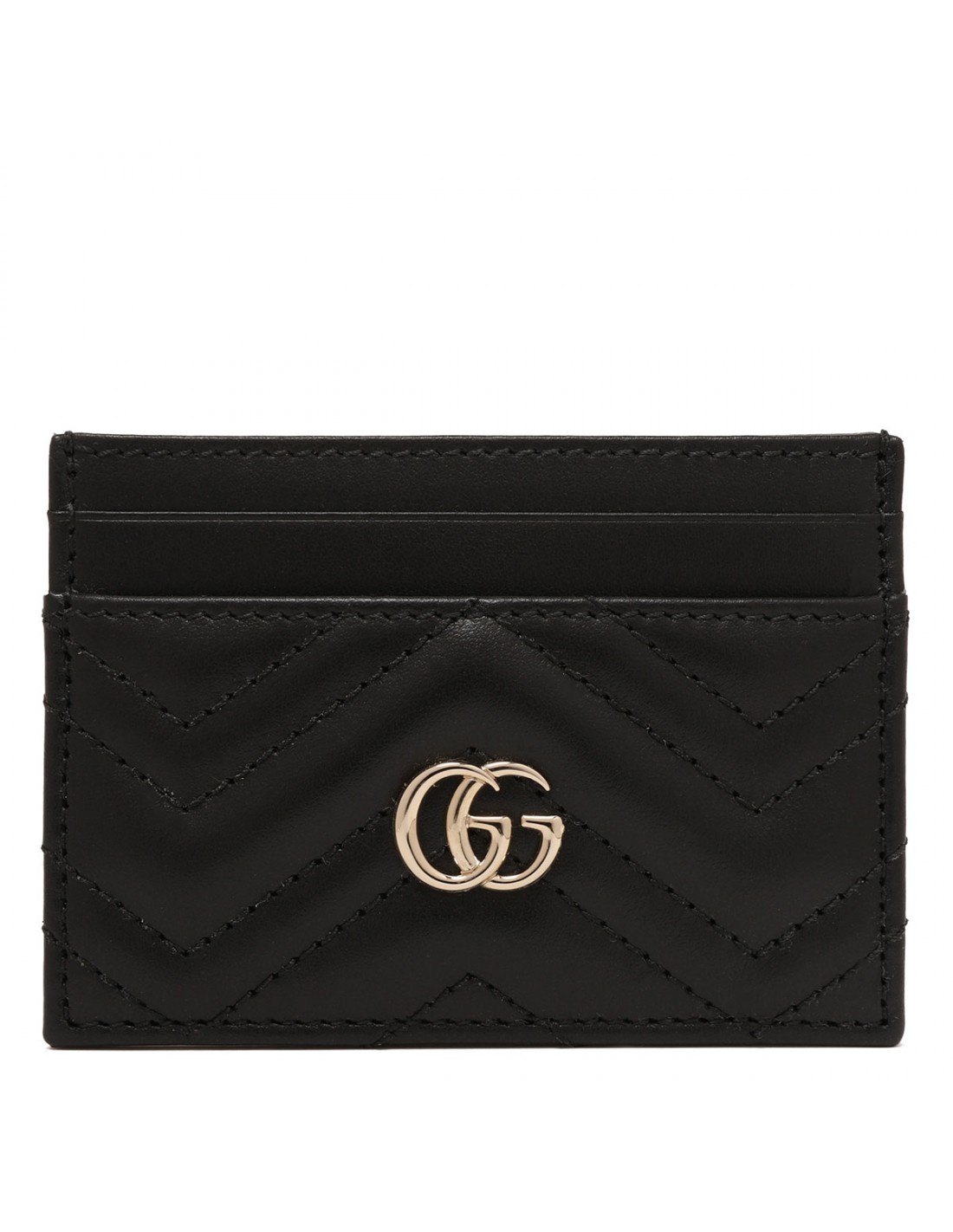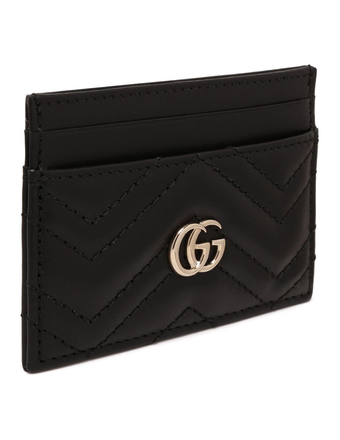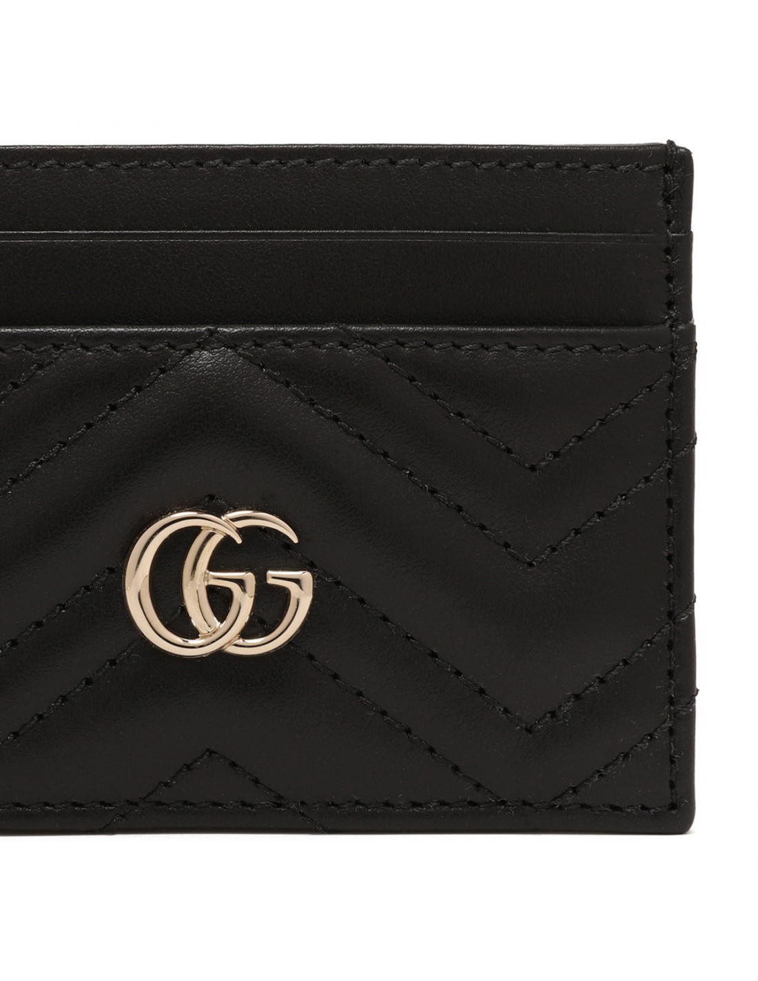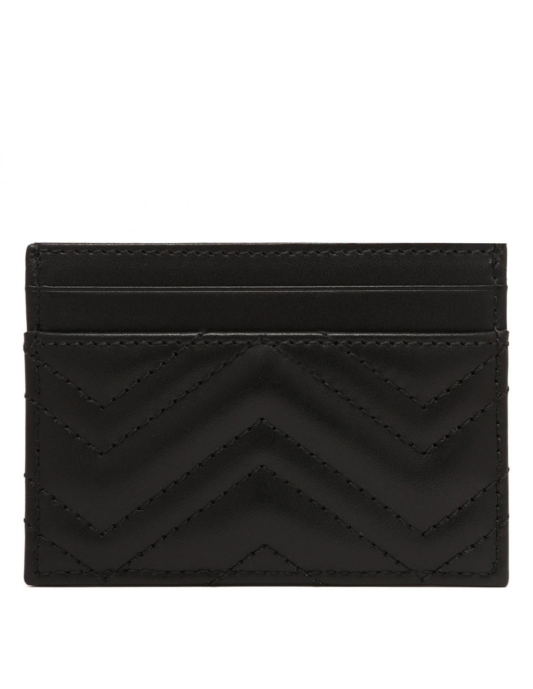 Black matelassé chevron leather GG Marmont card case from Gucci featuring GG on back, double G, internal four card slots, one open compartment.