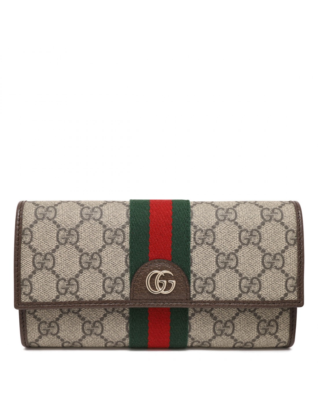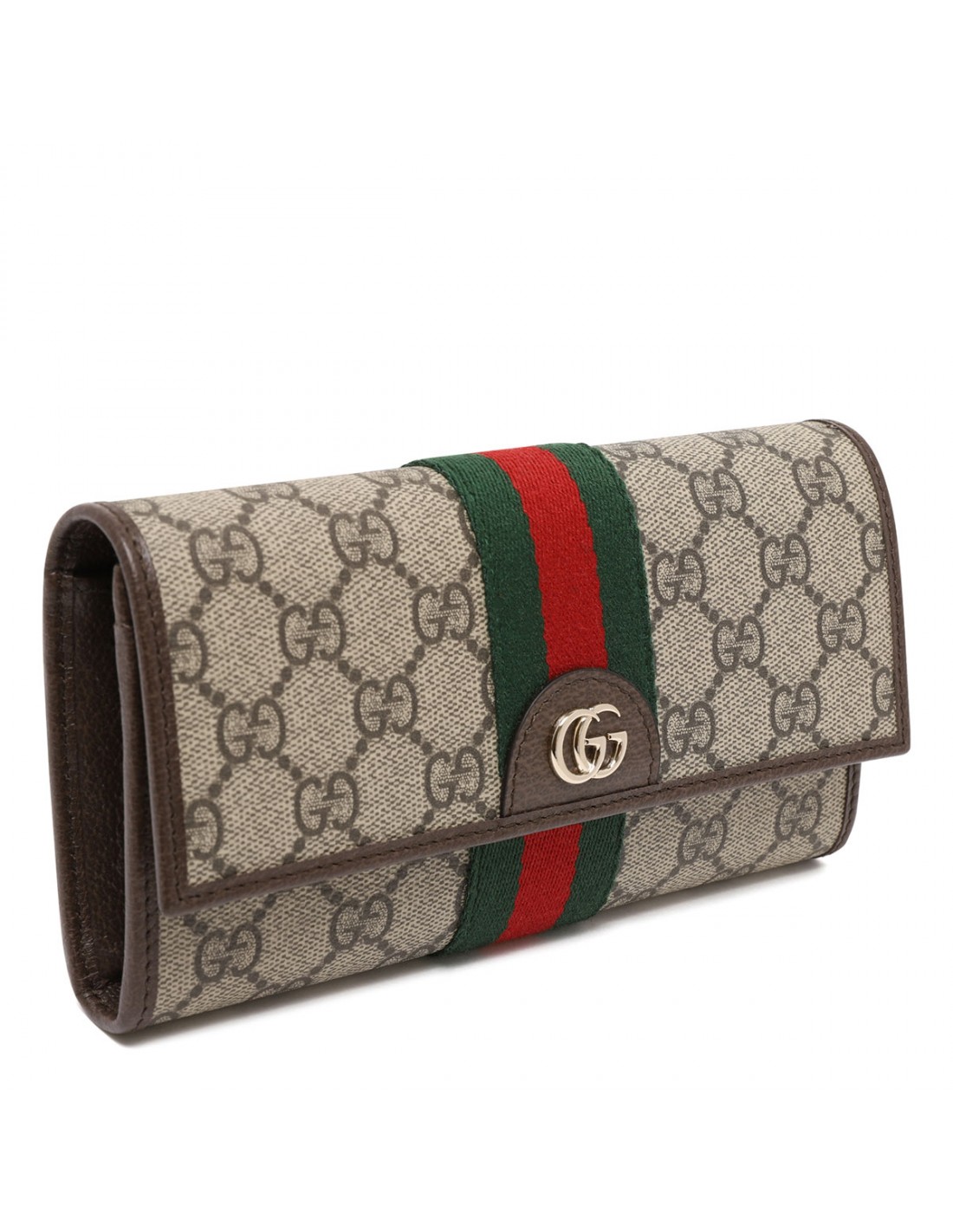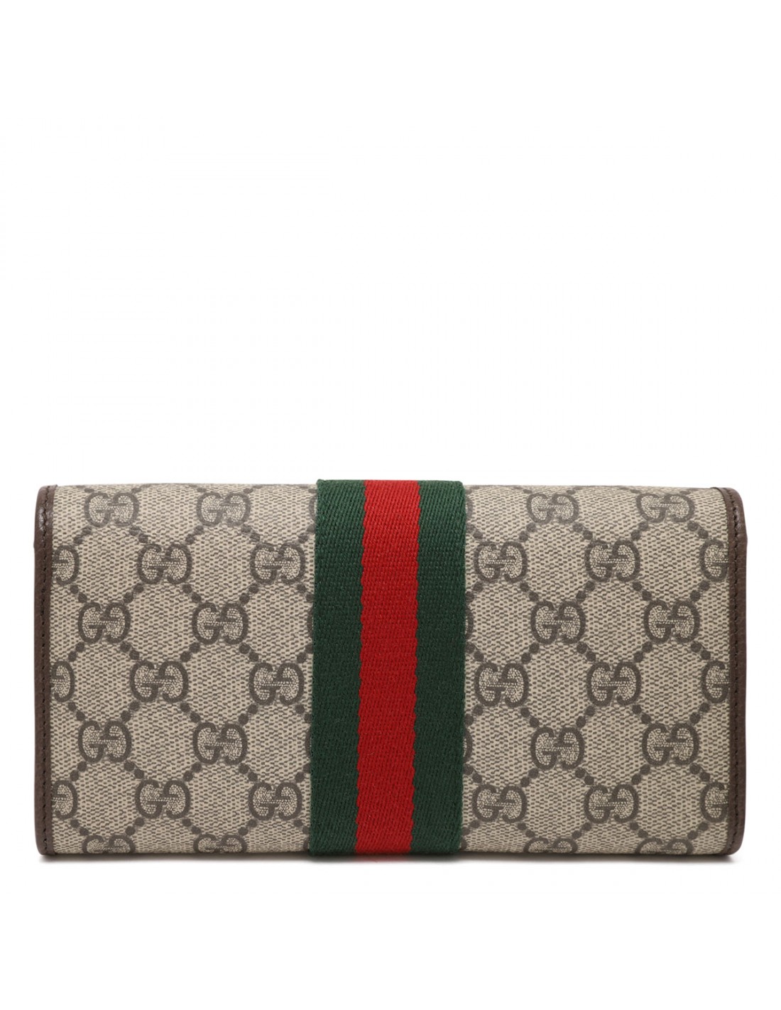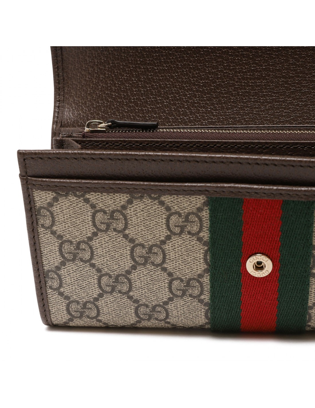 Beige and dark brown soft Supreme canvas Ophidia continental wallet from Gucci featuring GG motif, Web, light gold-toned double G and hardware, brown leather trims, snap button closure, brown taffeta lining, internal twelve card slots, one flat pocket, one zipped pocket.
