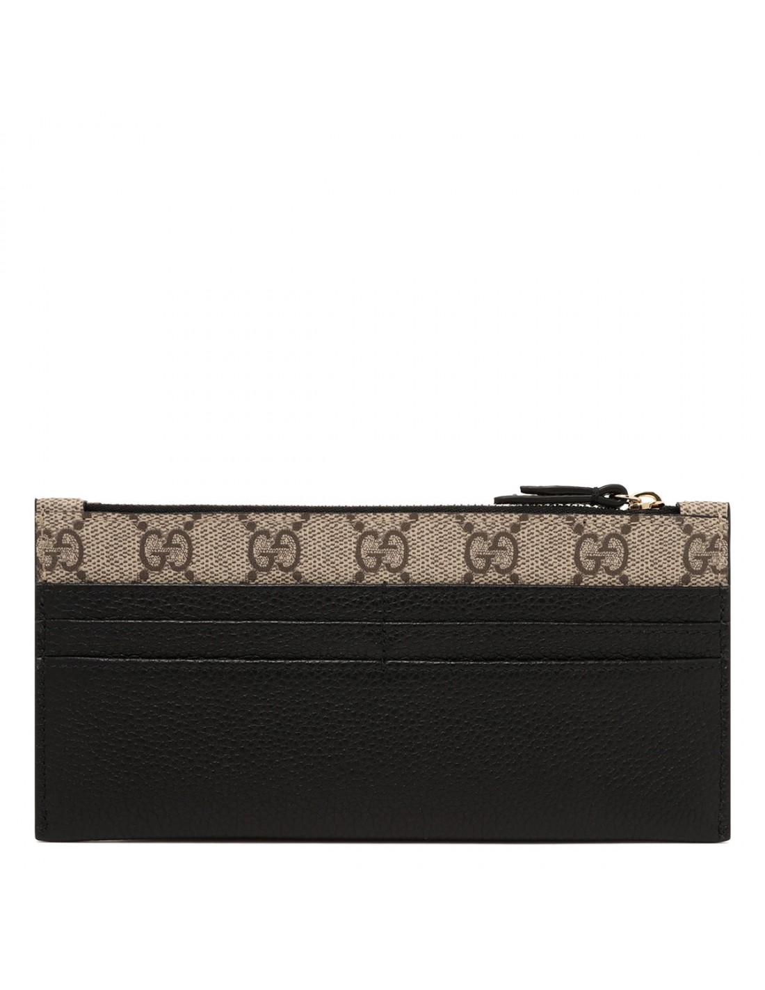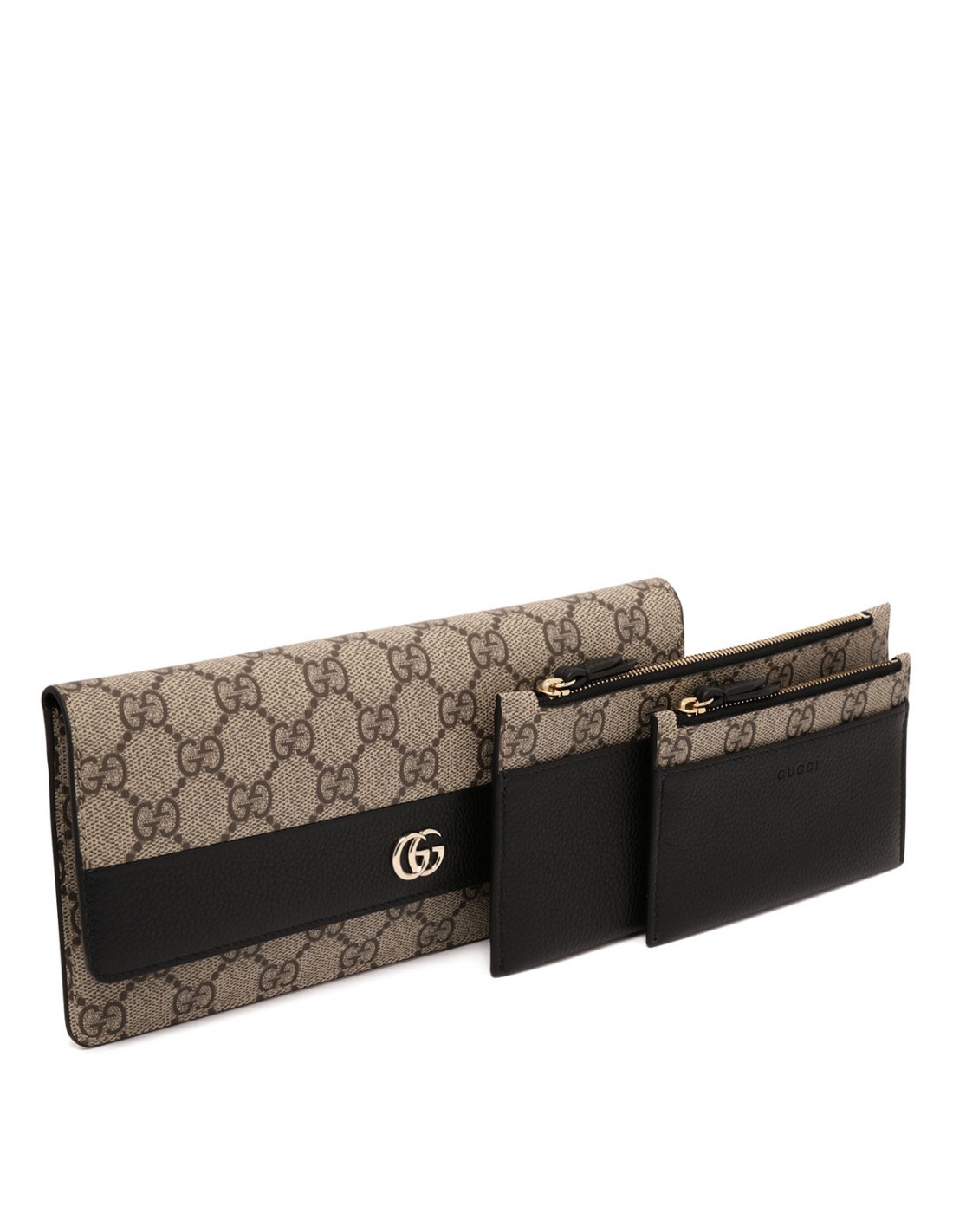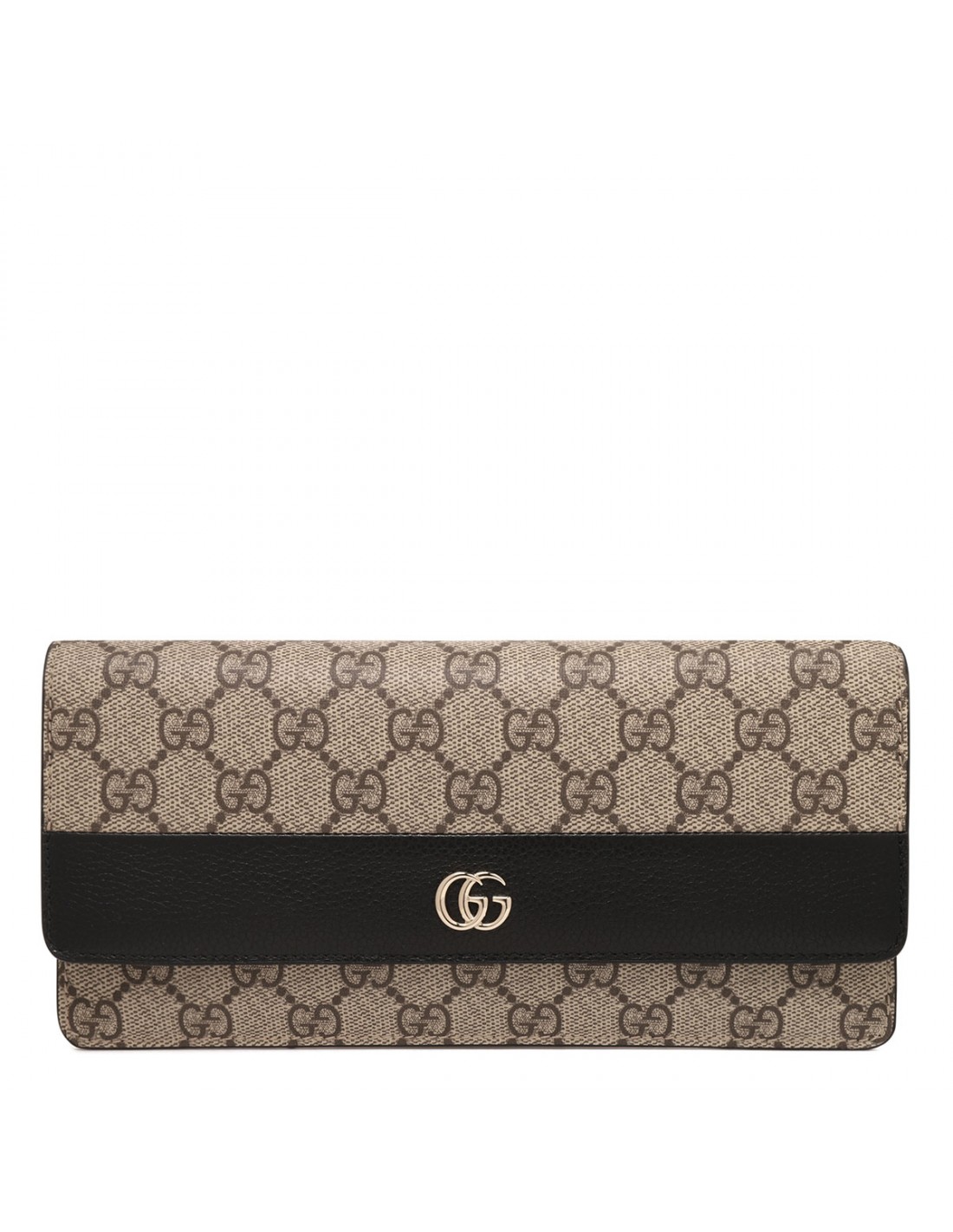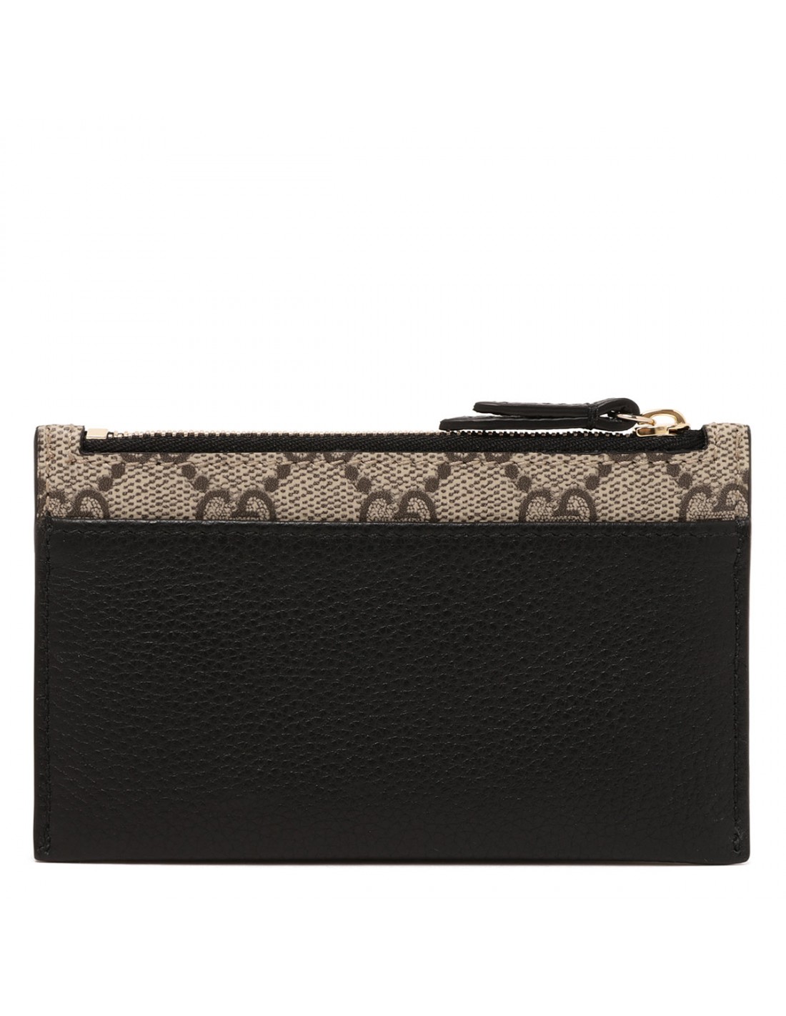 Black leather and beige and dark brown GG Supreme GG Marmont wallet from Gucci featuring light gold-toned double G and hardware, snap button closure, black taffeta lining, two internal zipped pouches.