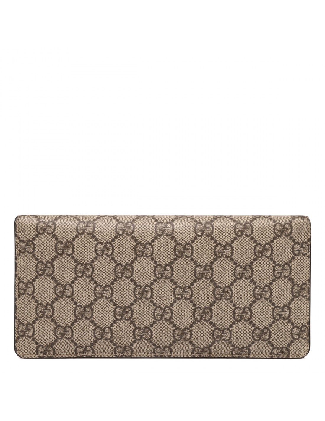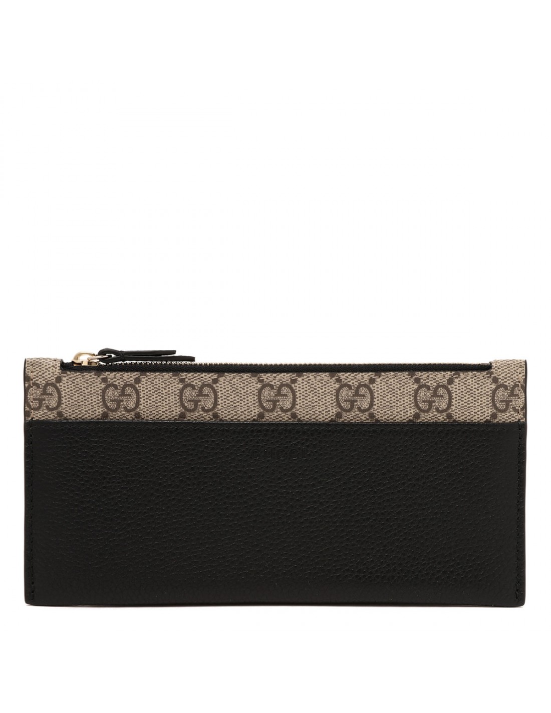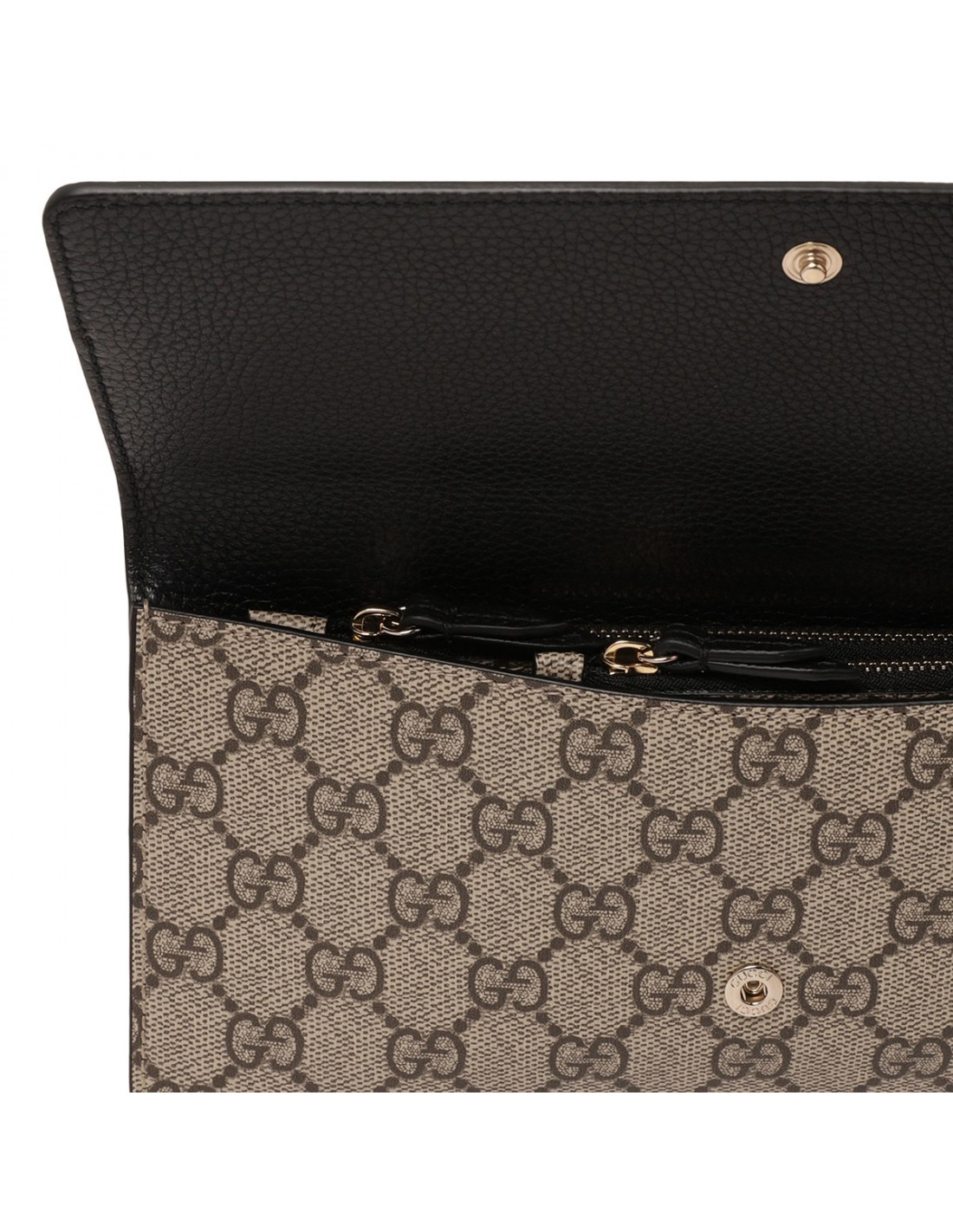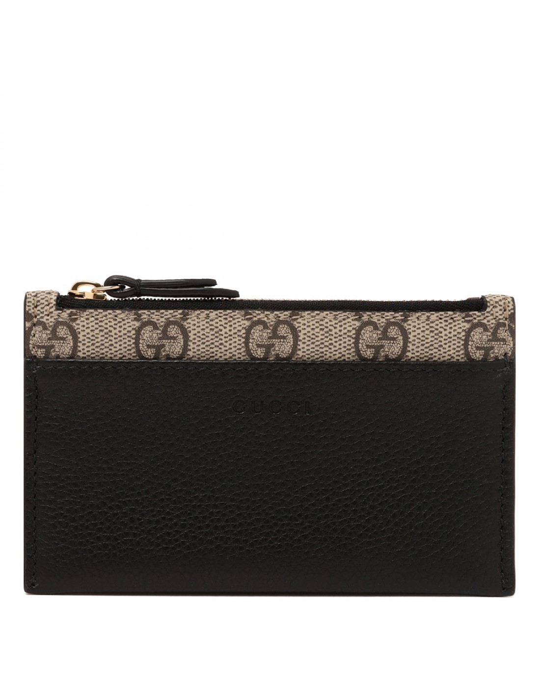 Black leather and beige and dark brown GG Supreme GG Marmont wallet from Gucci featuring light gold-toned double G and hardware, snap button closure, black taffeta lining, two internal zipped pouches.